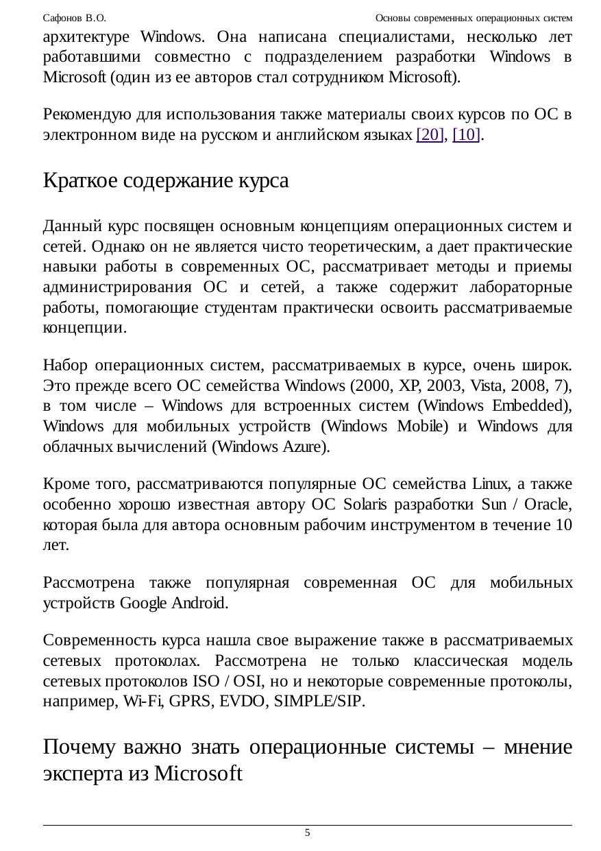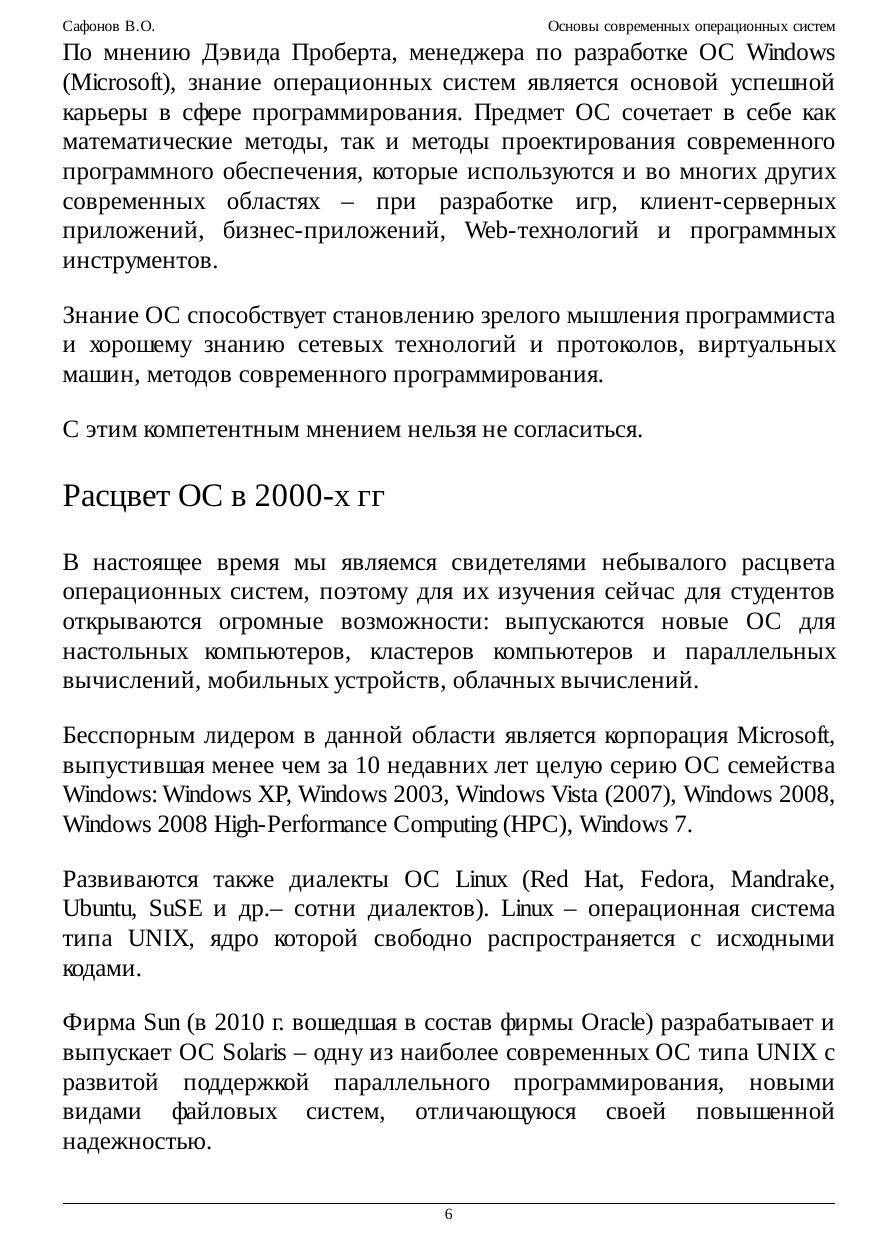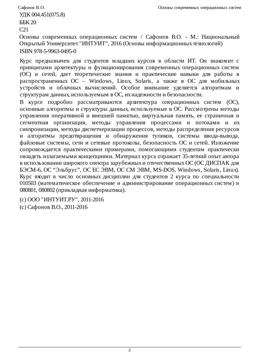Курс предназначен для студентов младших курсов в области ИТ. Он знакомит с принципами архитектуры и функционирования современных операционных систем (ОС) и сетей, дает теоретические знания и практические навыки для работы в распространенных ОС – Windows, Linux, Solaris, а также в ОС для мобильных устройств и облачных вычислений. Особое внимание уделяется алгоритмам и структурам данных, используемым в ОС, их надежности и безопасности. В курсе подробно рассматриваются архитектура операционных систем (ОС), основные алгоритмы и структуры данных, используемые в ОС. Рассмотрены методы управления оперативной и внешней памятью, виртуальная память, ее страничная и сегментная организация, методы управления процессами и потоками и их синхронизации, методы диспетчеризации процессов, методы распределения ресурсов и алгоритмы предотвращения и обнаружения тупиков, системы ввода-вывода, файловые системы, сети и сетевые протоколы, безопасность ОС и сетей. Изложение сопровождается практическими примерами, помогающими студентам практически овладеть излагаемыми концепциями. Материал курса отражает 35-летний опыт автора в использовании широкого спектра зарубежных и отечественных ОС (ОС ДИСПАК для БЭСМ-6, ОС “Эльбрус”, ОС ЕС ЭВМ, ОС СМ ЭВМ, MS-DOS, Windows, Solaris, Linux). Курс входит в число основных дисциплин для студентов 2 курса по специальности 010503 (математическое обеспечение и администрирование операционных систем) и 080801, 080802 (прикладная информатика).