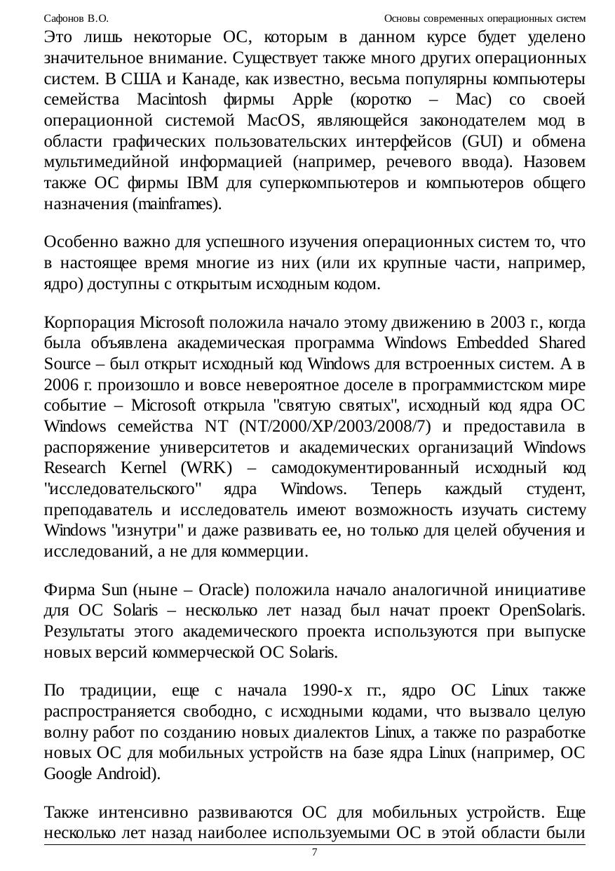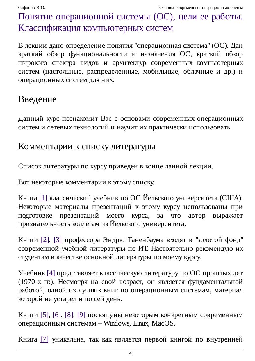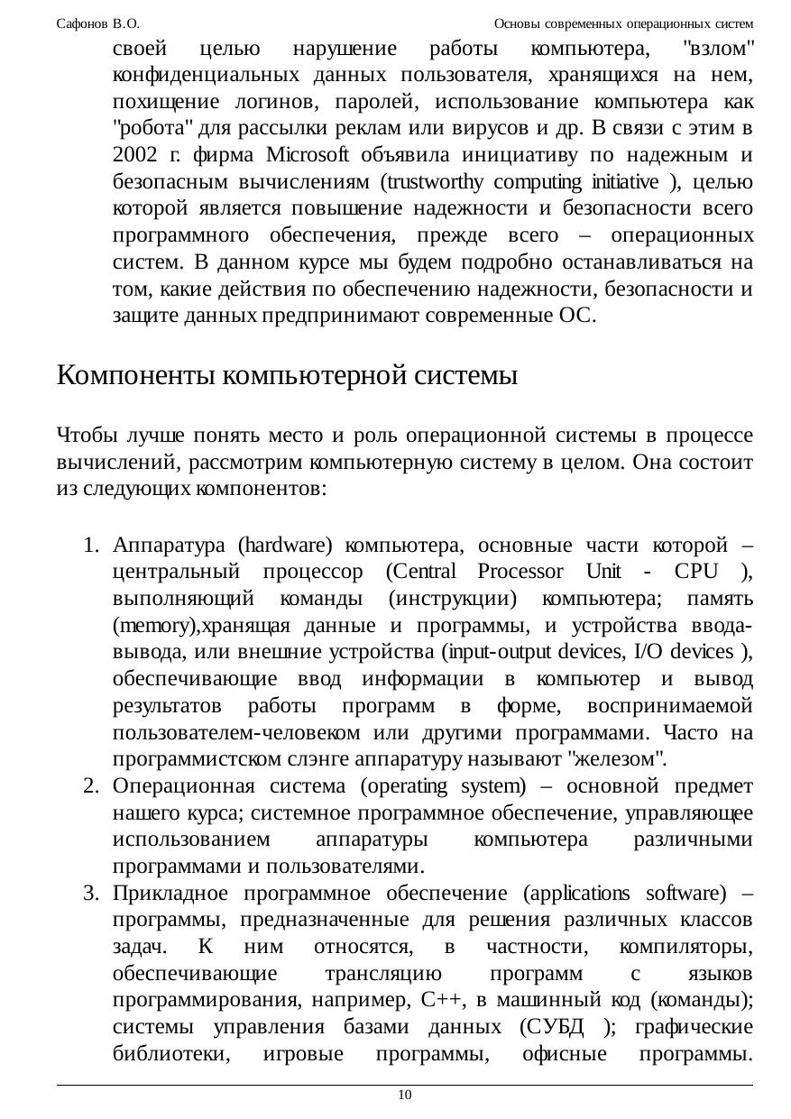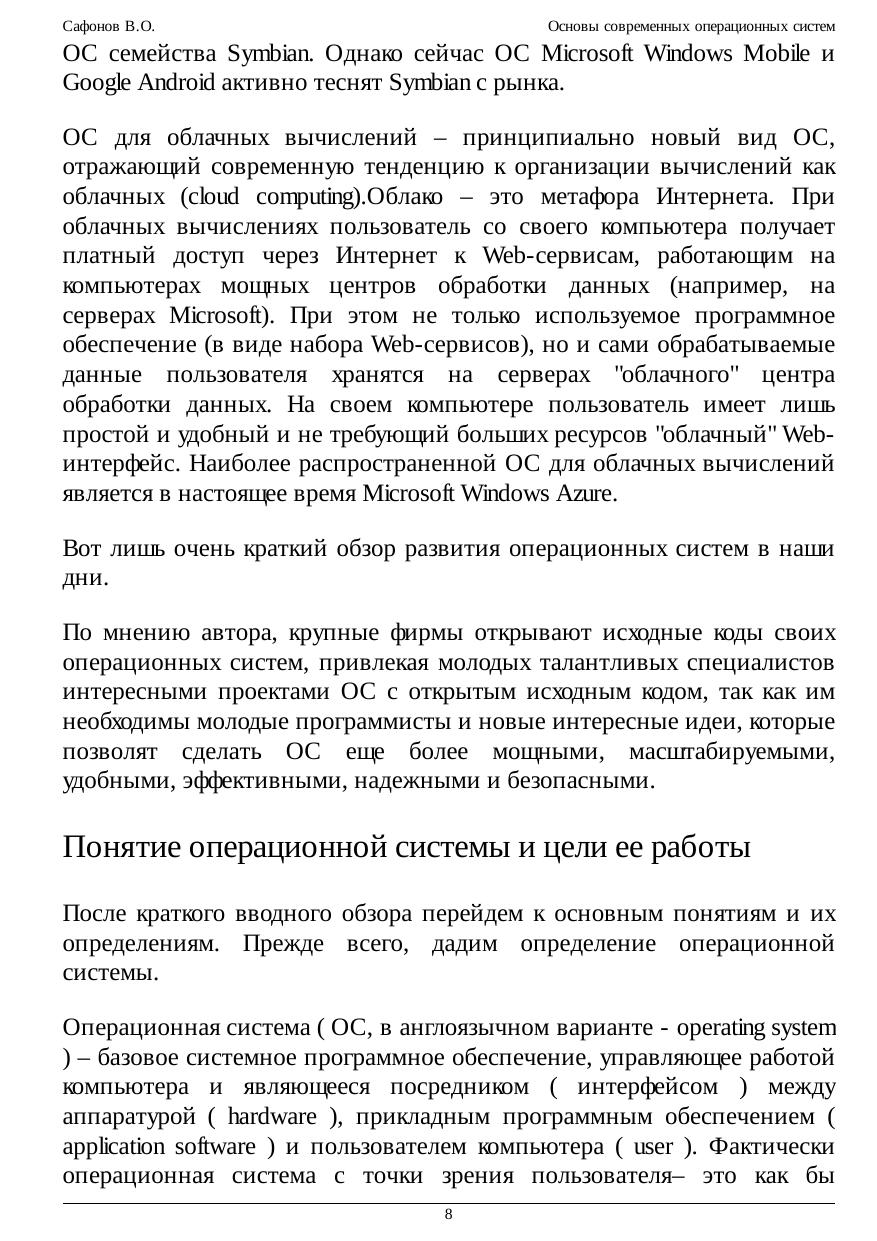 Курс предназначен для студентов младших курсов в области ИТ. Он знакомит с принципами архитектуры и функционирования современных операционных систем (ОС) и сетей, дает теоретические знания и практические навыки для работы в распространенных ОС – Windows, Linux, Solaris, а также в ОС для мобильных устройств и облачных вычислений. Особое внимание уделяется алгоритмам и структурам данных, используемым в ОС, их надежности и безопасности. В курсе подробно рассматриваются архитектура операционных систем (ОС), основные алгоритмы и структуры данных, используемые в ОС. Рассмотрены методы управления оперативной и внешней памятью, виртуальная память, ее страничная и сегментная организация, методы управления процессами и потоками и их синхронизации, методы диспетчеризации процессов, методы распределения ресурсов и алгоритмы предотвращения и обнаружения тупиков, системы ввода-вывода, файловые системы, сети и сетевые протоколы, безопасность ОС и сетей. Изложение сопровождается практическими примерами, помогающими студентам практически овладеть излагаемыми концепциями. Материал курса отражает 35-летний опыт автора в использовании широкого спектра зарубежных и отечественных ОС (ОС ДИСПАК для БЭСМ-6, ОС “Эльбрус”, ОС ЕС ЭВМ, ОС СМ ЭВМ, MS-DOS, Windows, Solaris, Linux). Курс входит в число основных дисциплин для студентов 2 курса по специальности 010503 (математическое обеспечение и администрирование операционных систем) и 080801, 080802 (прикладная информатика).