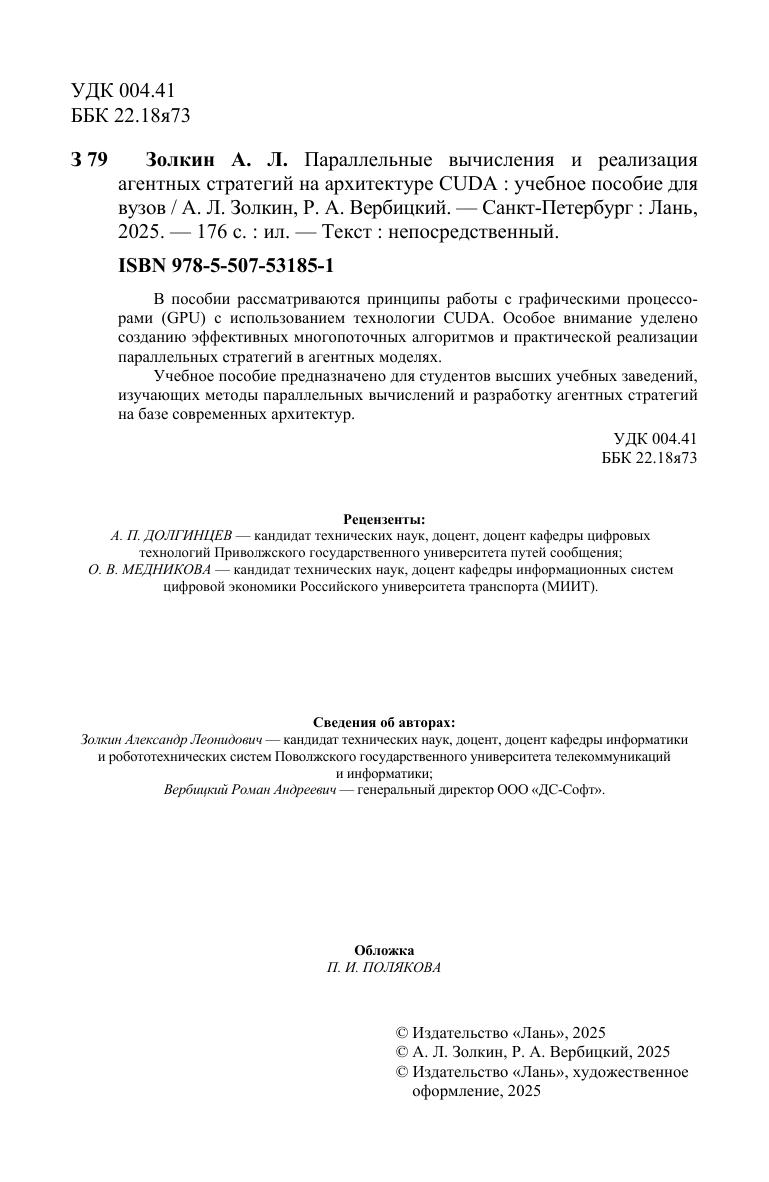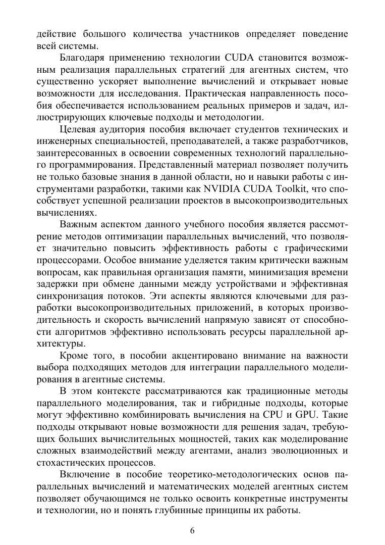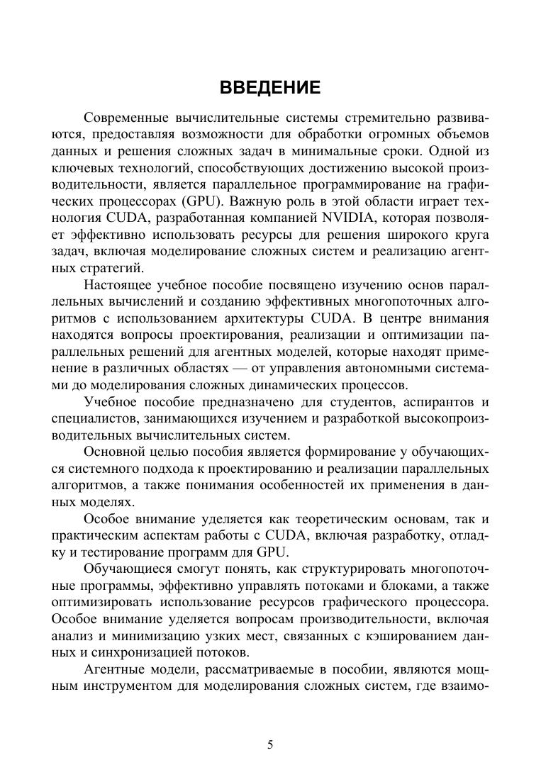 В пособии рассматриваются принципы работы с графическими процессорами (GPU) с использованием технологии CUDA. Особое внимание уделено созданию эффективных многопоточных алгоритмов и практической реализации параллельных стратегий в агентных моделях. Учебное пособие предназначено для студентов высших учебных заведений, изучающих методы параллельных вычислений и разработку агентных стратегий на базе современных архитектур.