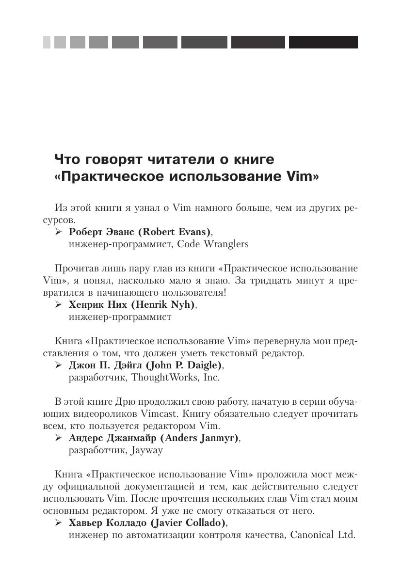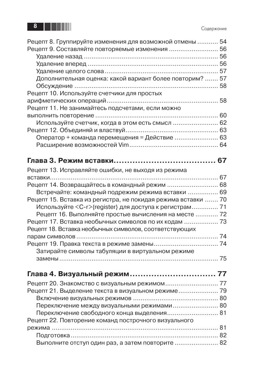 Vim – быстрый и эффективный текстовый редактор, способный повысить скорость и эффективность разработки. С помощью более чем 100 рецептов вы быстро освоите основные возможности Vim и сможете заняться решением своих самых необычных задач, связанных с созданием и правкой текста. В данной книге вы найдете новые и эффективные приемы работы с редактором независимо от того, являетесь ли вы начинающим или опытным пользователем Vim. В обновленном издании исправлены ошибки и добавлены новые рецепты, использующие улучшенные возможности, появившиеся в версии Vim 7.4.110. Книга предназначена для всех пользователей Vim – как начинающих, так и опытных.