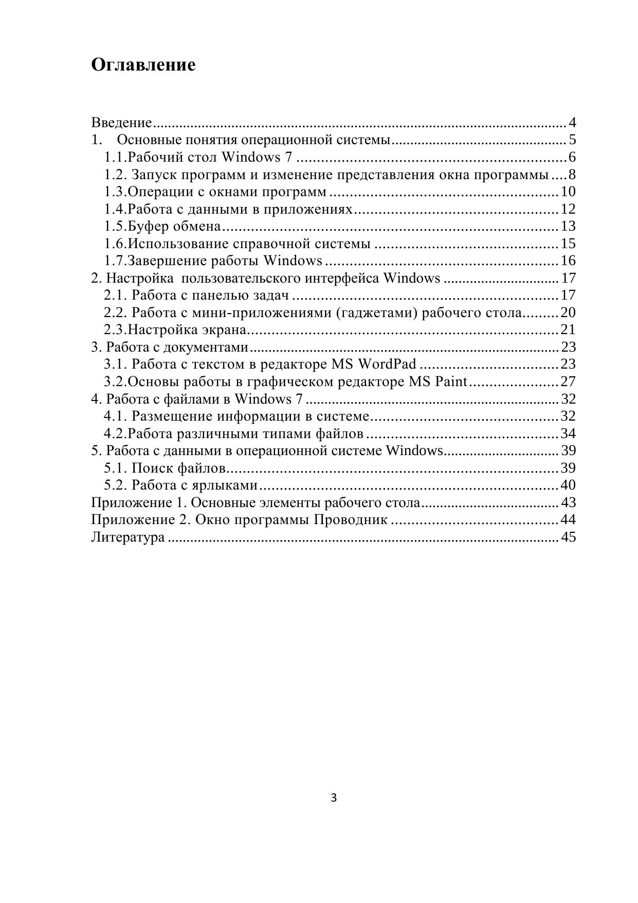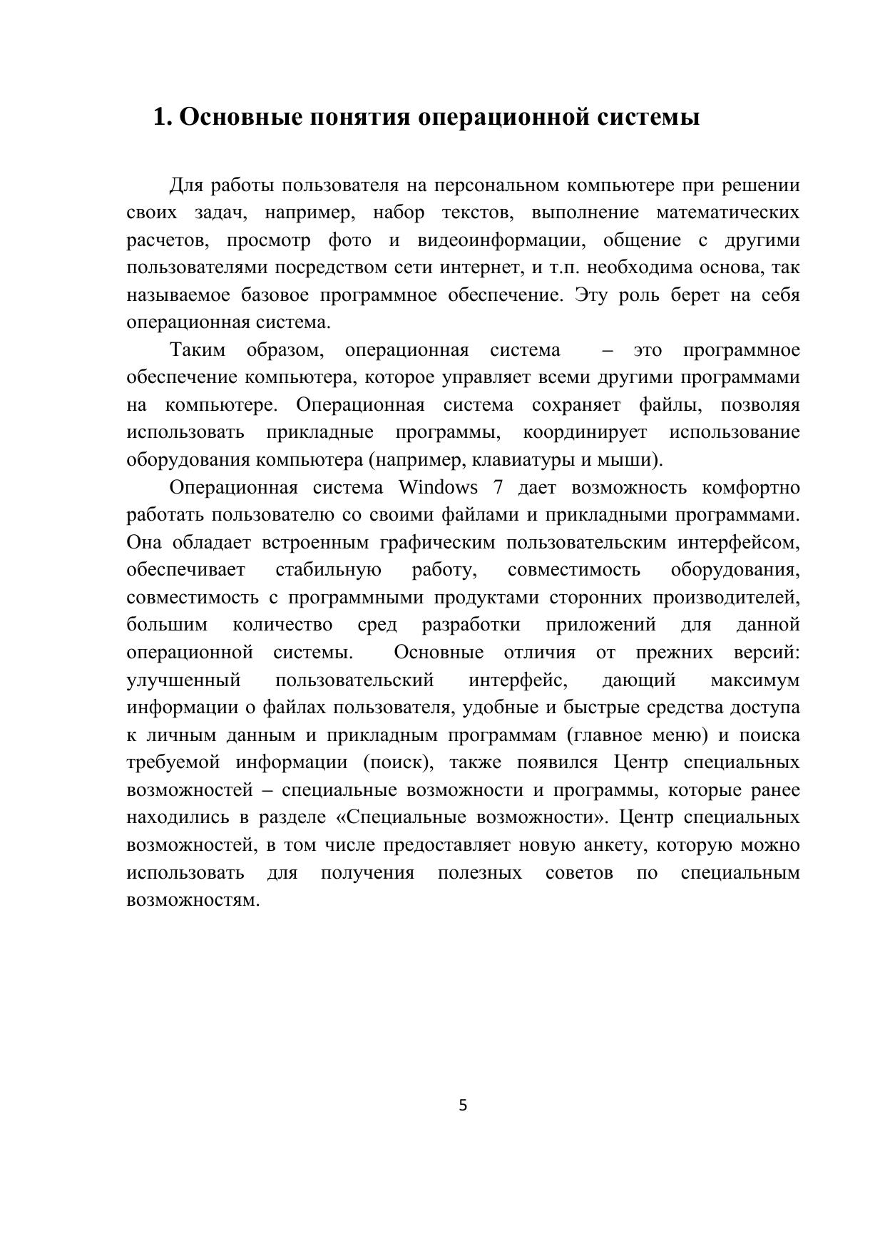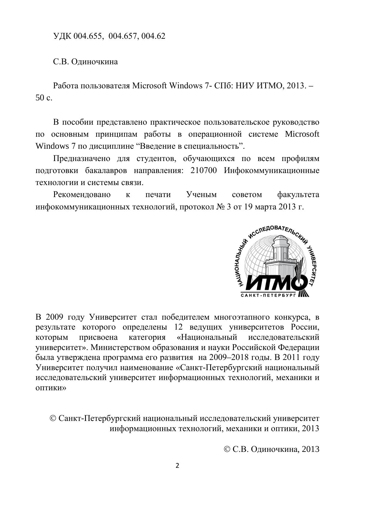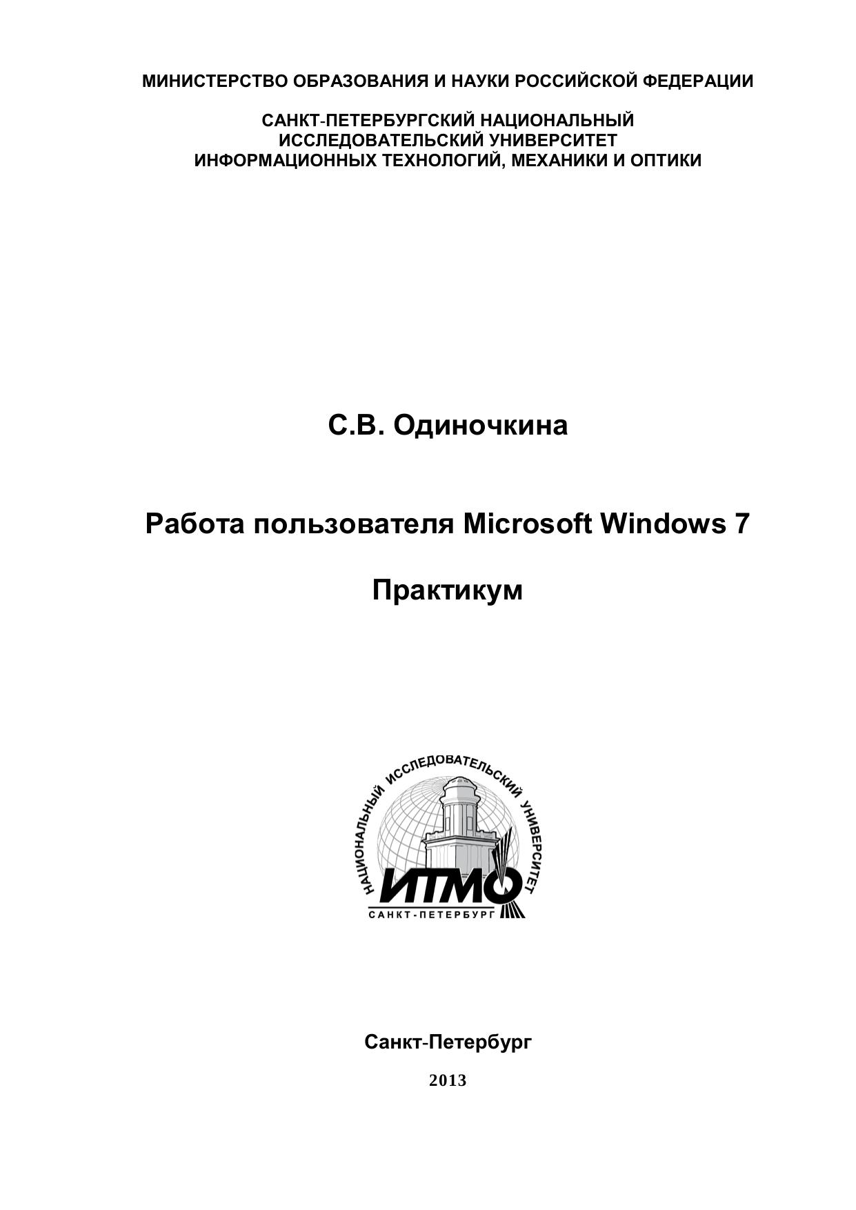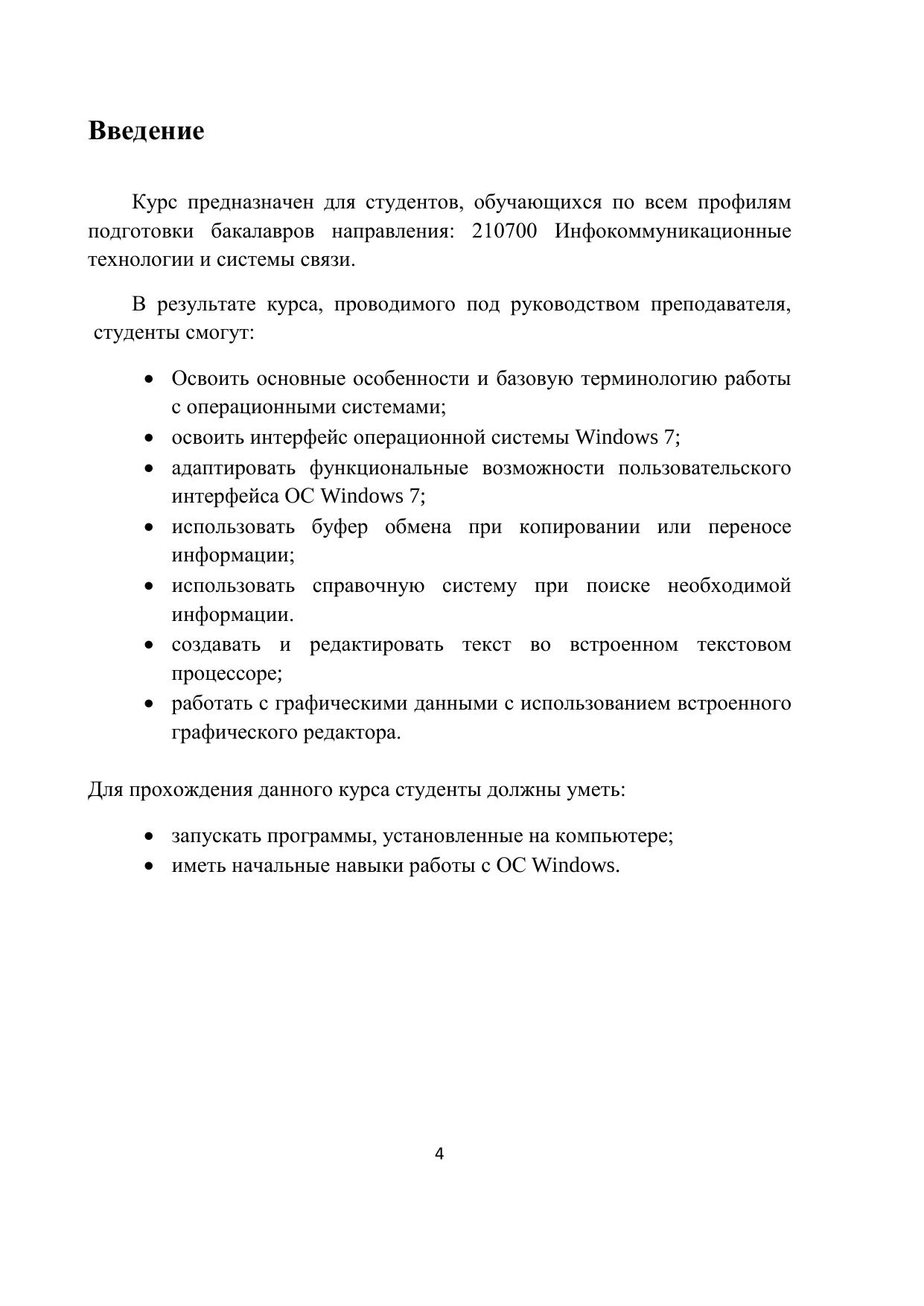 В пособии представлено практическое пользовательское руководство по основным принципам работы в операционной системе Microsoft Windows 7 по дисциплине “Введение в специальность”.