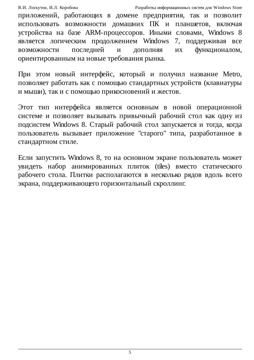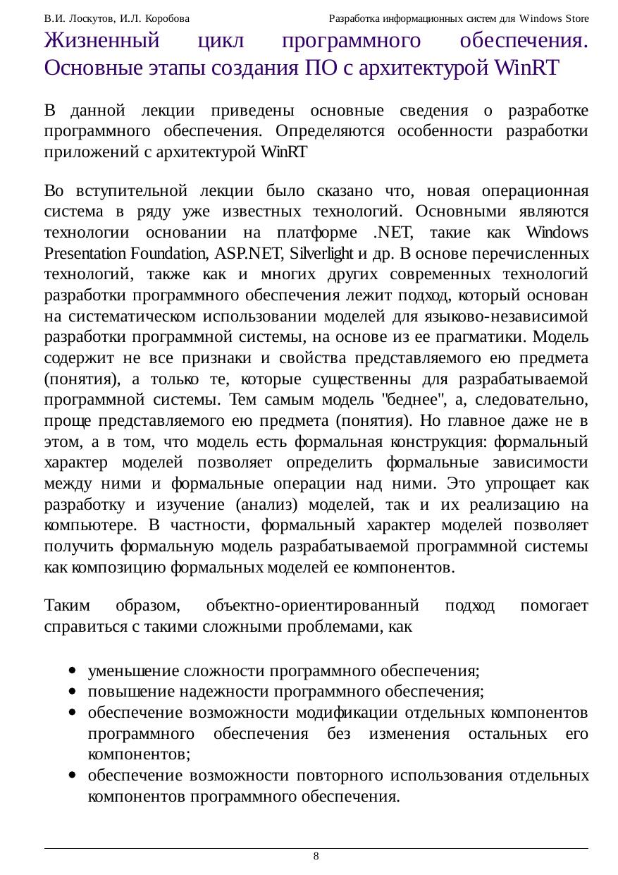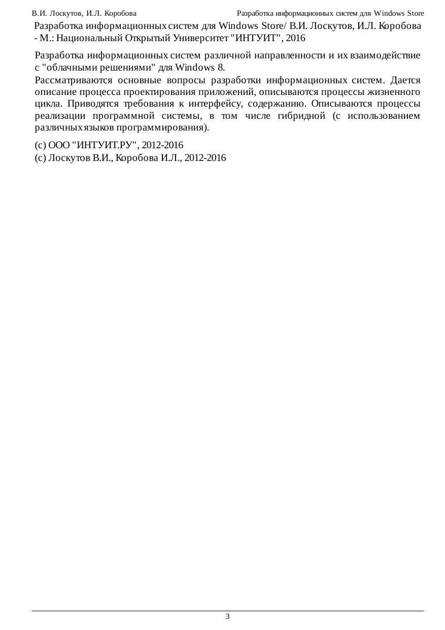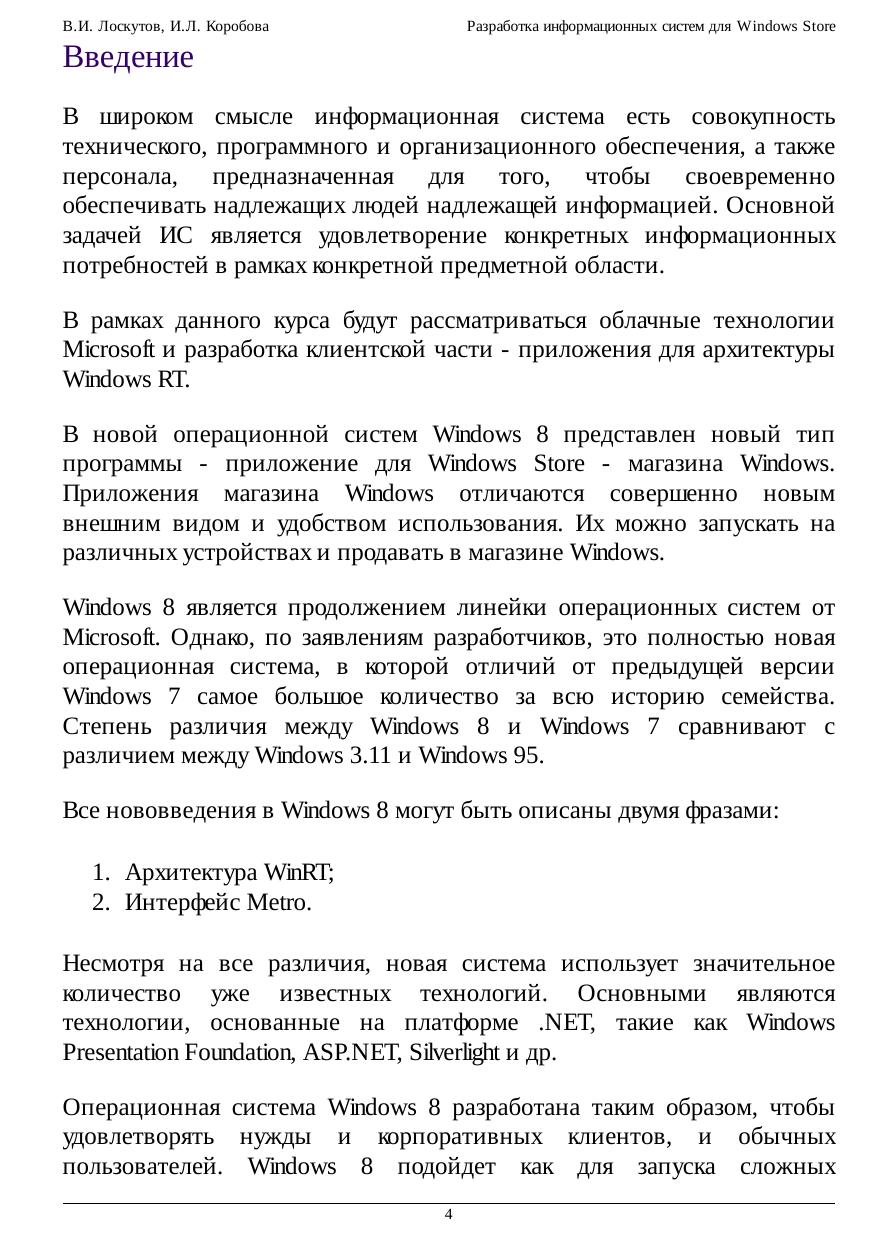 Разработка информационных систем различной направленности и их взаимодействие с "облачными решениями" для Windows 8. Рассматриваются основные вопросы разработки информационных систем. Дается описание процесса проектирования приложений, описываются процессы жизненного цикла. Приводятся требования к интерфейсу, содержанию. Описываются процессы реализации программной системы, в том числе гибридной (с использованием различных языков программирования).