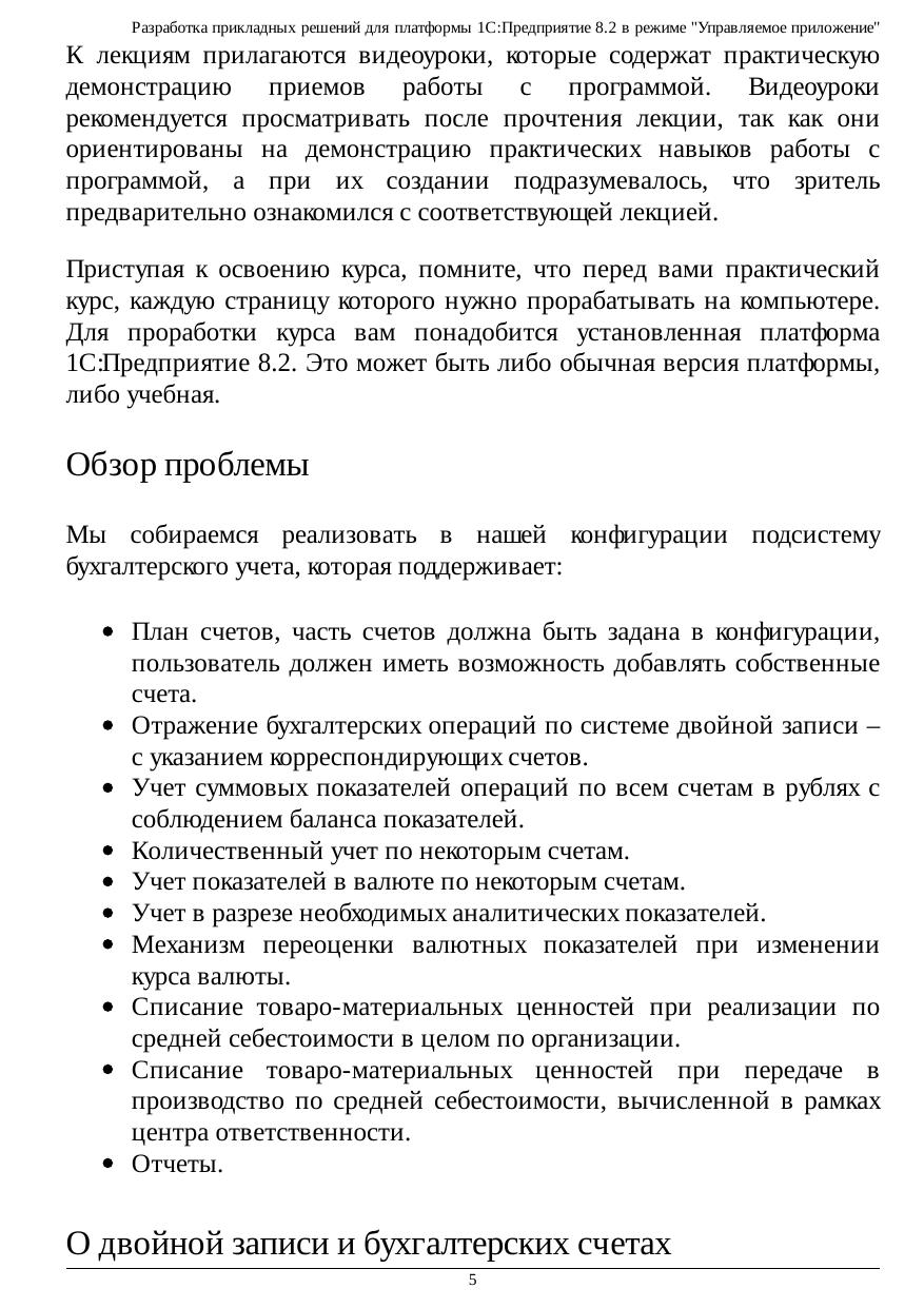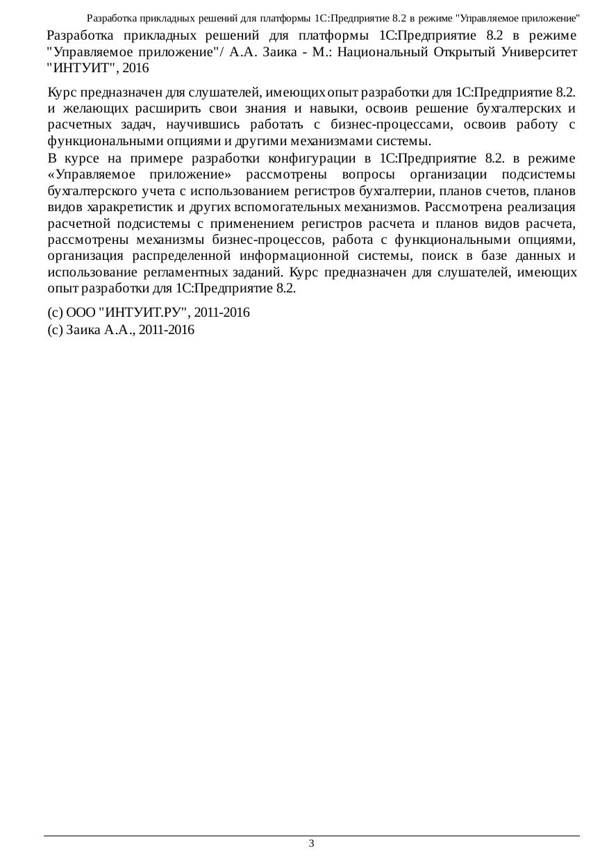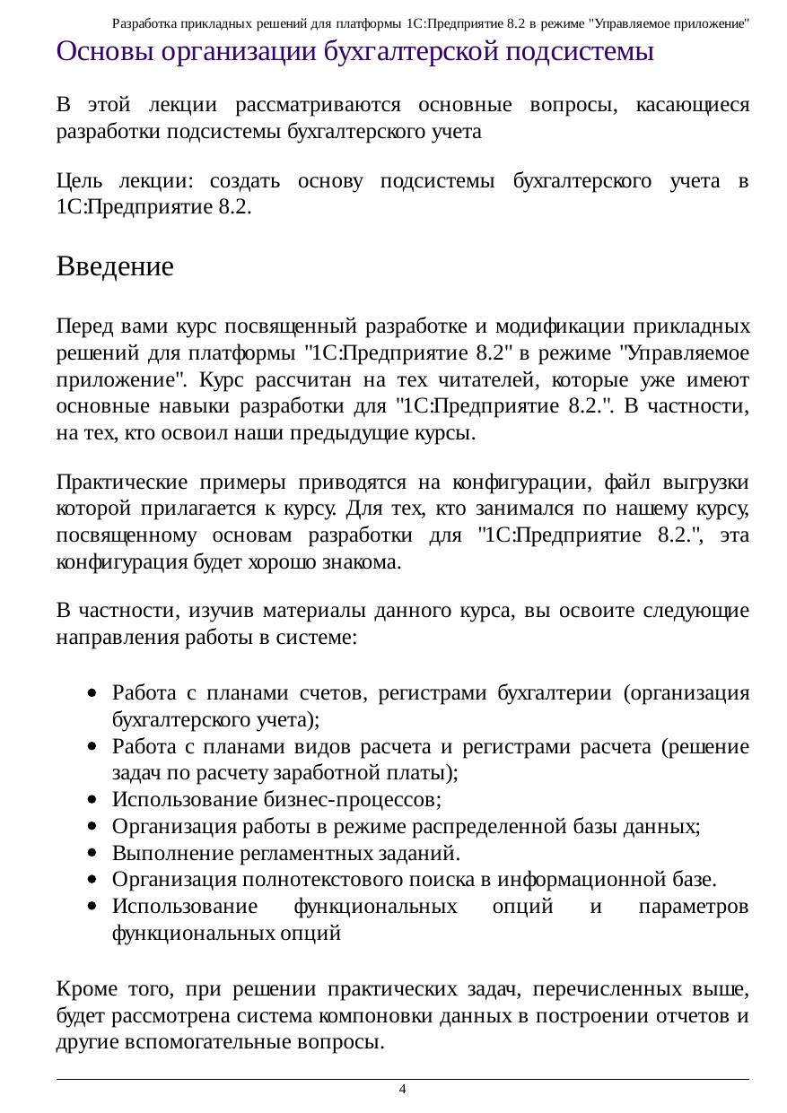 Курс предназначен для слушателей, имеющих опыт разработки для 1С:Предприятие 8.2. и желающих расширить свои знания и навыки, освоив решение бухгалтерских и расчетных задач, научившись работать с бизнес-процессами, освоив работу с функциональными опциями и другими механизмами системы. В курсе на примере разработки конфигурации в 1С:Предприятие 8.2. в режиме «Управляемое приложение» рассмотрены вопросы организации подсистемы бухгалтерского учета с использованием регистров бухгалтерии, планов счетов, планов видов харакретистик и других вспомогательных механизмов. Рассмотрена реализация расчетной подсистемы с применением регистров расчета и планов видов расчета, рассмотрены механизмы бизнес-процессов, работа с функциональными опциями, организация распределенной информационной системы, поиск в базе данных и использование регламентных заданий. Курс предназначен для слушателей, имеющих опыт разработки для 1С:Предприятие 8.2.