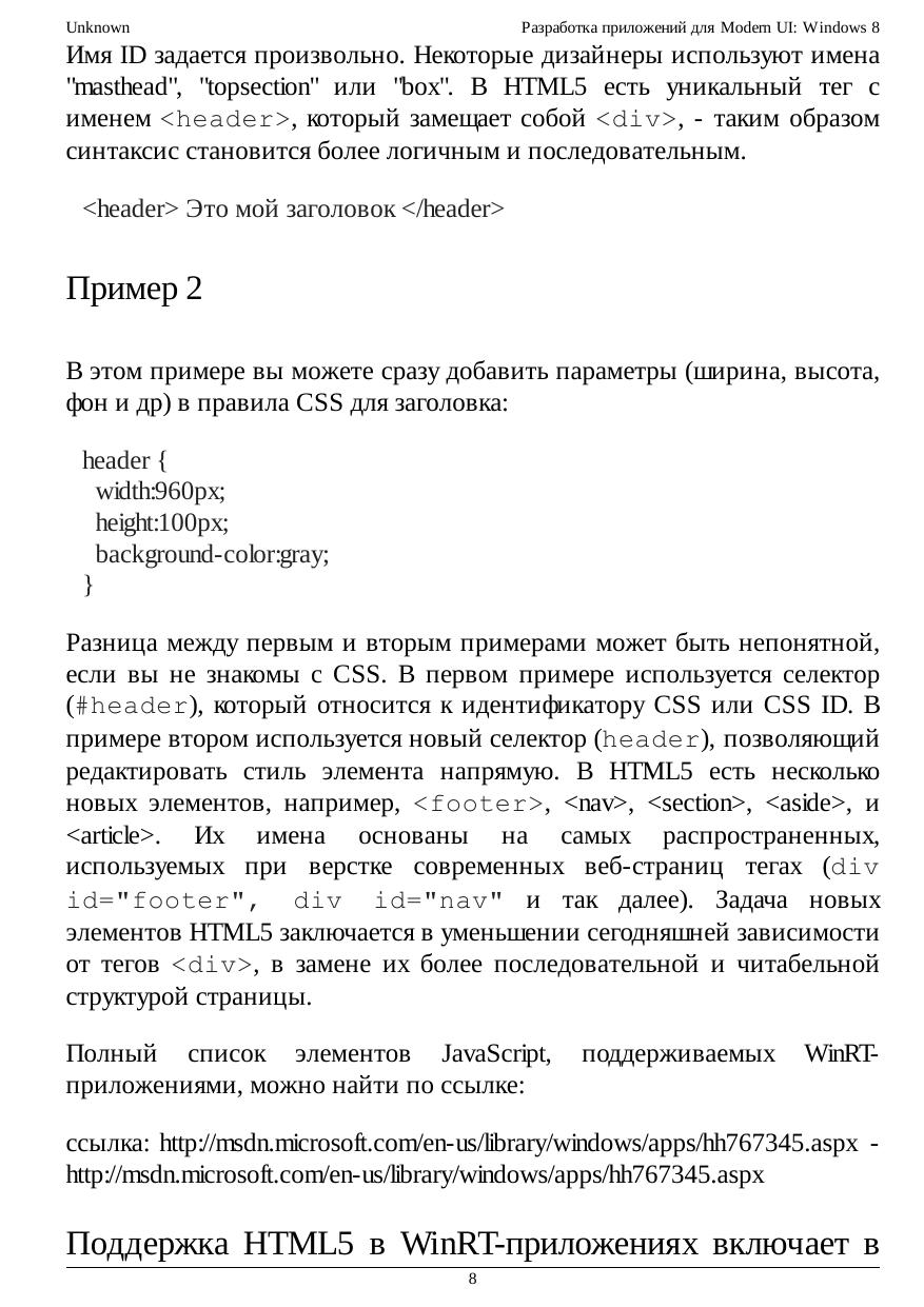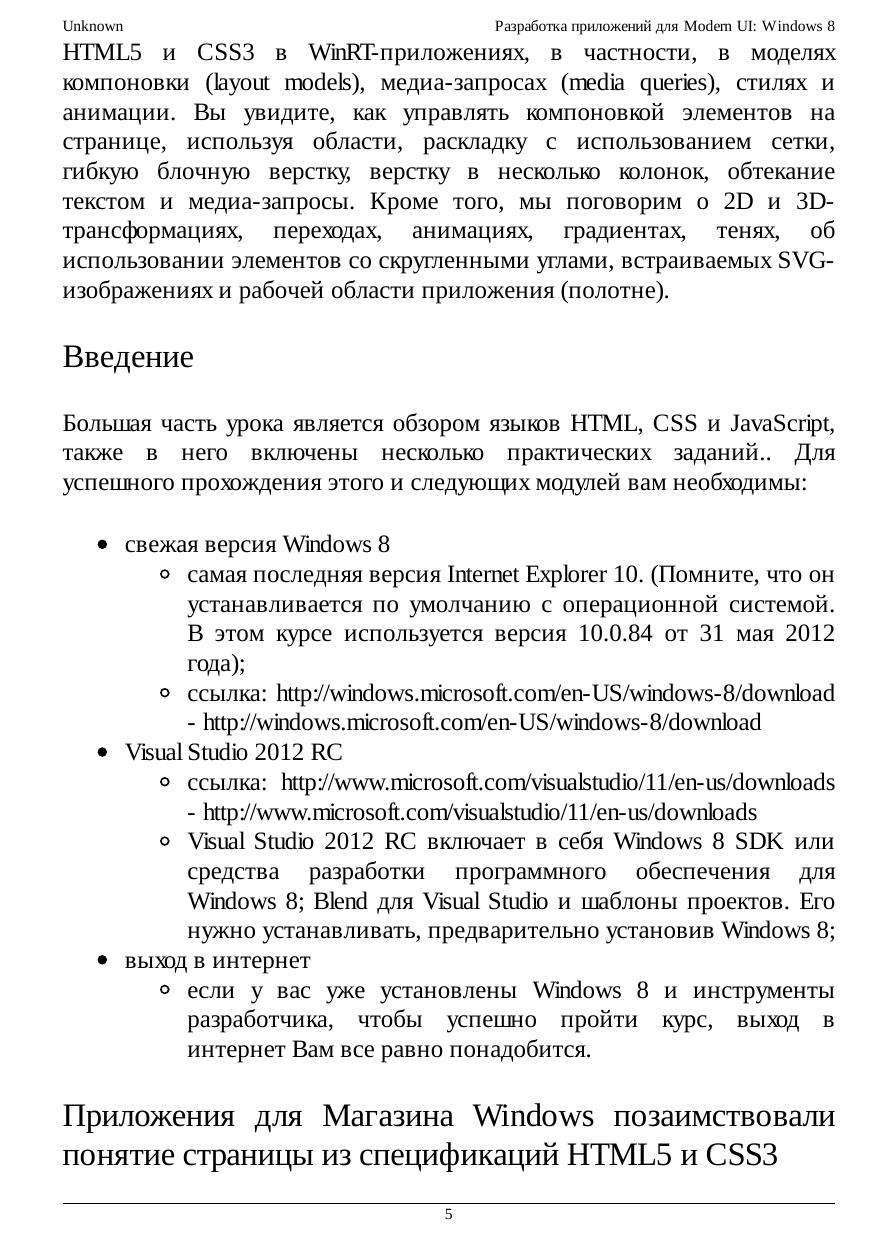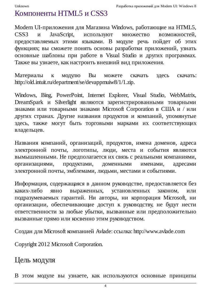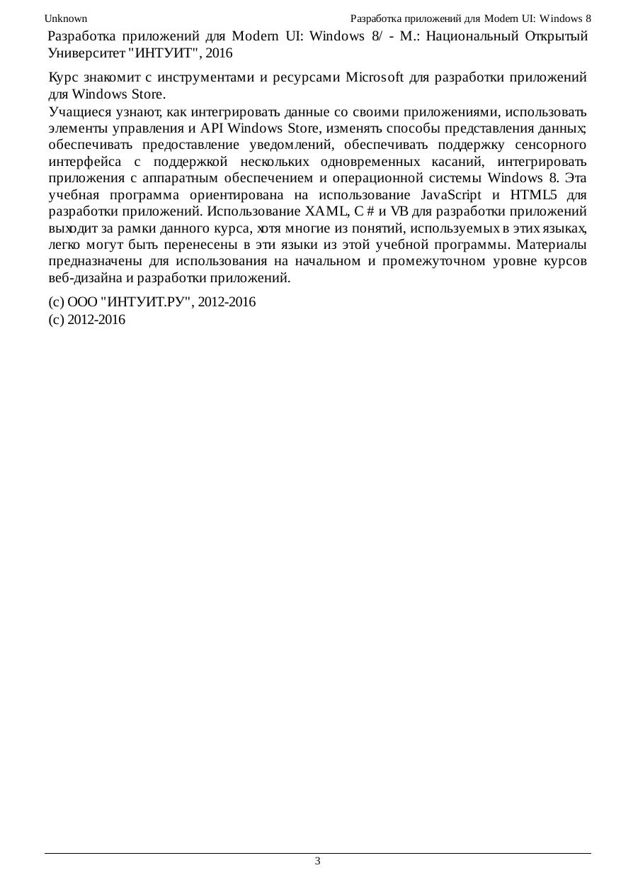 Курс знакомит с инструментами и ресурсами Microsoft для разработки приложений для Windows Store. Учащиеся узнают, как интегрировать данные со своими приложениями, использовать элементы управления и API Windows Store, изменять способы представления данных; обеспечивать предоставление уведомлений, обеспечивать поддержку сенсорного интерфейса с поддержкой нескольких одновременных касаний, интегрировать приложения с аппаратным обеспечением и операционной системы Windows 8. Эта учебная программа ориентирована на использование JavaScript и HTML5 для разработки приложений. Использование XAML, C # и VB для разработки приложений выходит за рамки данного курса, хотя многие из понятий, используемых в этих языках, легко могут быть перенесены в эти языки из этой учебной программы. Материалы предназначены для использования на начальном и промежуточном уровне курсов веб-дизайна и разработки приложений.