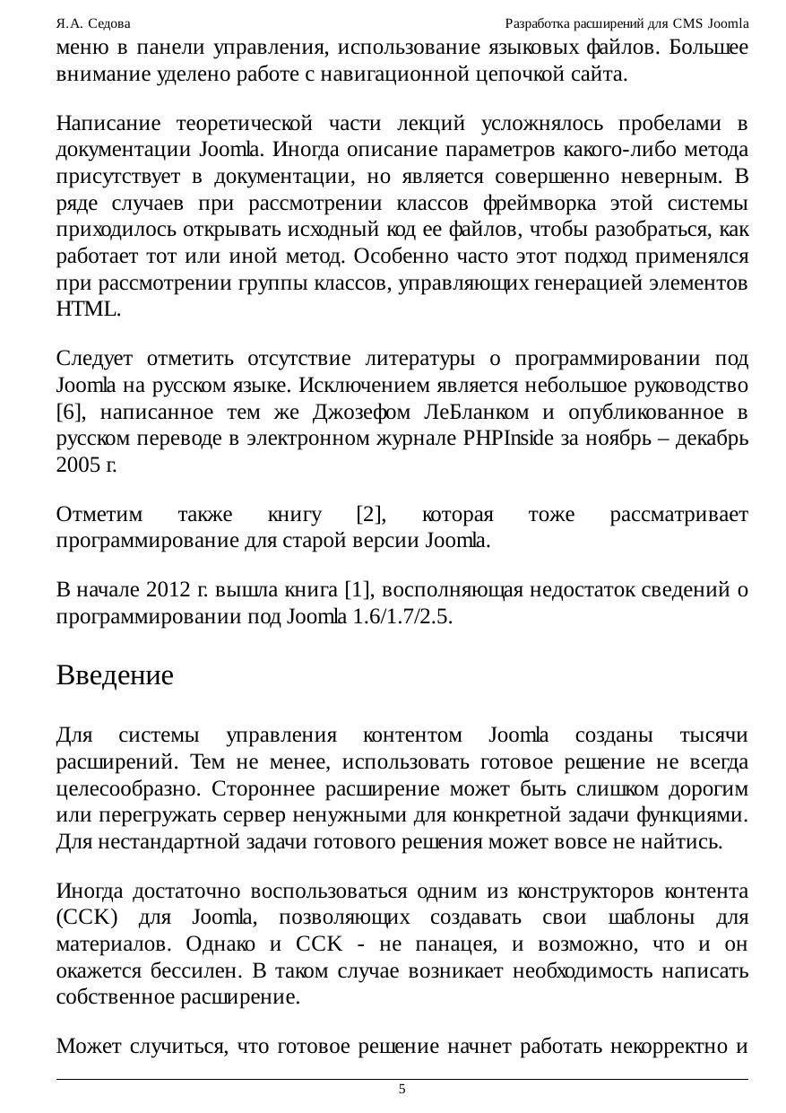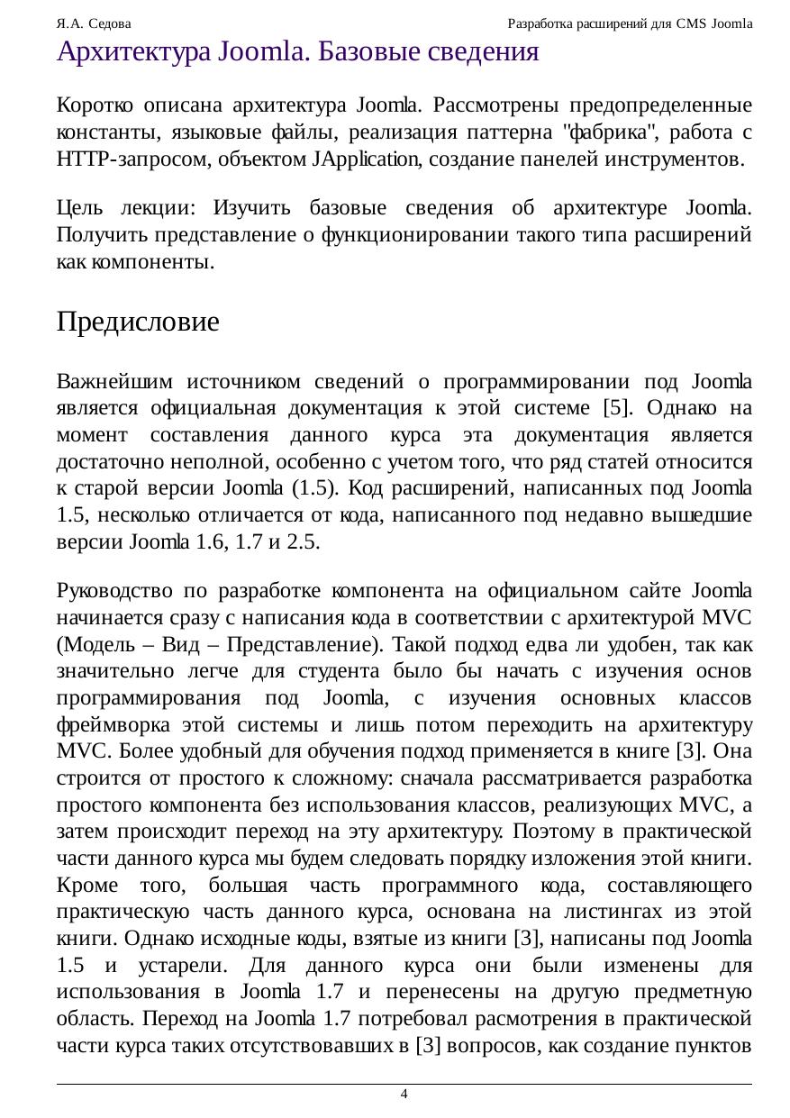 Курс посвящен разработке расширений под систему управления контентом Joomla. Хотя под эту систему управления контентом разработано множество расширений, в ряде случаев программист может столкнуться с необходимостью написать собственный компонент или модуль. Несмотря на популярность Joomla в том числе в России, на русском языке в настоящее время отсутствуют подробные руководства для разработчиков расширений, поэтому курс для программистов под Joomla представляется актуальным. Рассматривается ряд классов фреймворка Joomla, в том числе классы для работы с базой данных, электронной почтой, датами, URI, навигационной цепочкой, для генерации кода элементов HTML-форм, SEF-ссылок. Одна из лекций посвящена реализации архитектуры MVC в компонентах под Joomla. Каждая лекция сопровождается практическим примером пошаговой разработки программного кода, представляющего собой тот или иной фрагмент компонента или модуля. Таким образом, к концу курса учащийся получает два работоспособных расширения для Joomla – компонент и модуль. Код сопровождается комментариями и скриншотами. В конце первой лекции приведены задания для самостоятельной работы по вариантам на весь курс. В качестве лабораторных работ учащийся может адаптировать для своего варианта приведенный в практической части лекций программный код.