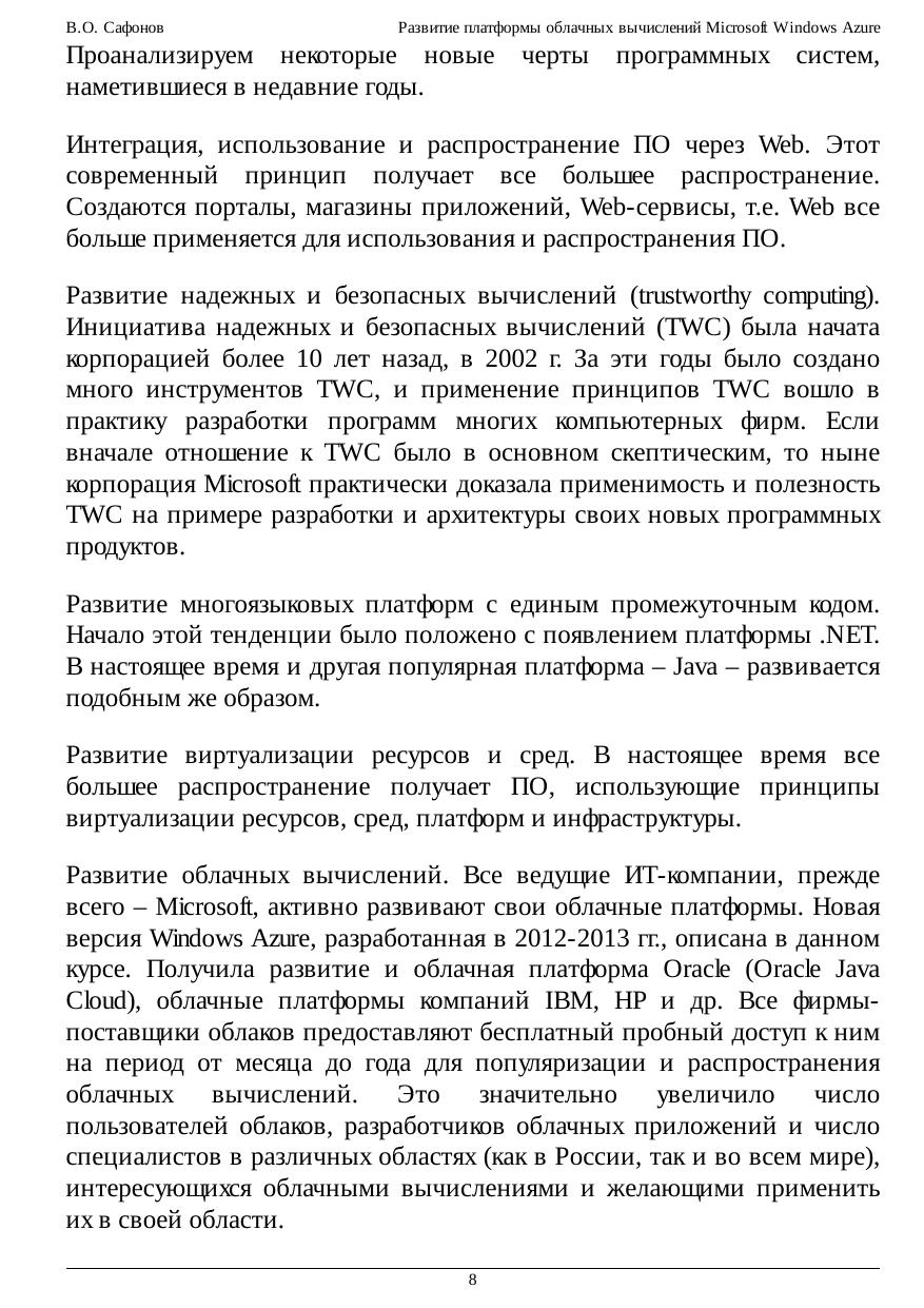 методах применения, новейшей версии ее пользовательского интерфейса. В курсе дается глубокое научное изложение и анализ платформы Azure, анализ архитектуры платформы Azure; обучение фундаментальным технологиям и принципам, на которых она базируется (.NET, WCF и др.); обучение новой версии архитектуры платформы Azure, которая является достаточно сложной для понимания, изучения и использования; обучение методам практического применения новой версии платформы Azure для решения различных классов задач (хранение и использование данных, реализация бизнес-логики, коммуникация, научные вычисления и др.).