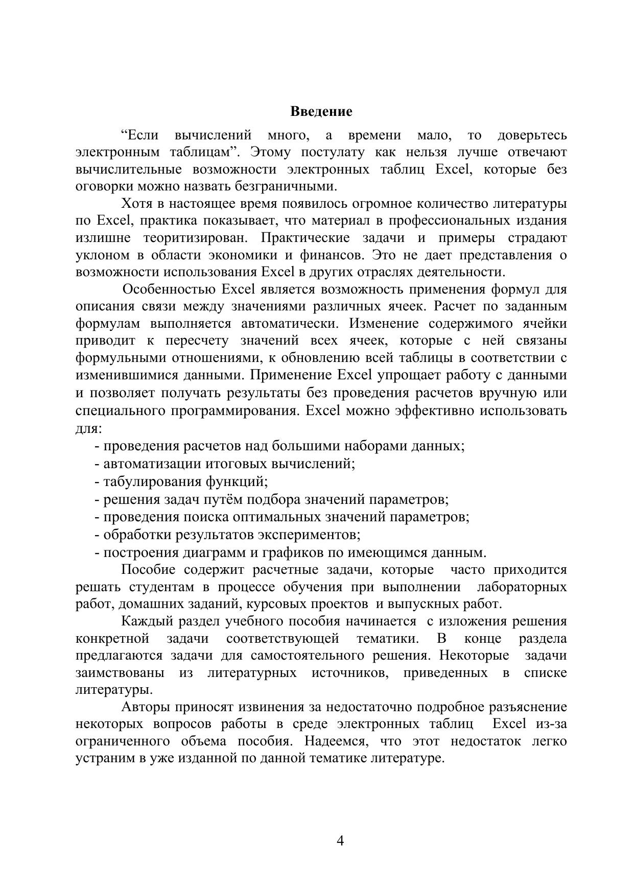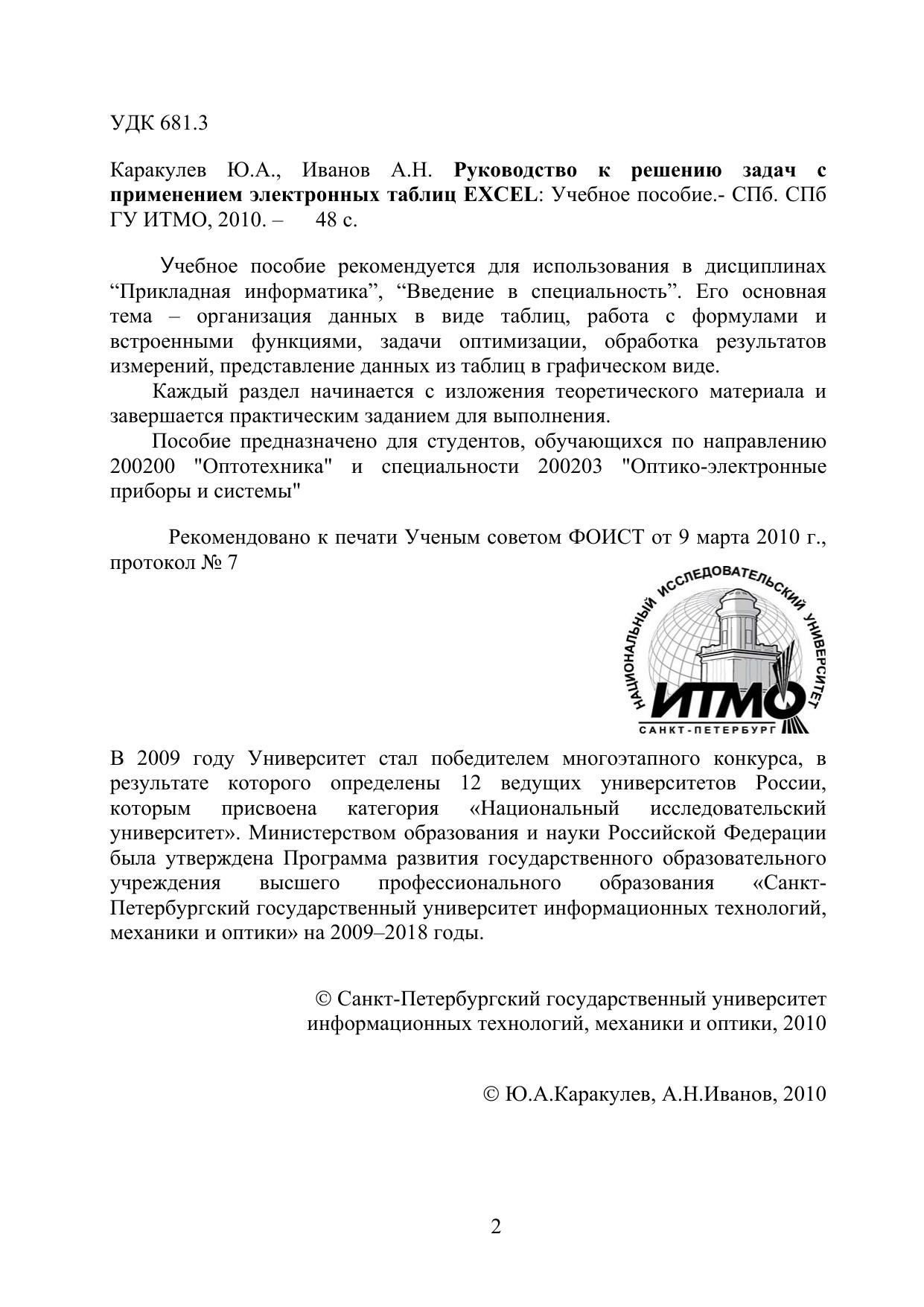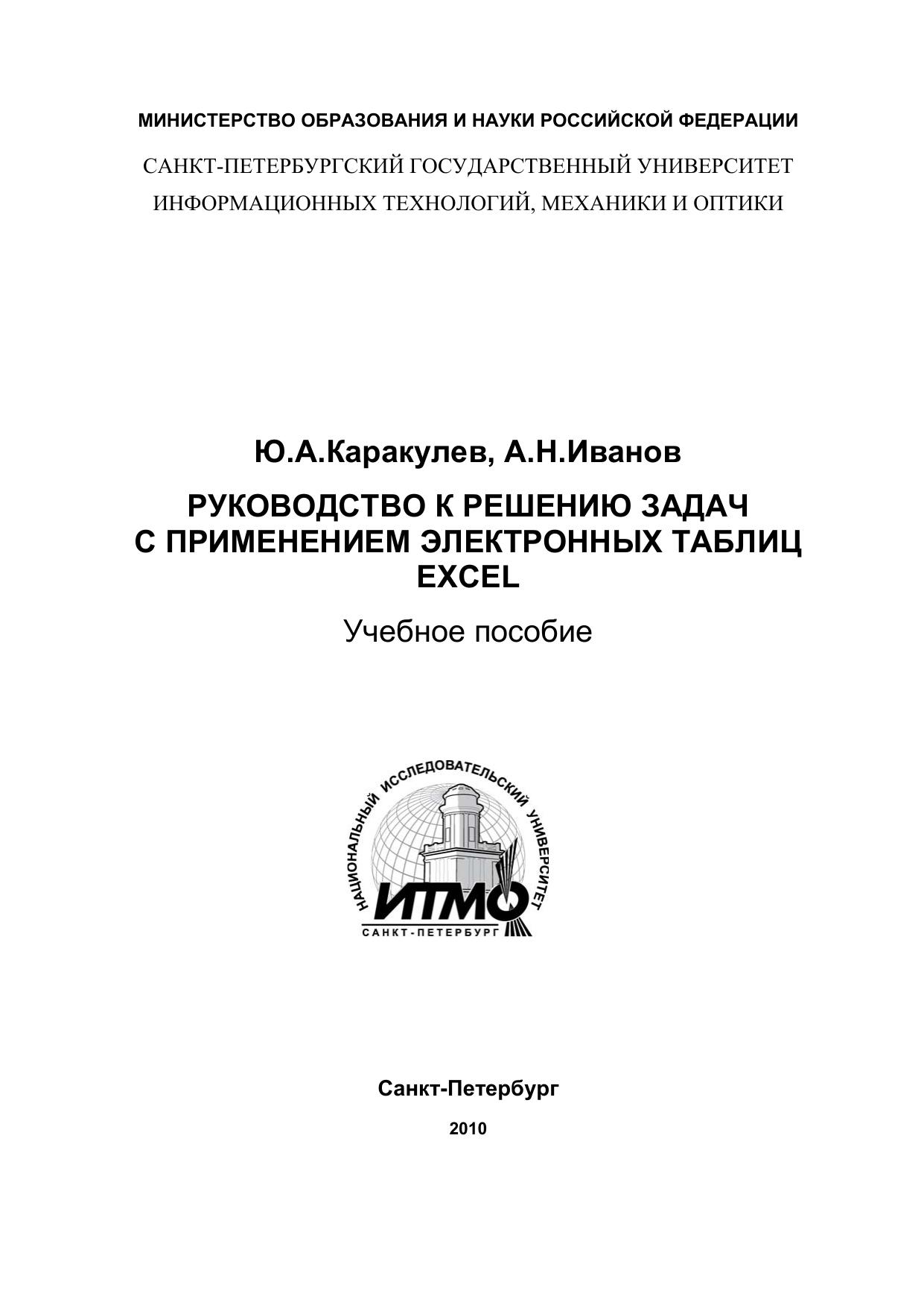 Учебное пособие рекомендуется для использования в дисциплинах “Прикладная информатика”, “Введение в специальность”. Его основная тема – организация данных в виде таблиц, работа с формулами и встроенными функциями, задачи оптимизации, обработка результатов измерений, представление данных из таблиц в графическом виде. Каждый раздел начинается с изложения теоретического материала и завершается практическим заданием для выполнения. Пособие предназначено для студентов, обучающихся по направлению 200200 "Оптотехника" и специальности 200203 "Оптико-электронные приборы и системы"