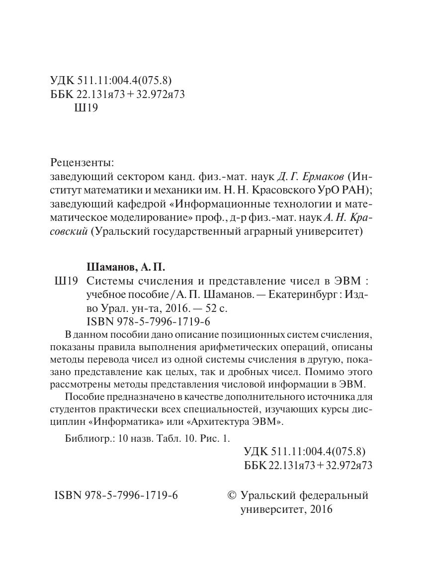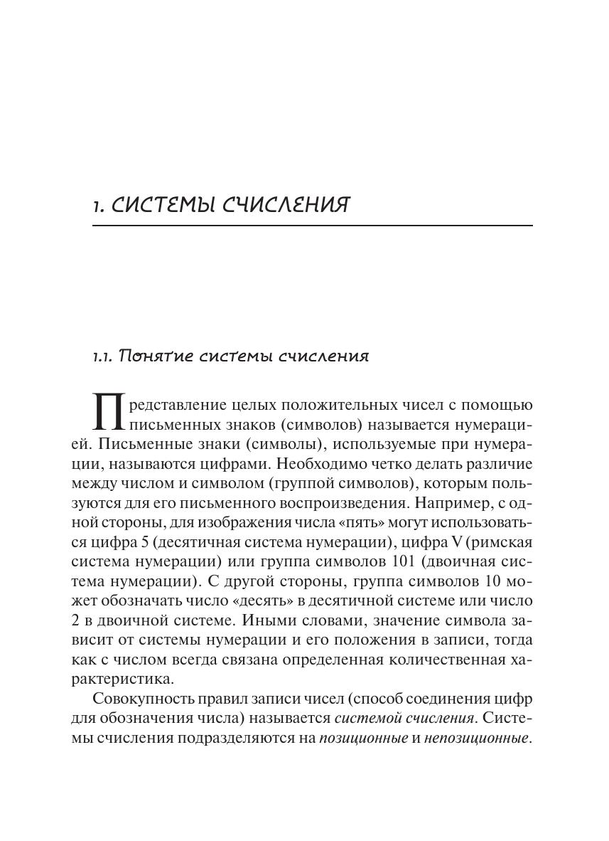 В данном пособии дано описание позиционных систем счисления, показаны правила выполнения арифметических операций, описаны методы перевода чисел из одной системы счисления в другую, показано представление как целых, так и дробных чисел. Помимо этого рассмотрены методы представления числовой информации в ЭВМ. Пособие предназначено в качестве дополнительного источника для студентов практически всех специальностей, изучающих курсы дисциплин «Информатика» или «Архитектура ЭВМ».