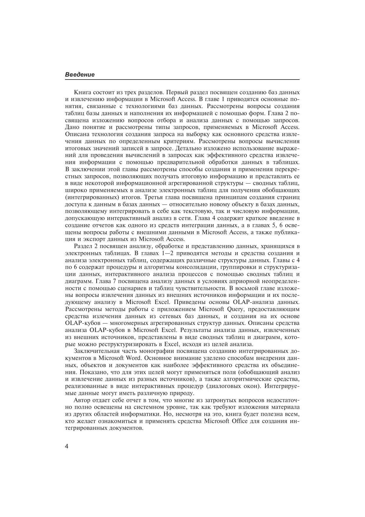 Излагаются вопросы создания интегрированных документов в среде Microsoft Office. Рассмотрены основы создания баз данных, извлечения информации и ее анализа как в Microsoft Access, так и Microsoft Excel. Изложены основы работы с Microsoft Query и его применение для извлечения данных из внешних баз данных и других источников с последующим анализом OLAP-кубов в Microsoft Excel. Показано как с помощью технологий связывания, внедрения и динамического обмена данными создать интегрированный документ в Microsoft Word. Рассмотрены поля и их применение для интеграции данных в Microsoft Word. Приводится много примеров, иллюстрирующих излагаемые методы анализа и интеграции данных. Рассчитана на начинающего пользователя, желающего ознакомиться с проблемами интеграции данных. Будет полезна всем, кто занимается вопросами анализа и обработки данных в экономических и технических системах.