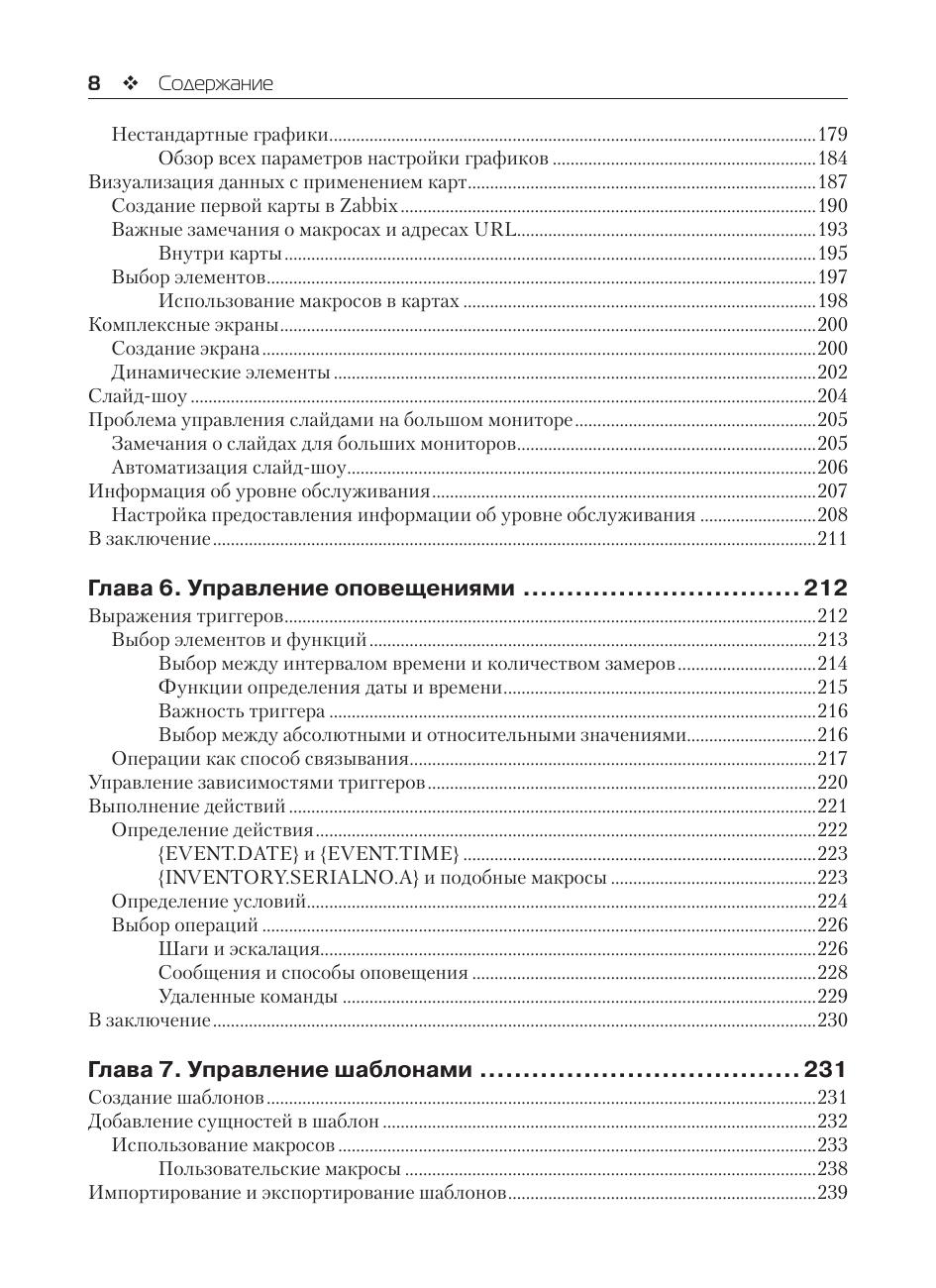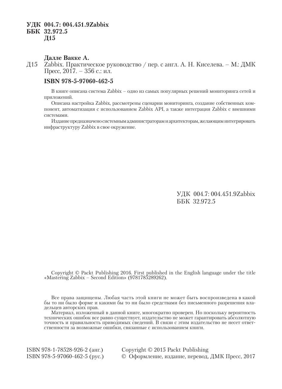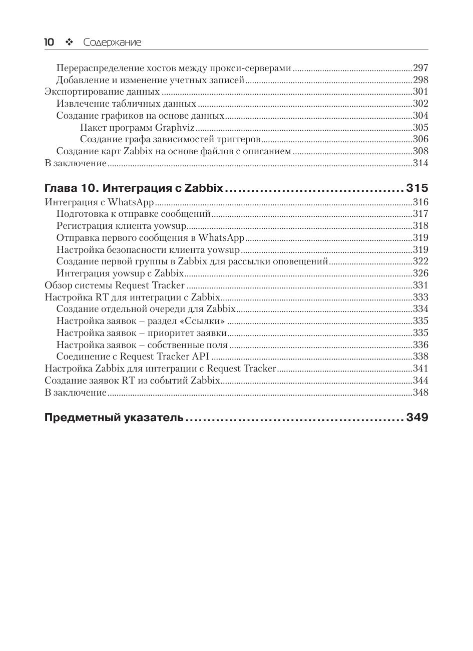 В книге описана система Zabbix – одно из самых популярных решений мониторинга сетей и приложений. Описана настройка Zabbix, рассмотрены сценарии мониторинга, создание собственных компонент, автоматизация с использованием Zabbix API, а также интеграция Zabbix с внешними системами. Издание предназначено системным администраторам и архитекторам, желающим интегрировать инфраструктуру Zabbix в свое окружение.