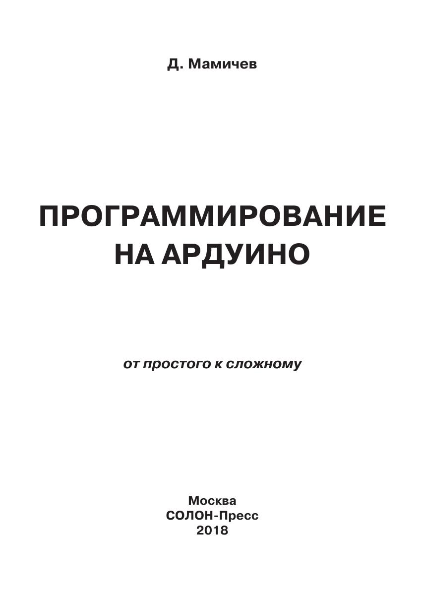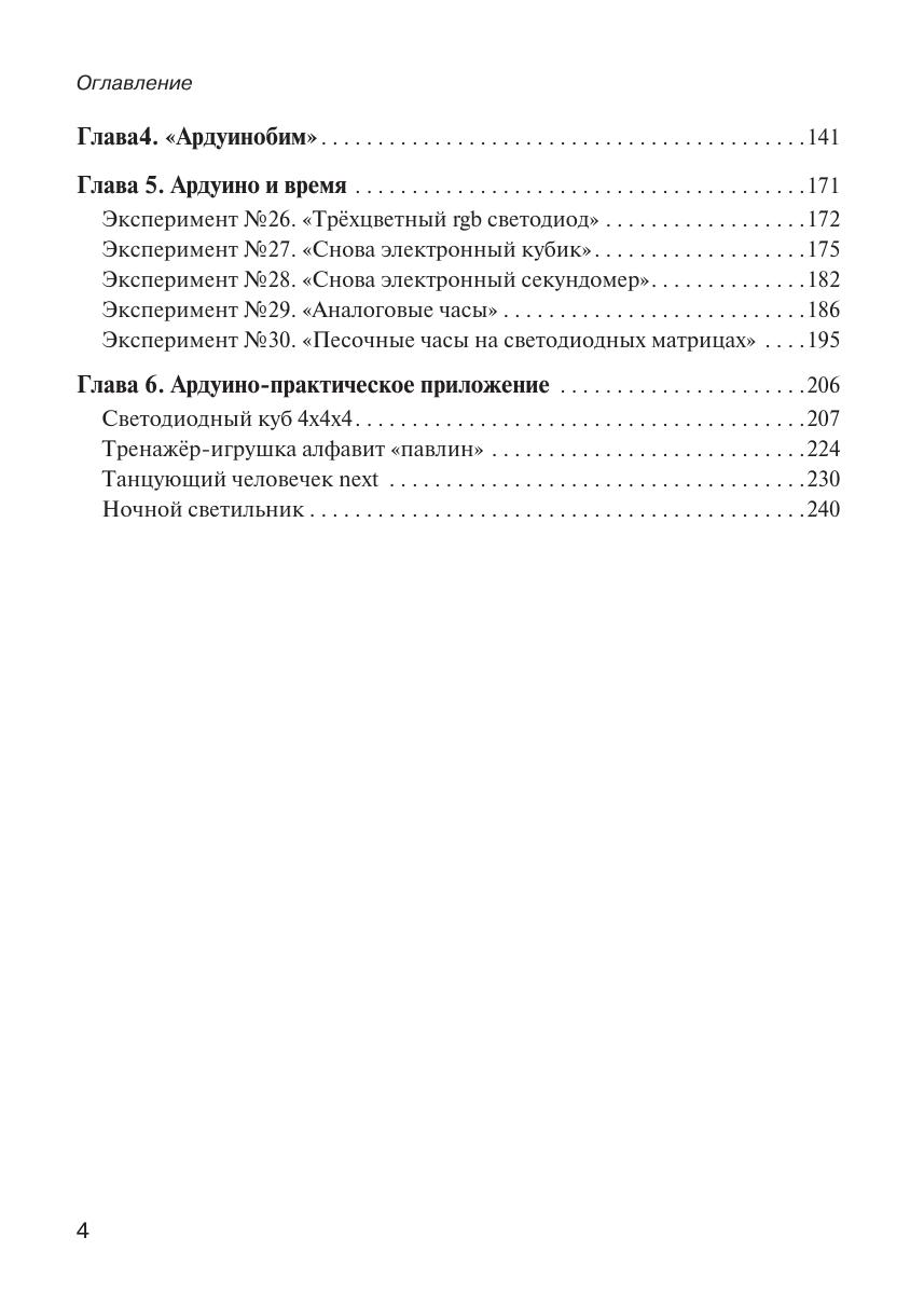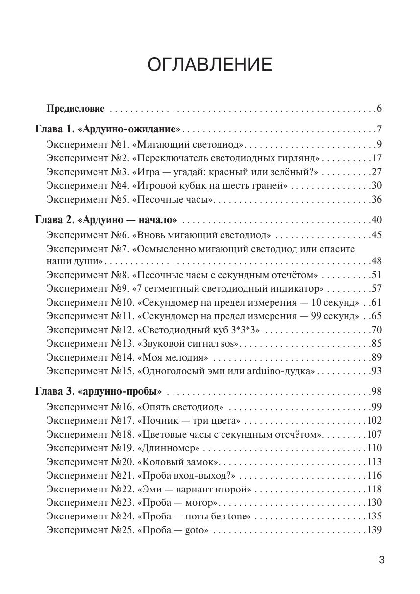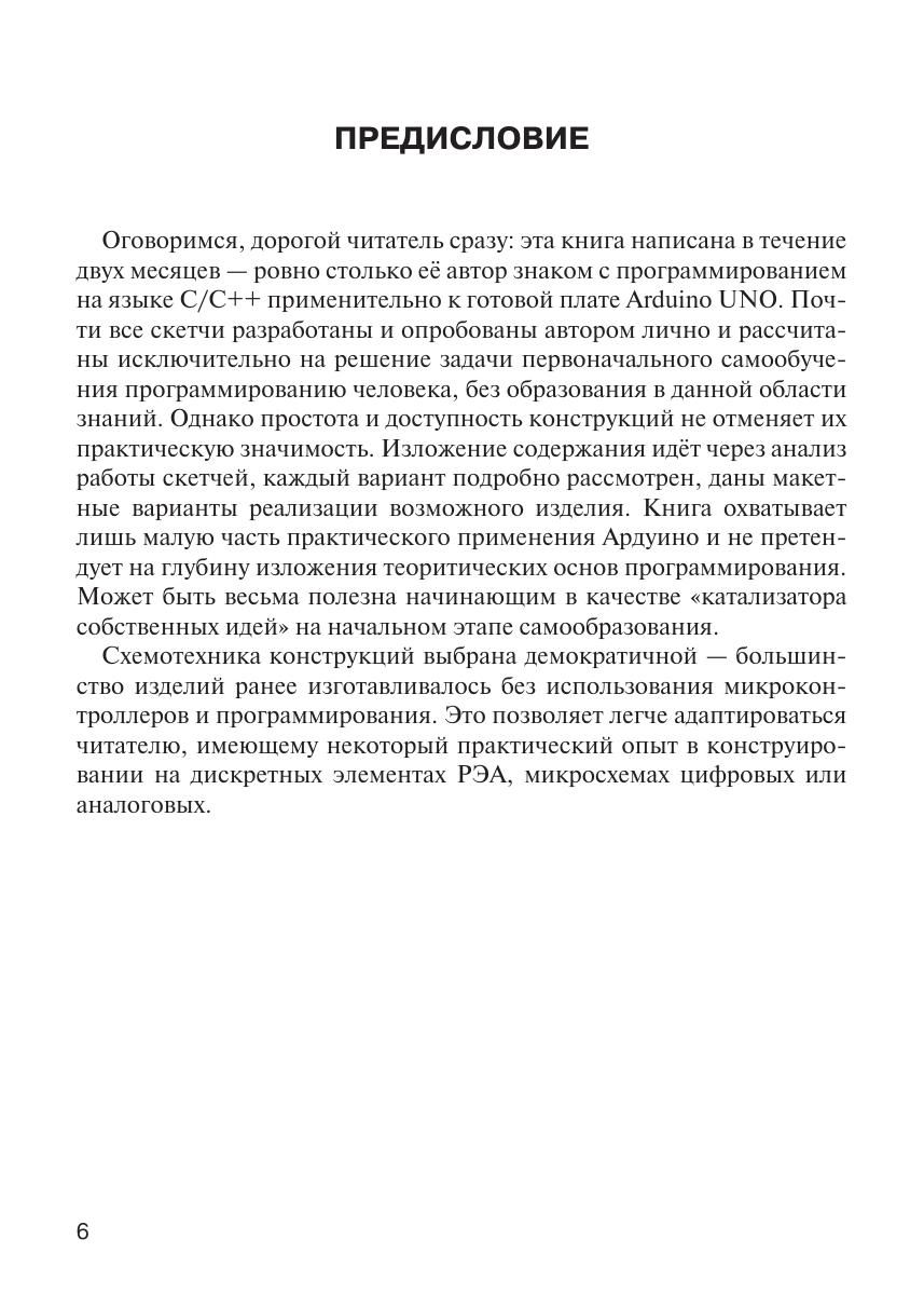 Эта книга написана для человека, только начинающего учиться программированию с использованием платформы Arduino. Многие эксперименты и скетчи могут показаться слишком простыми в повторении, даже для «непосвящённых в азы», но постижение сложного происходит от принятия простого. Чем надежнее вы освоите первые шаги, тем проще будет наращивать потенциал. Книга содержит шесть глав, первые пять рассказывают об экспериментах с платой Arduino UNO. Шестая глава содержит описания законченных конструкций. Книга безусловно будет полезна школьникам, студентам, начинающим электронщикам, желающим самообразовываться в данной области знаний.