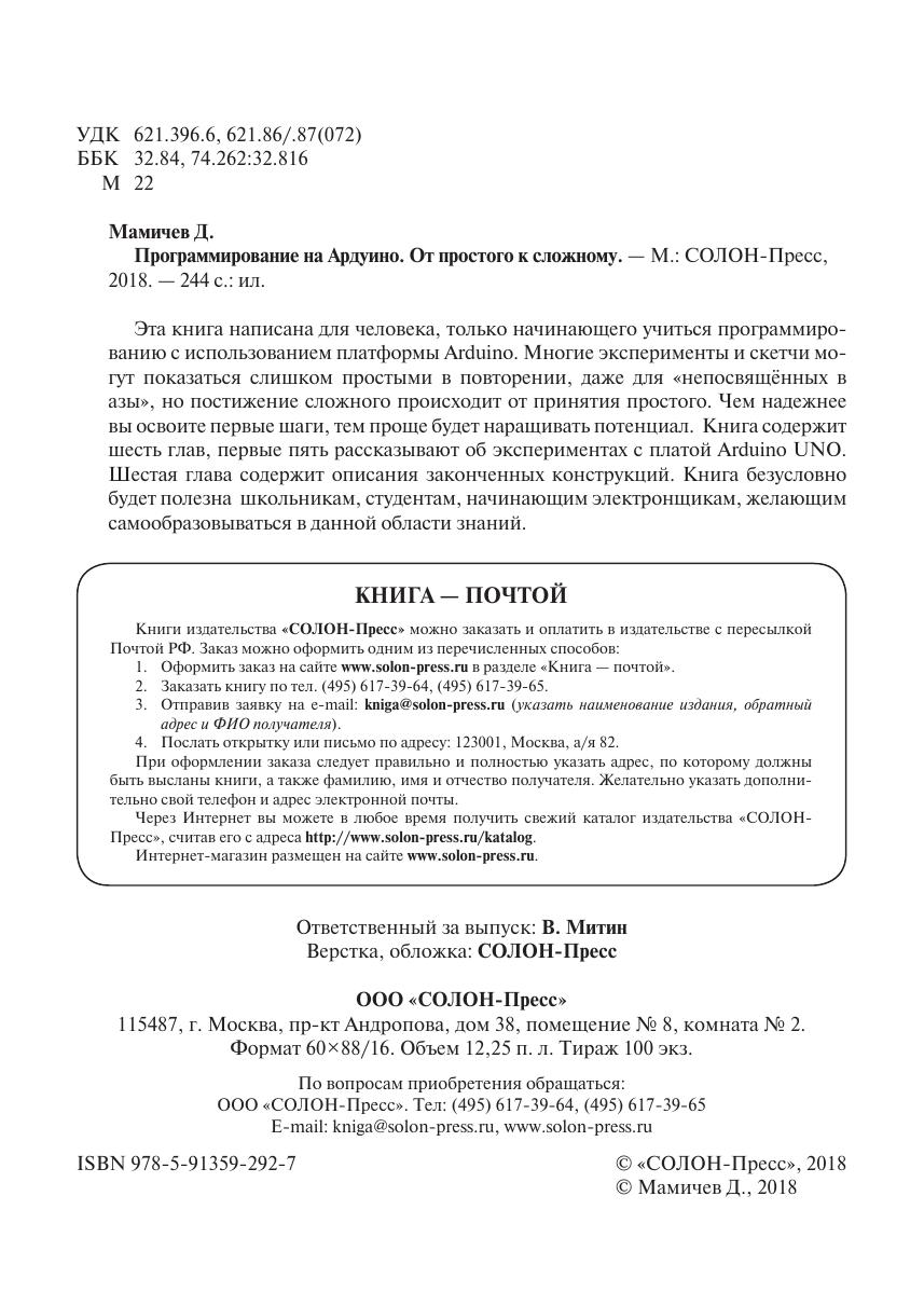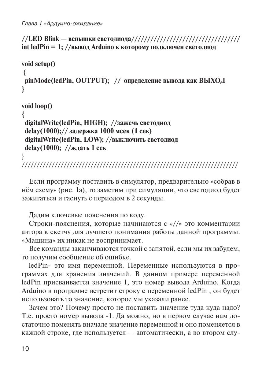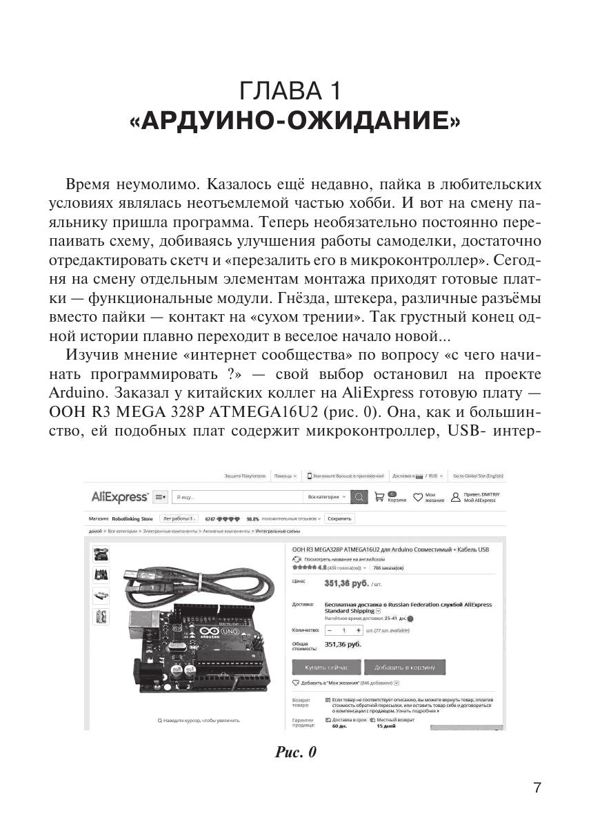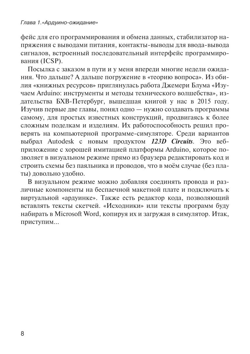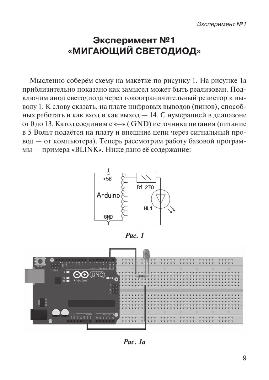 Эта книга написана для человека, только начинающего учиться программированию с использованием платформы Arduino. Многие эксперименты и скетчи могут показаться слишком простыми в повторении, даже для «непосвящённых в азы», но постижение сложного происходит от принятия простого. Чем надежнее вы освоите первые шаги, тем проще будет наращивать потенциал. Книга содержит шесть глав, первые пять рассказывают об экспериментах с платой Arduino UNO. Шестая глава содержит описания законченных конструкций. Книга безусловно будет полезна школьникам, студентам, начинающим электронщикам, желающим самообразовываться в данной области знаний.
