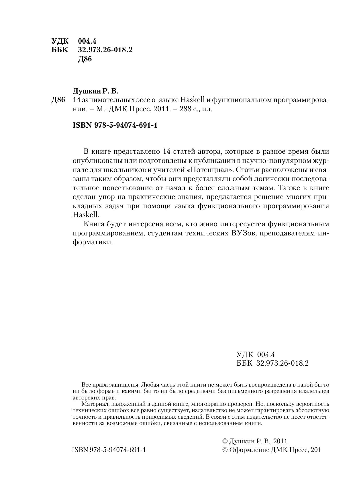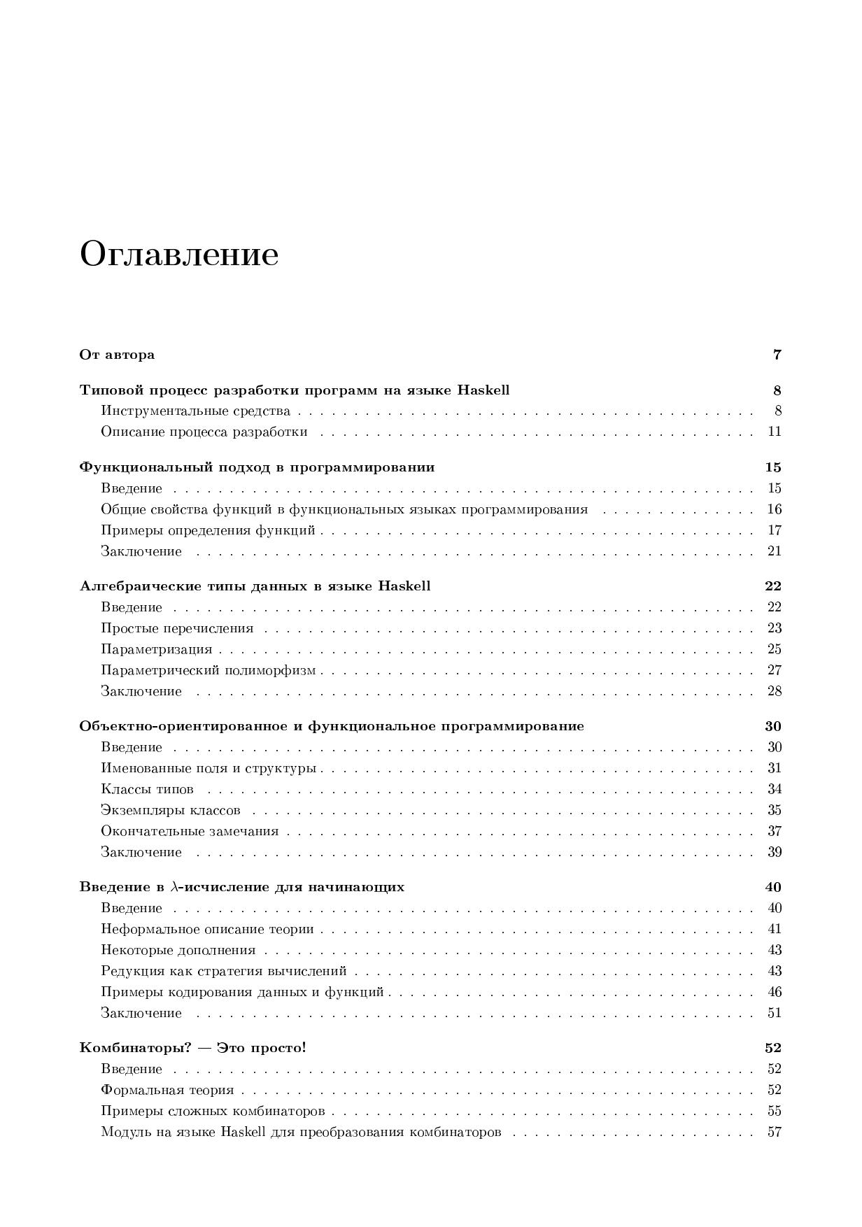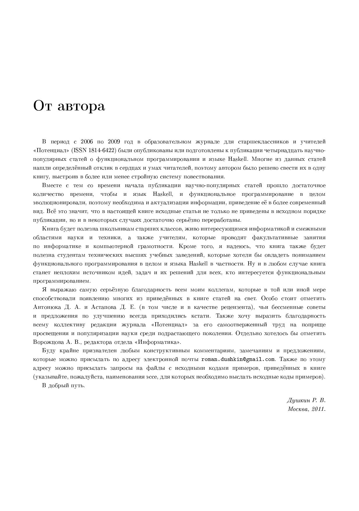 В книге представлено 14 статей автора, которые в разное время были опубликованы или подготовлены к публикации в научно популярном журнале для школьников и учителей «Потенциал». Статьи расположены и связаны таким образом, чтобы они представляли собой логически последовательное повествование от начал к более сложным темам. Также в книге сделан упор на практические знания, предлагается решение многих прикладных задач при помощи языка функционального программирования Haskell. Книга будет интересна всем, кто живо интересуется функциональным программированием, студентам технических ВУЗов, преподавателям информатики.