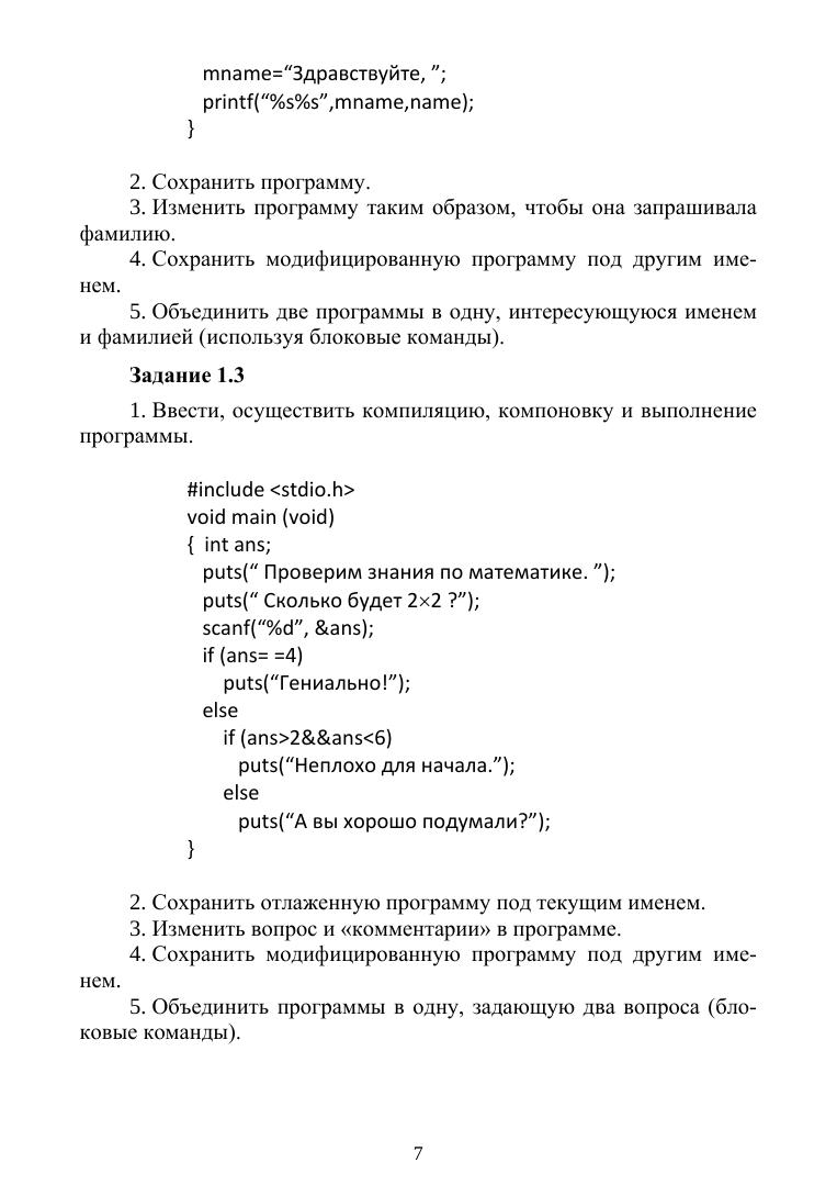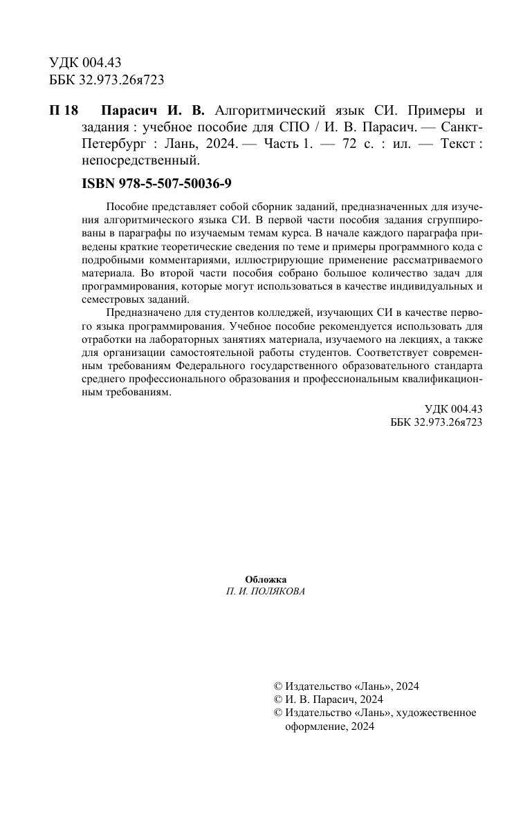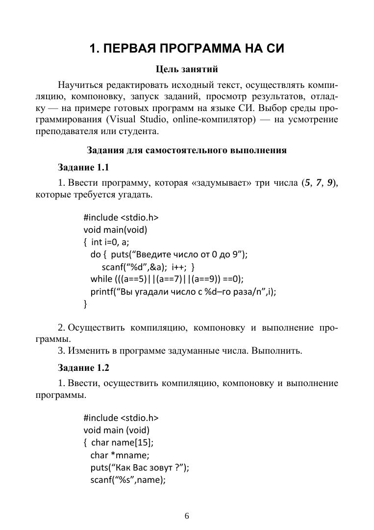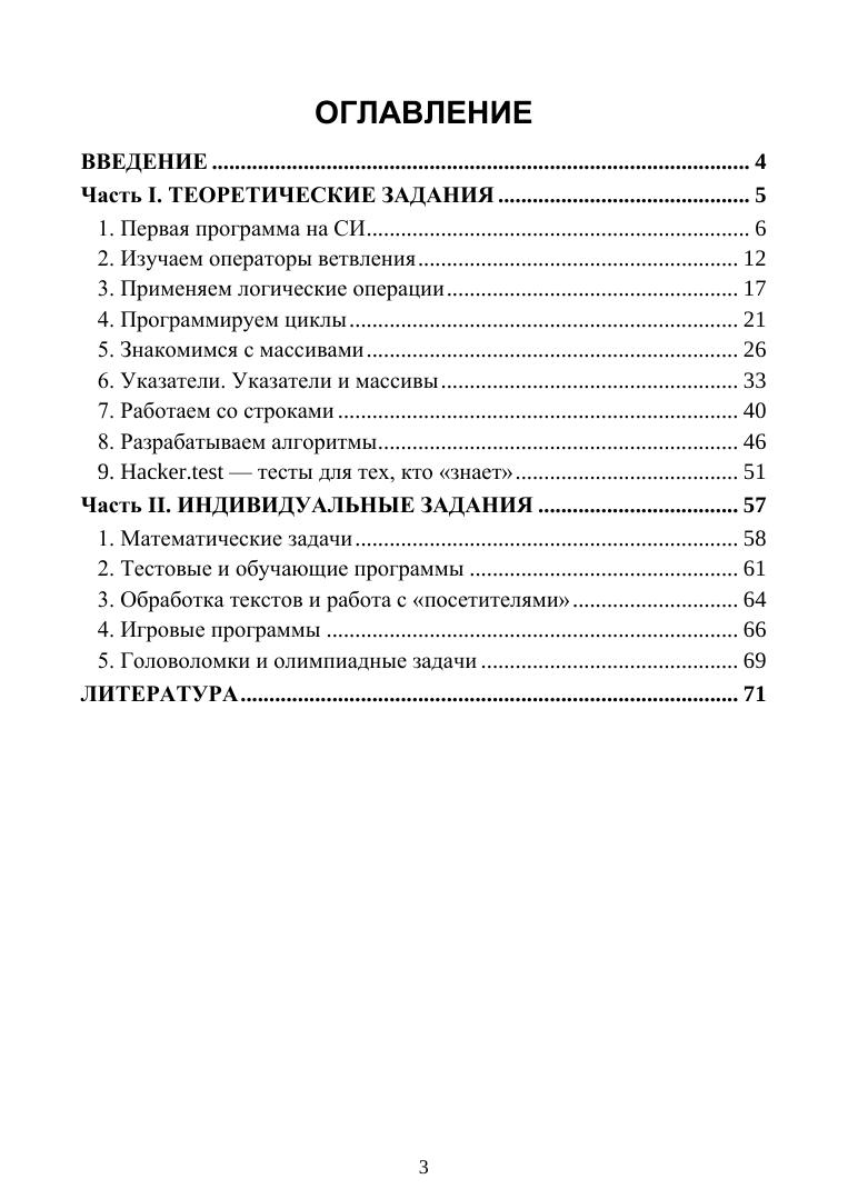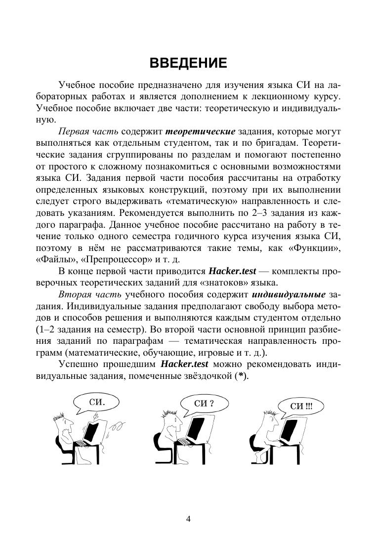Пособие представляет собой сборник заданий, предназначенных для изучения алгоритмического языка СИ. В первой части пособия задания сгруппированы в параграфы по изучаемым темам курса. В начале каждого параграфа приведены краткие теоретические сведения по теме и примеры программного кода с подробными комментариями, иллюстрирующие применение рассматриваемого материала. Во второй части пособия собрано большое количество задач для программирования, которые могут использоваться в качестве индивидуальных и семестровых заданий. Предназначено для студентов колледжей, изучающих СИ в качестве первого языка программирования. Учебное пособие рекомендуется использовать для отработки на лабораторных занятиях материала, изучаемого на лекциях, а также для организации самостоятельной работы студентов. Соответствует современным требованиям Федерального государственного образовательного стандарта среднего профессионального образования и профессиональным квалификационным требованиям.