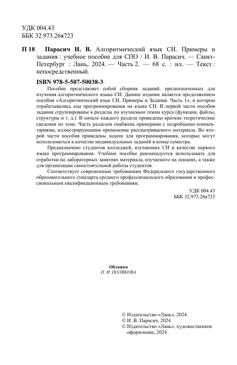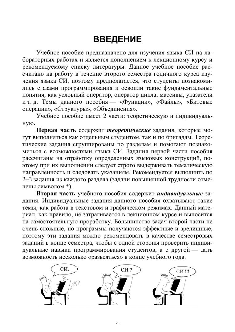 Пособие представляет собой сборник заданий, предназначенных для изучения алгоритмического языка СИ. Данное издание является продолжением пособия «Алгоритмический язык СИ. Примеры и Задания. Часть 1», в котором отрабатывались азы программирования на языке СИ. В первой части пособия задания сгруппированы в разделы по изучаемым темам курса (функции, файлы, структуры и т. д.). В начале каждого раздела приведены краткие теоретические сведения по теме. Часть разделов снабжена примерами с подробными комментариями, иллюстрирующими применение рассматриваемого материала. Во второй части пособия приведены задачи для программирования, которые могут использоваться в качестве индивидуальных заданий в конце семестра. Предназначено студентов колледжей, изучающих СИ в качестве первого языка программирования. Учебное пособие рекомендуется использовать для отработки на лабораторных занятиях материала, изучаемого на лекциях, а также для организации самостоятельной работы студентов. Соответствует современным требованиям Федерального государственного образовательного стандарта среднего профессионального образования и профессиональным квалификационным требованиям.