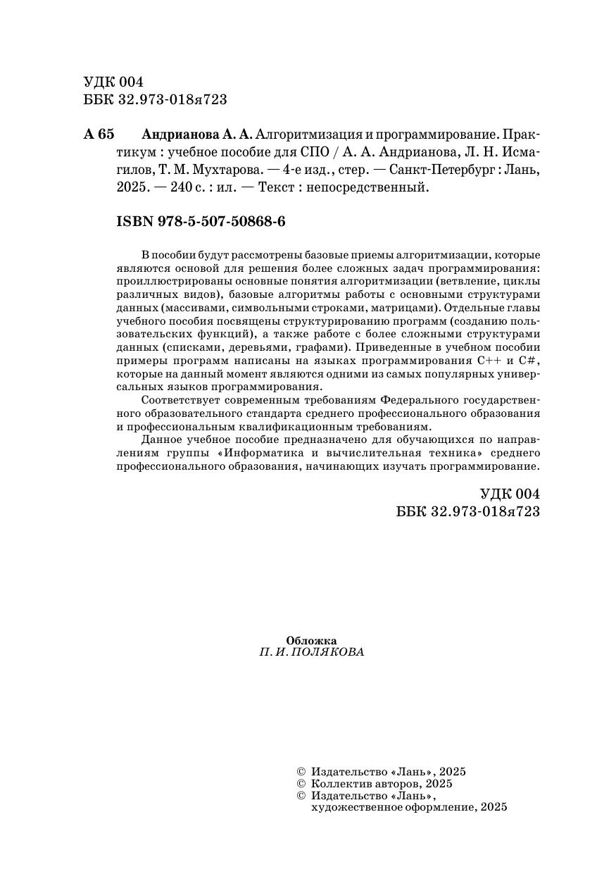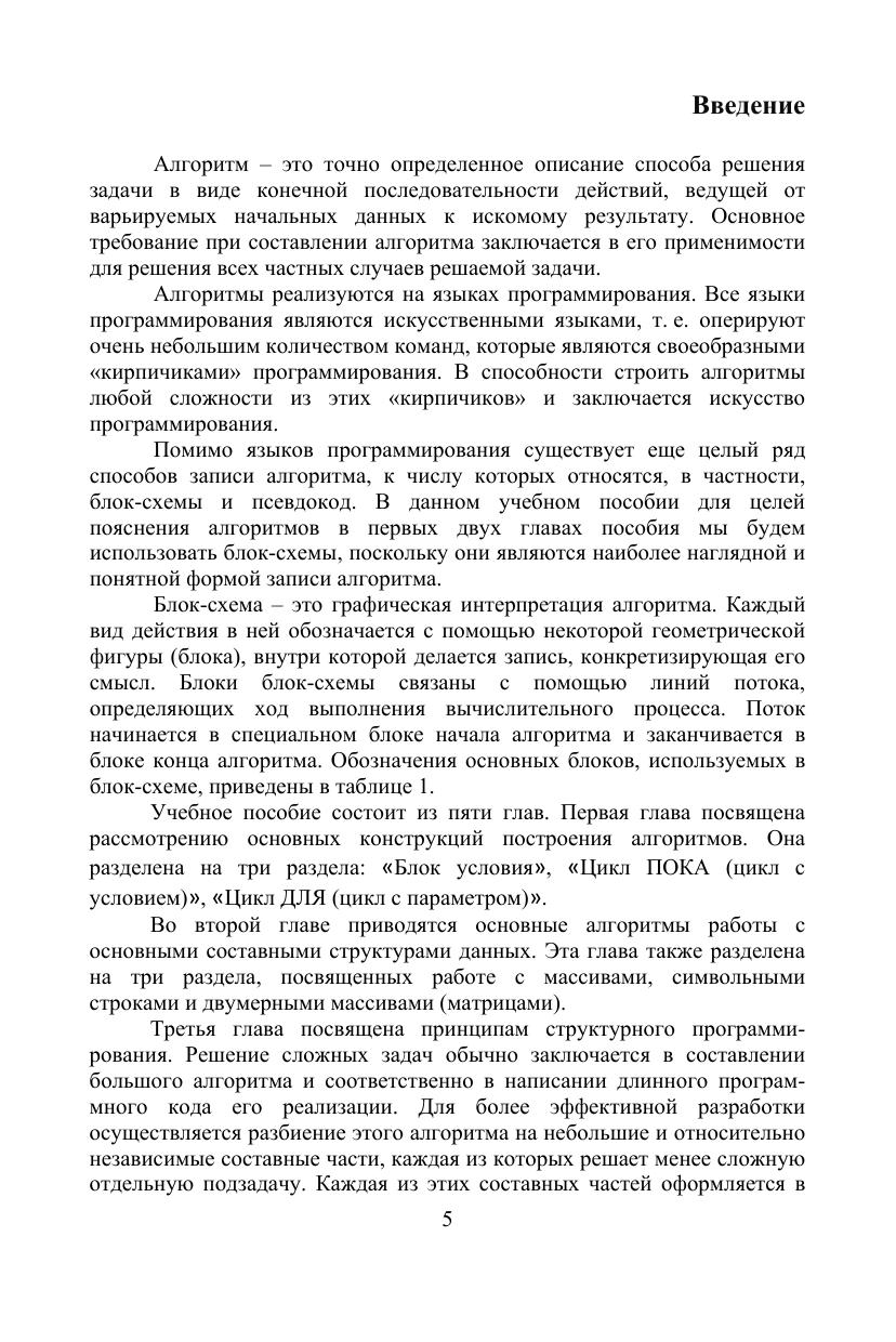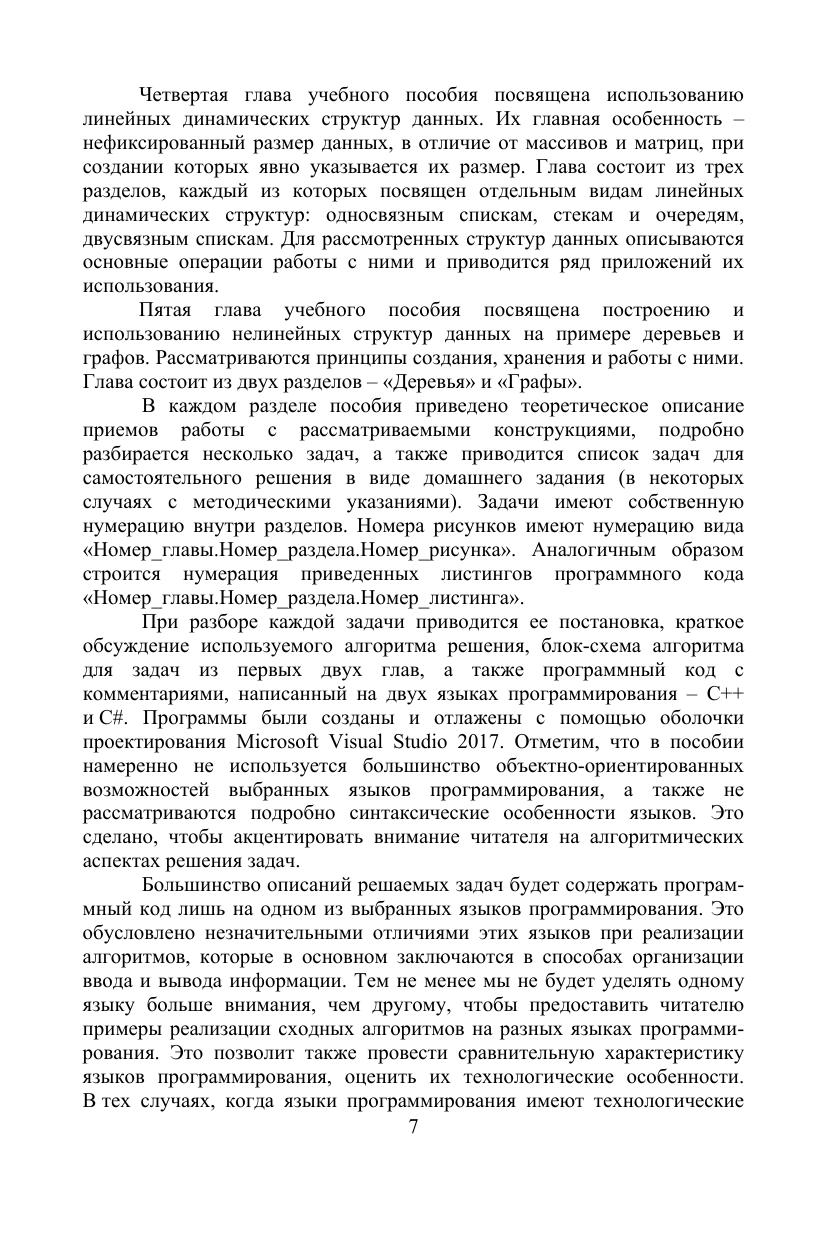 В пособии будут рассмотрены базовые приемы алгоритмизации, которые являются основой для решения более сложных задач программирования: проиллюстрированы основные понятия алгоритмизации (ветвление, циклы различных видов), базовые алгоритмы работы с основными структурами данных (массивами, символьными строками, матрицами). Отдельные главы учебного пособия посвящены структурированию программ (созданию пользовательских функций), а также работе с более сложными структурами данных (списками, деревьями, графами). Приведенные в учебном пособии примеры программ написаны на языках программирования C++ и C#, которые на данный момент являются одними из самых популярных универсальных языков программирования. Соответствует современным требованиям Федерального государственного образовательного стандарта среднего профессионального образования и профессиональным квалификационным требованиям. Данное учебное пособие предназначено для обучающихся по направлениям группы «Информатика и вычислительная техника» среднего профессионального образования, начинающих изучать программирование.