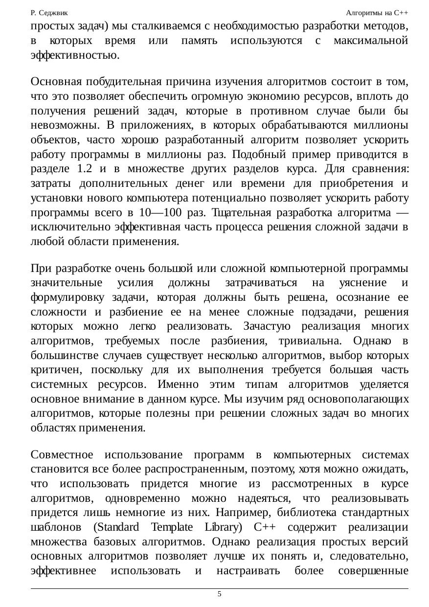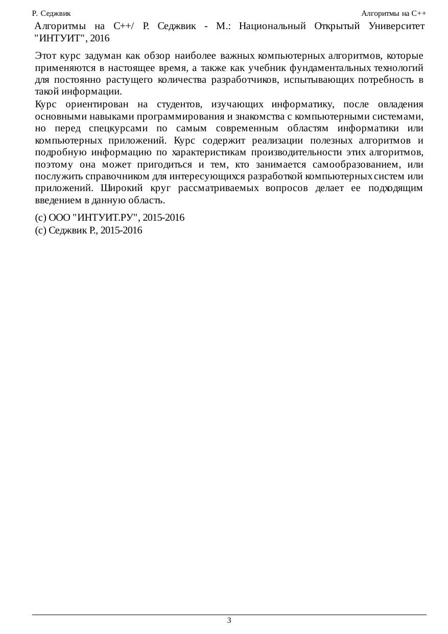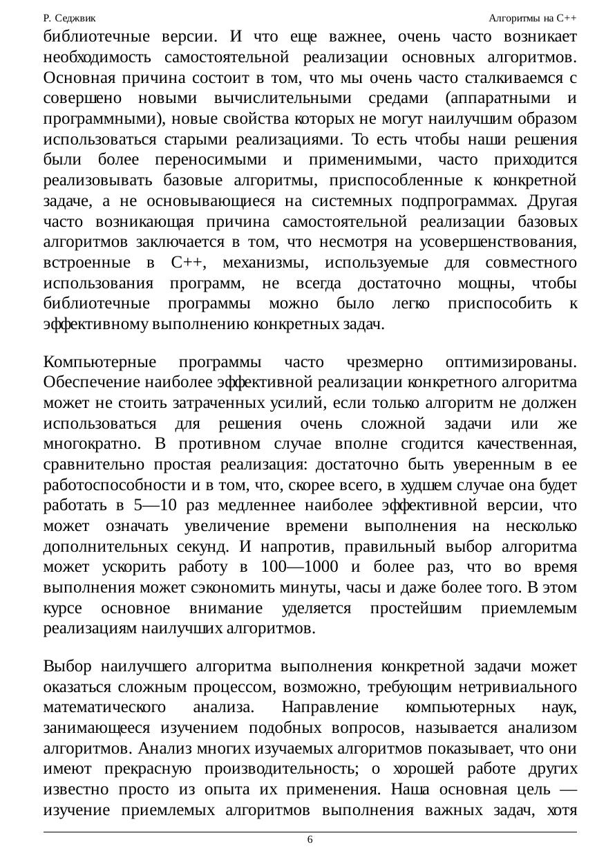 такой информации. Курс ориентирован на студентов, изучающих информатику, после овладения основными навыками программирования и знакомства с компьютерными системами, но перед спецкурсами по самым современным областям информатики или компьютерных приложений. Курс содержит реализации полезных алгоритмов и подробную информацию по характеристикам производительности этих алгоритмов, поэтому она может пригодиться и тем, кто занимается самообразованием, или послужить справочником для интересующихся разработкой компьютерных систем или приложений. Широкий круг рассматриваемых вопросов делает ее подходящим