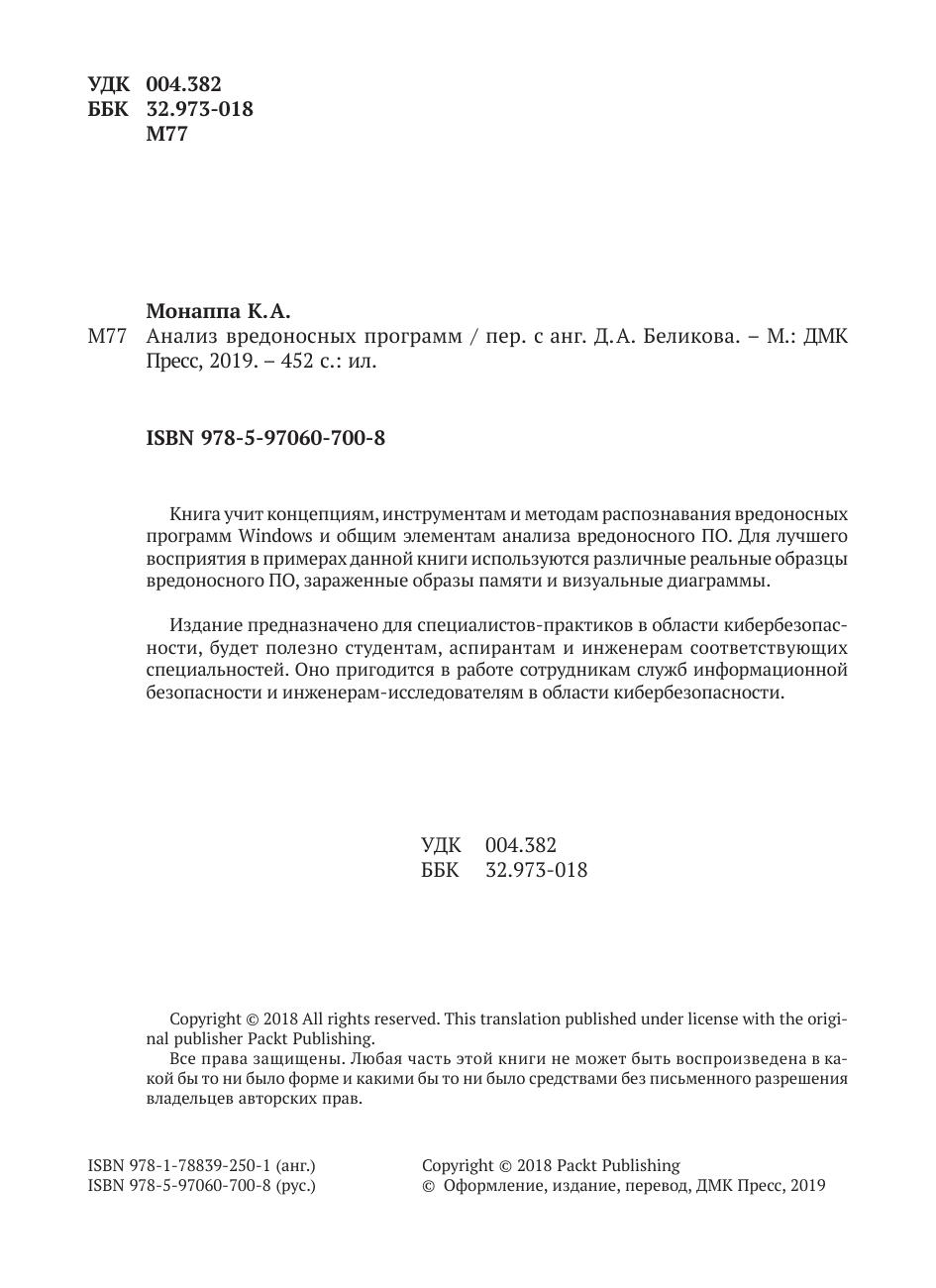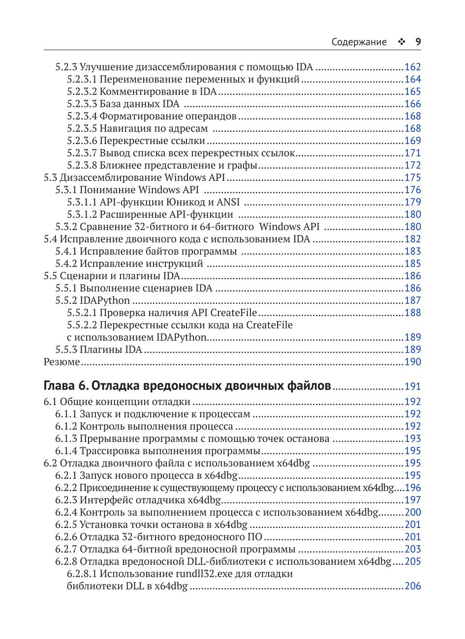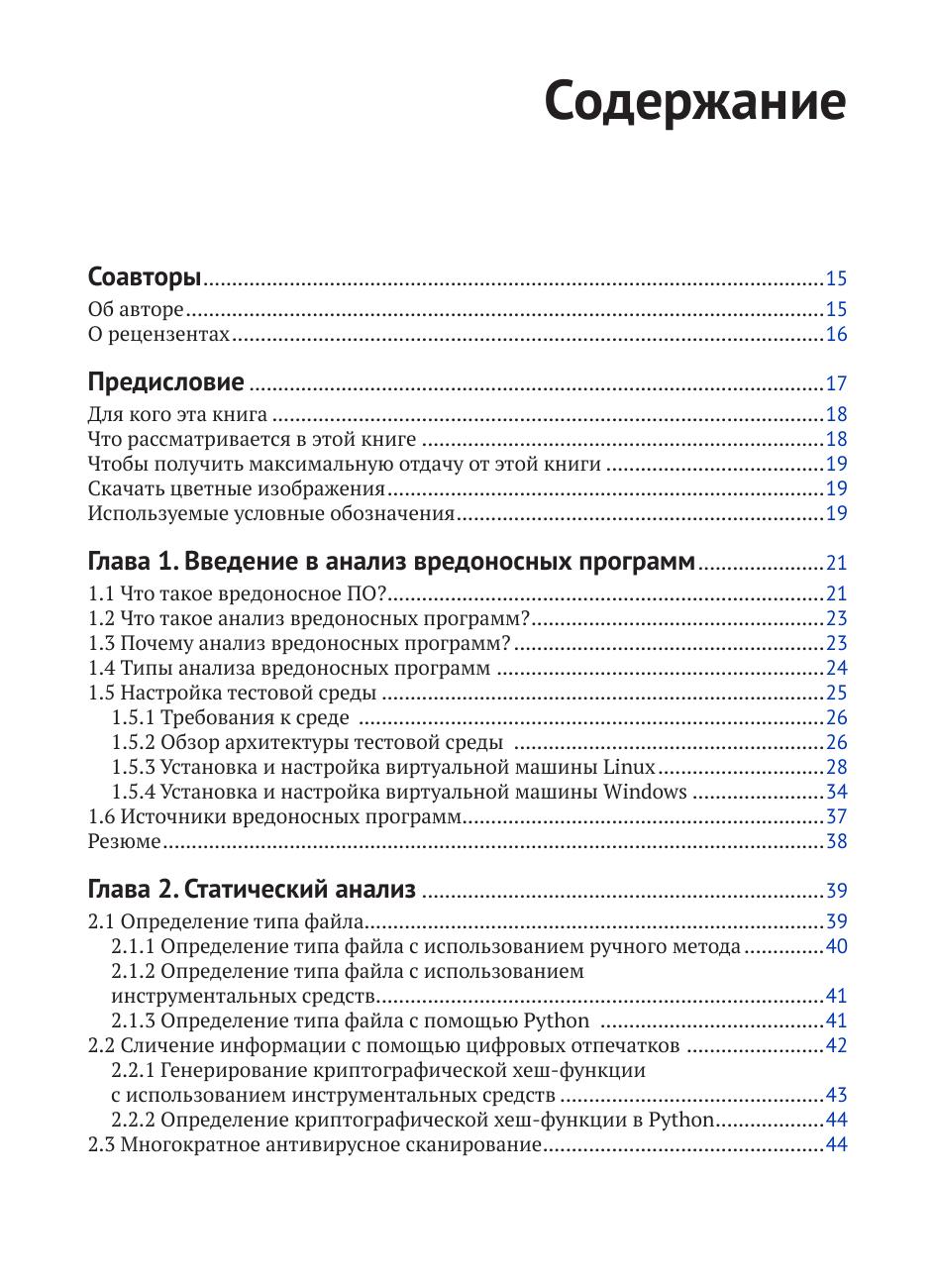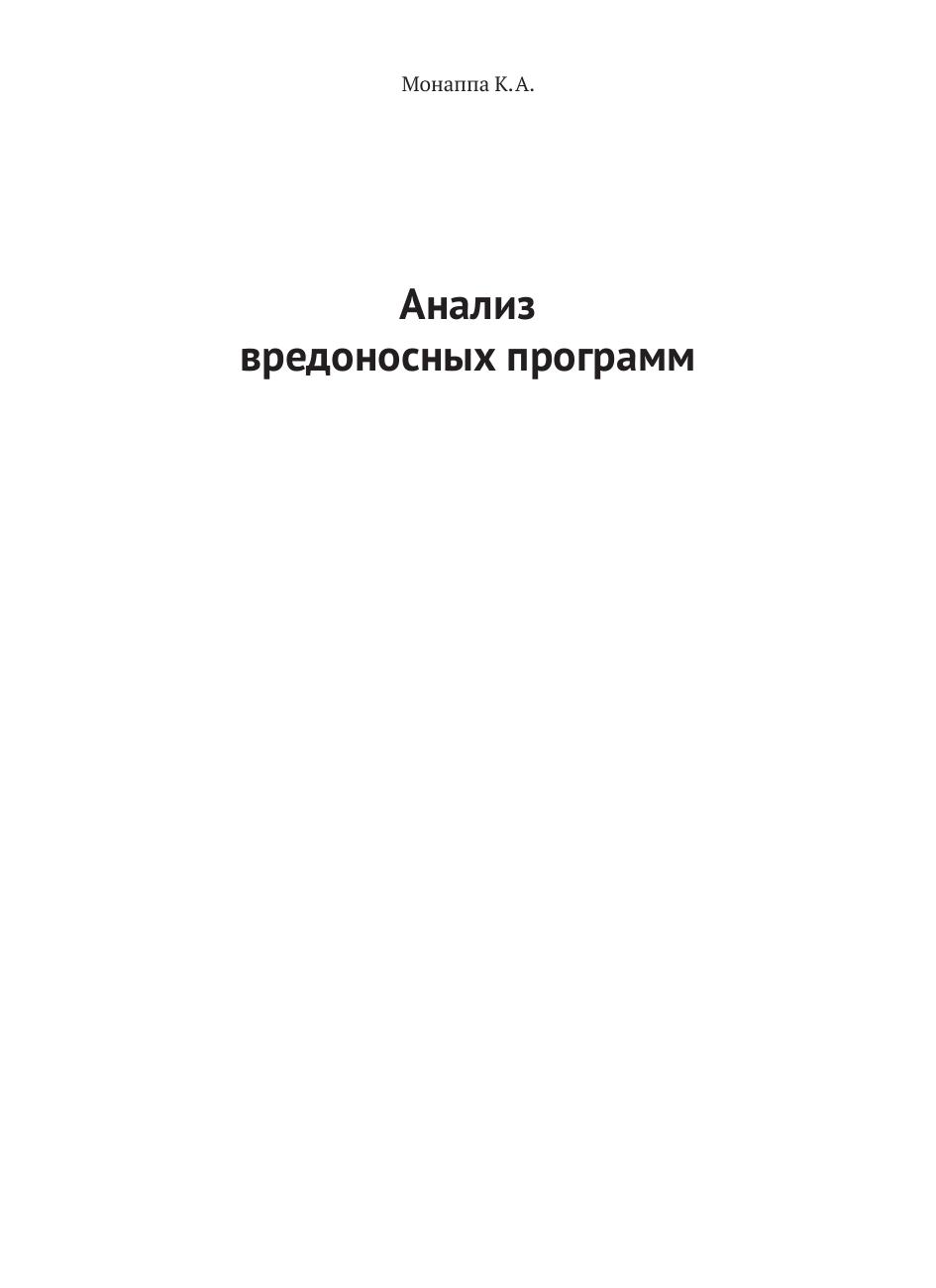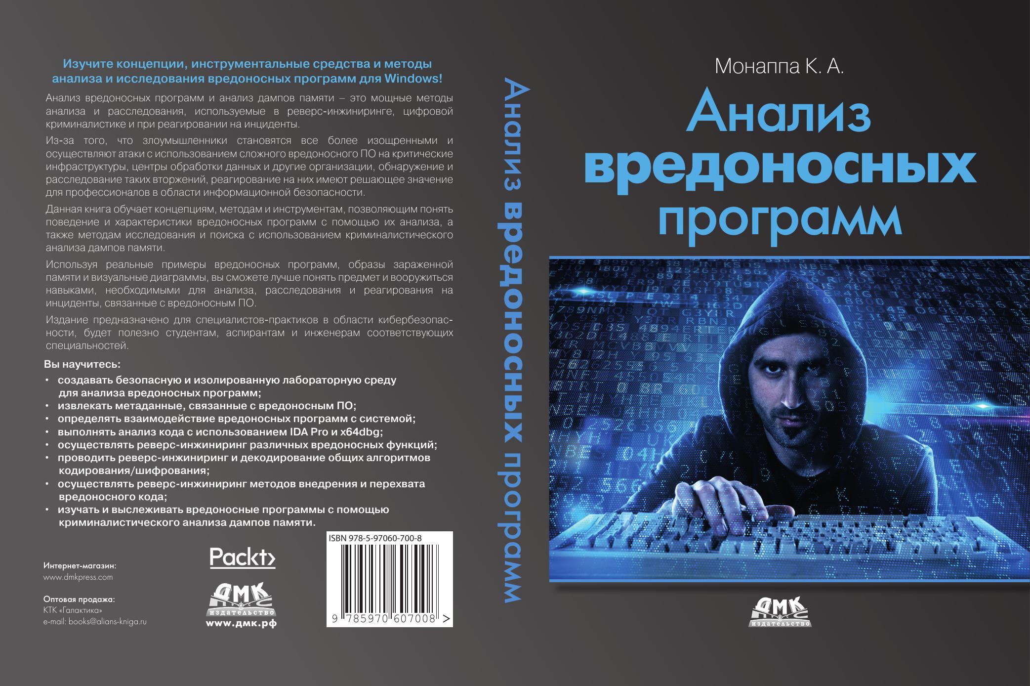 Книга учит концепциям, инструментам и методам распознавания вредоносных программ Windows и общим элементам анализа вредоносного ПО. Для лучшего восприятия в примерах данной книги используются различные реальные образцы вредоносного ПО, зараженные образы памяти и визуальные диаграммы. Издание предназначено для специалистов-практиков в области кибербезопасности, будет полезно студентам, аспирантам и инженерам соответствующих специальностей. Оно пригодится в работе сотрудникам служб информационной безопасности и инженерам-исследователям в области кибербезопасности.