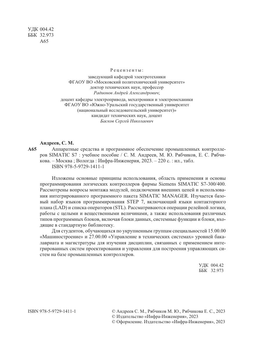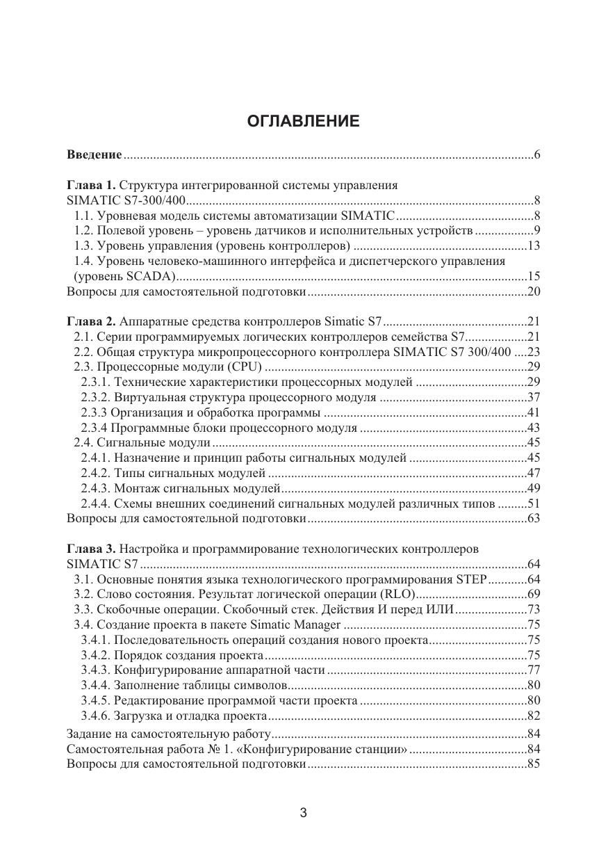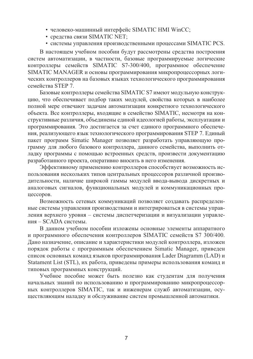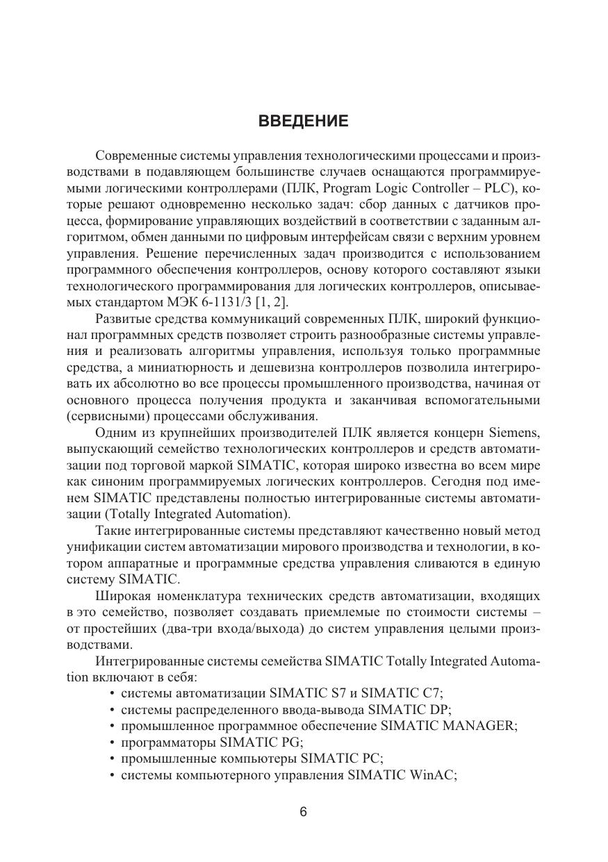 Изложены основные принципы использования, область применения и основы программирования логических контроллеров фирмы Siemens SIMATIC S7-300/400. Рассмотрены вопросы монтажа модулей, подключения внешних цепей и использования интегрированного программного пакета SIMATIC MANAGER. Изучается базовый набор языков программирования STEP 7, включающий языки контакторного плана (LAD) и списка операторов (STL). Рассматриваются операции релейной логики, работы с целыми и вещественными величинами, а также использования различных типов программных блоков, включая блоки данных, системные функции и блоки, входящие в стандартную библиотеку.