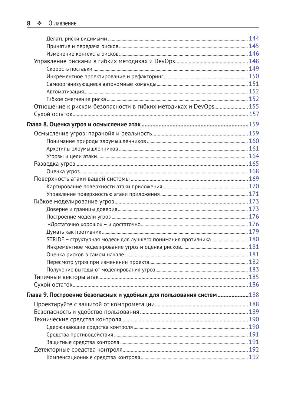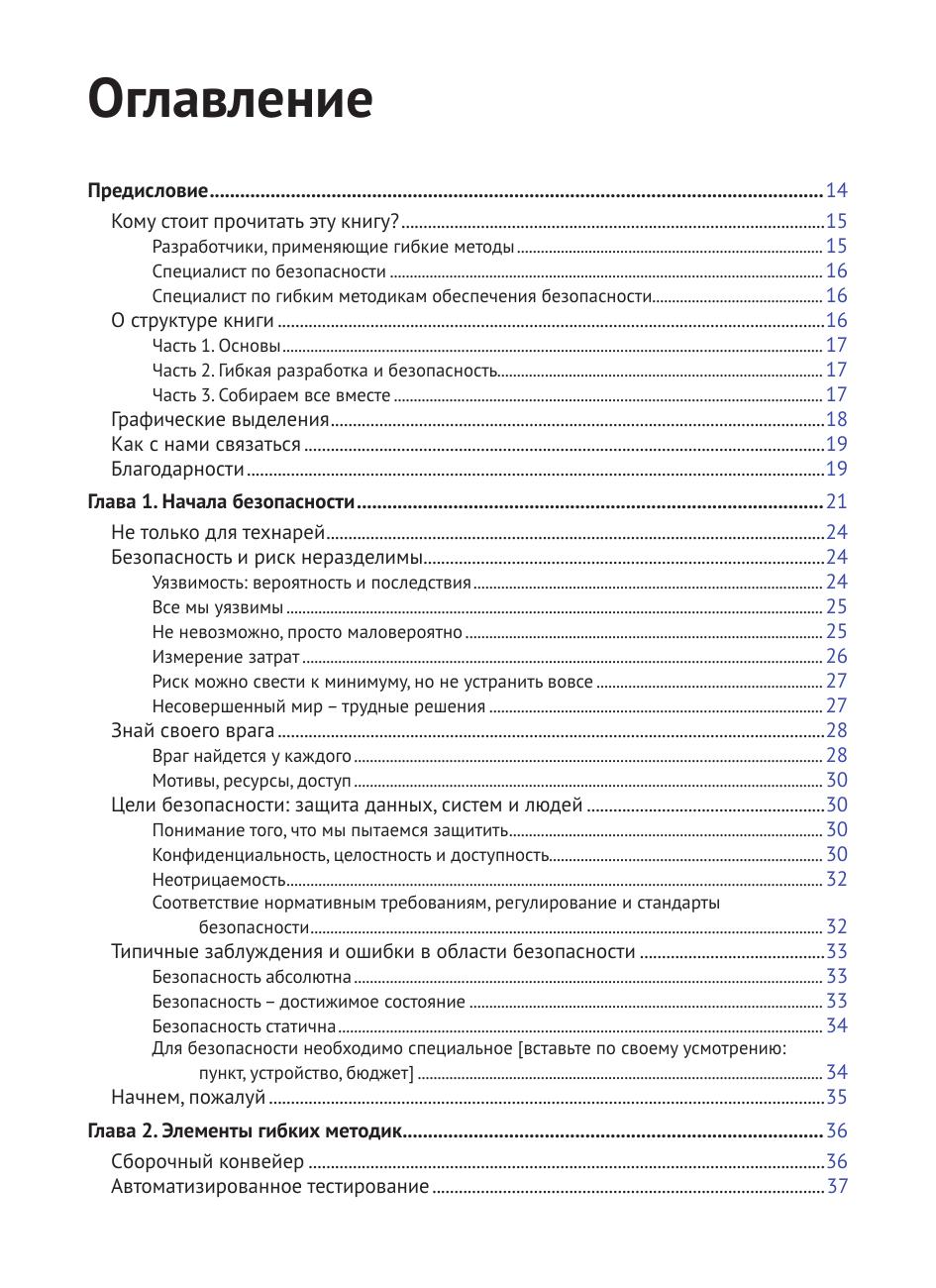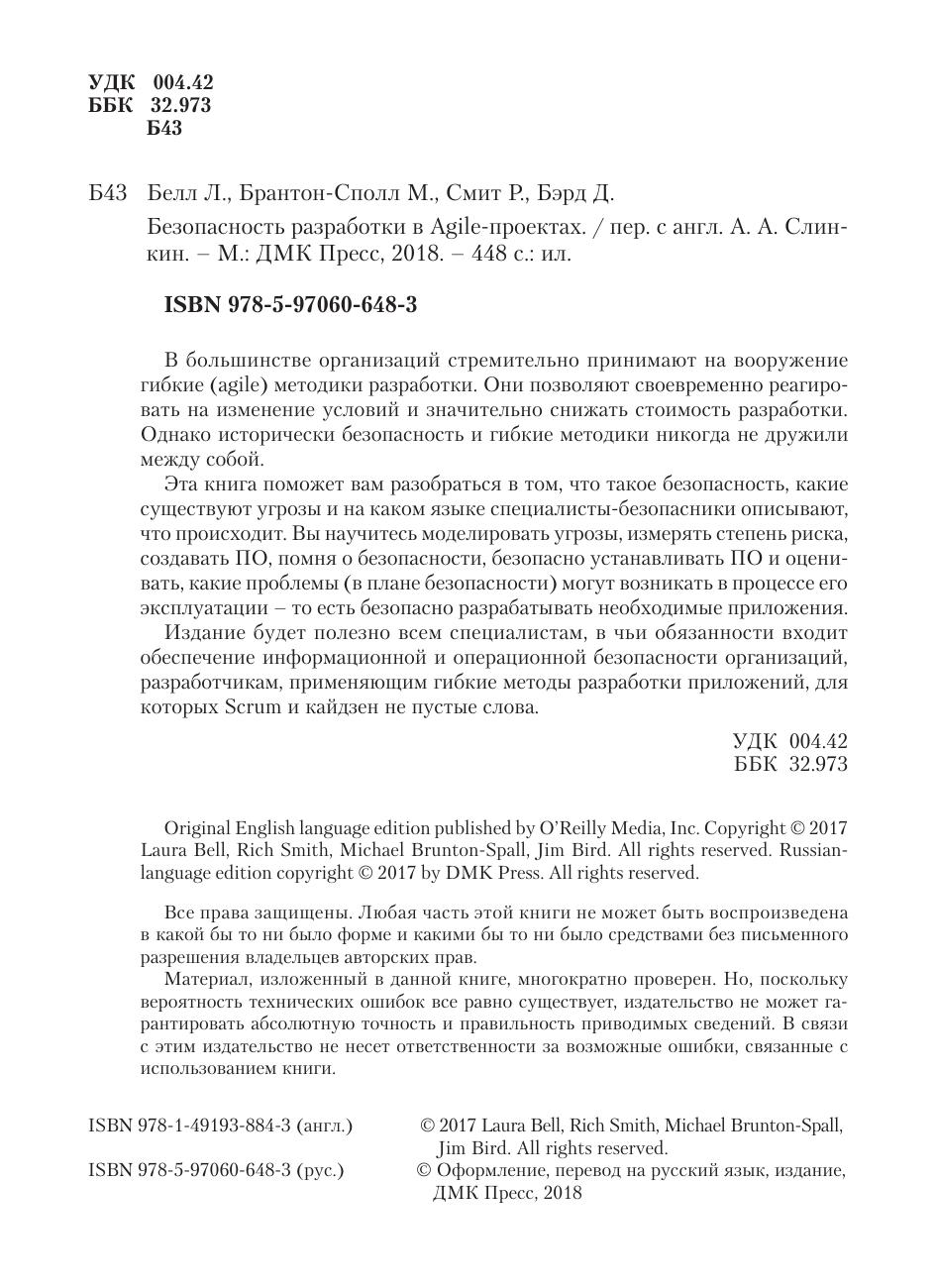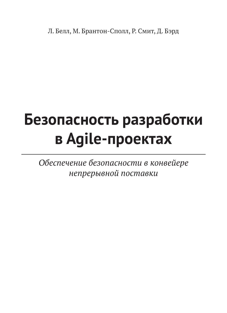 В большинстве организаций стремительно принимают на вооружение гибкие (agile) методики разработки. Они позволяют своевременно реагировать на изменение условий и значительно снижать стоимость разработки. Однако исторически безопасность и гибкие методики никогда не дружили между собой. Эта книга поможет вам разобраться в том, что такое безопасность, какие существуют угрозы и на каком языке специалисты-безопасники описывают, что происходит. Вы научитесь моделировать угрозы, измерять степень риска, создавать ПО постоянно помня о безопасности. Издание будет полезно всем специалистам, в чьи обязанности входит обеспечение информационной и операционной безопасности организаций, разработчикам, применяющие гибкие методы разработки приложений, для которых Scrum и кайдзен не пустые слова.
