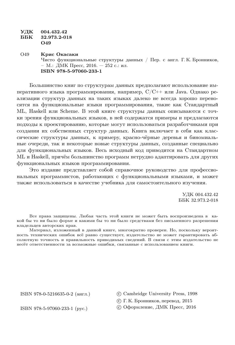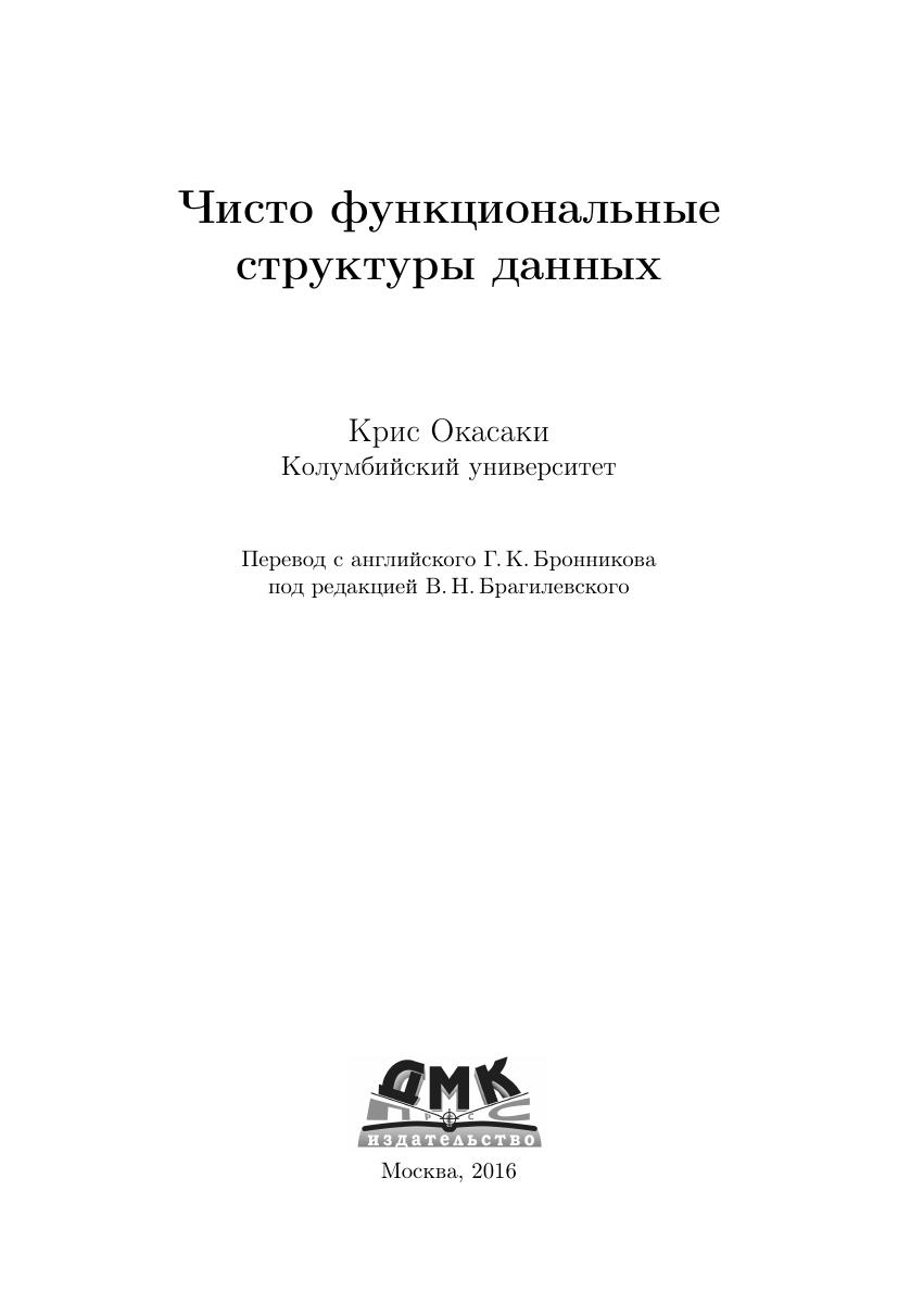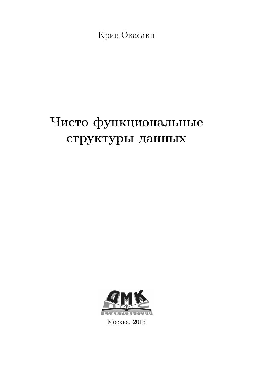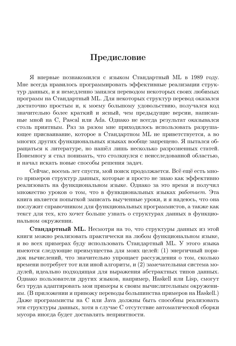 Большинство книг по структурам данных предполагают использование императивного языка программирования, например, C/C++ или Java. Однако реализации структур данных на таких языках далеко не всегда хорошо переносятся на функциональные языки программирования, такие как Стандартный ML, Haskell или Scheme. В этой книге структуры данных описываются с точки зрения функциональных языков, в ней содержатся примеры и предлагаются подходы к проектированию, которые могут использоваться разработчиками при создании их собственных структур данных. Книга включает в себя как классические структуры данных, к примеру, красно-чёрные деревья и биномиальные очереди, так и некоторые новые структуры данных, созданные специально для функциональных языков. Весь исходный код приводится на Стандартном ML и Haskell, причём большинство программ нетрудно адаптировать для других функциональных языков программирования. Это издание представляет собой справочное руководство для профессиональных программистов, работающих с функциональными языками, и может также использоваться в качестве учебника для самостоятельного изучения.