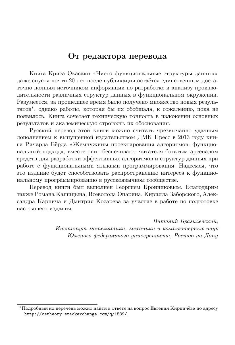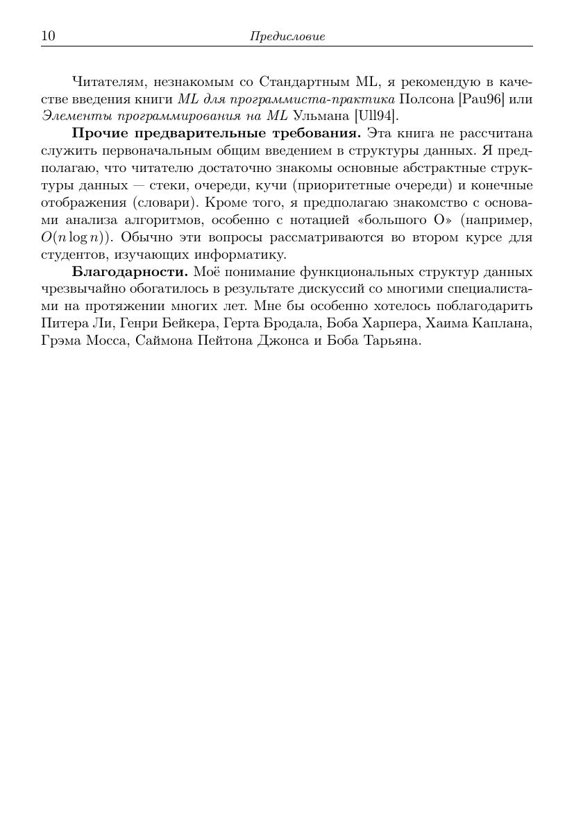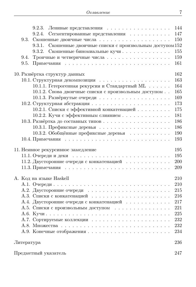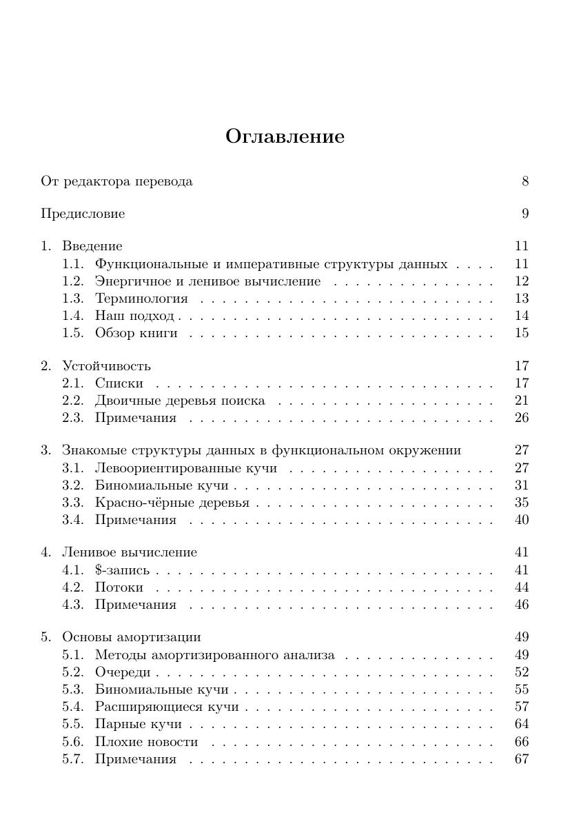 Большинство книг по структурам данных предполагают использование императивного языка программирования, например, C/C++ или Java. Однако реализации структур данных на таких языках далеко не всегда хорошо переносятся на функциональные языки программирования, такие как Стандартный ML, Haskell или Scheme. В этой книге структуры данных описываются с точки зрения функциональных языков, в ней содержатся примеры и предлагаются подходы к проектированию, которые могут использоваться разработчиками при создании их собственных структур данных. Книга включает в себя как классические структуры данных, к примеру, красно-чёрные деревья и биномиальные очереди, так и некоторые новые структуры данных, созданные специально для функциональных языков. Весь исходный код приводится на Стандартном ML и Haskell, причём большинство программ нетрудно адаптировать для других функциональных языков программирования. Это издание представляет собой справочное руководство для профессиональных программистов, работающих с функциональными языками, и может также использоваться в качестве учебника для самостоятельного изучения.
