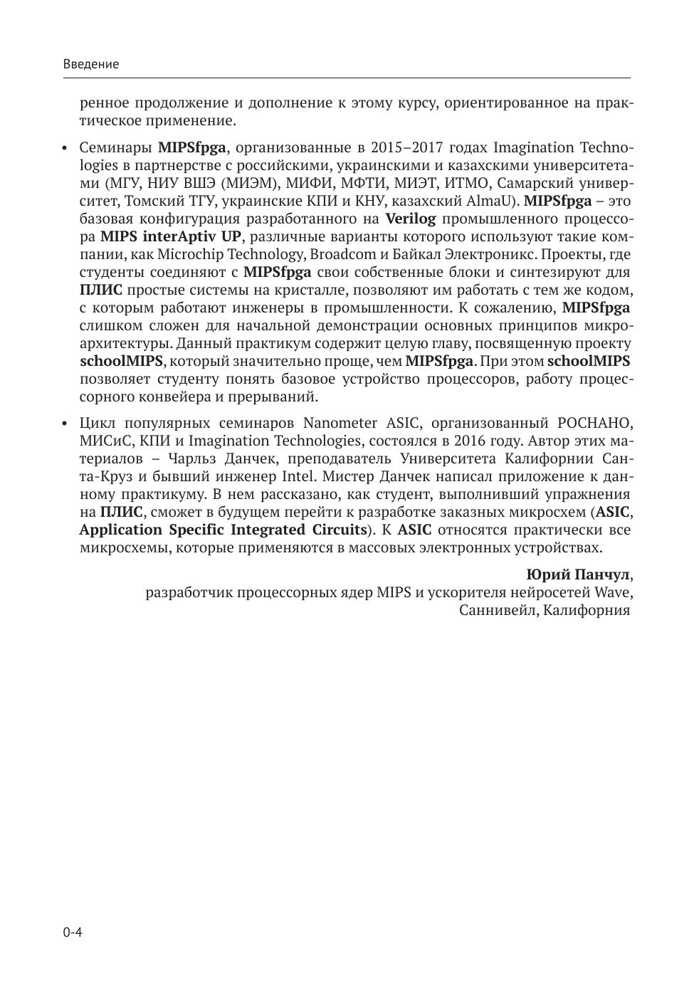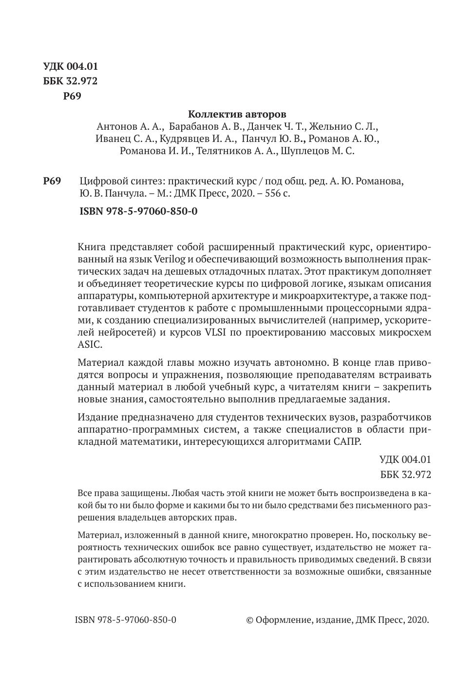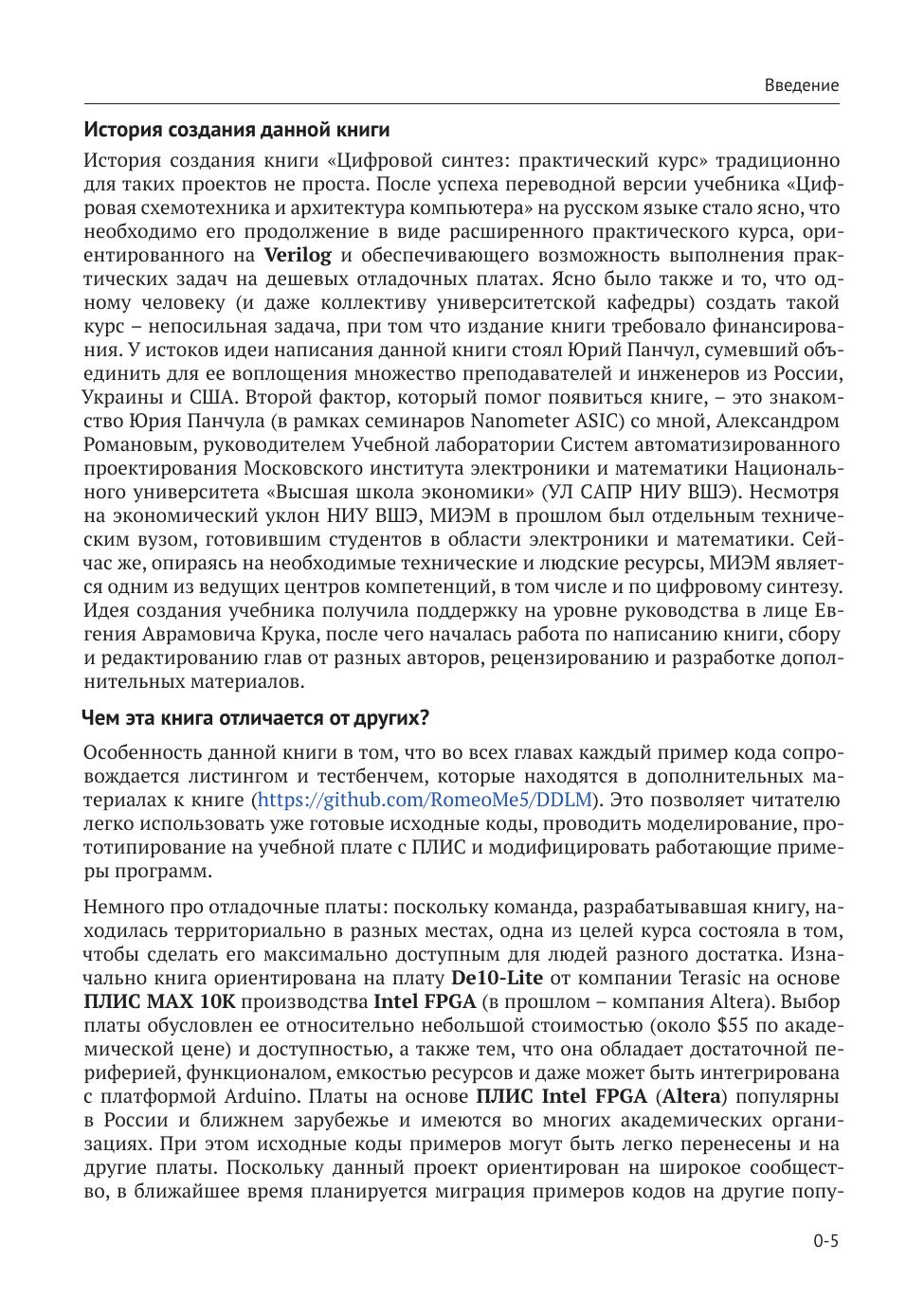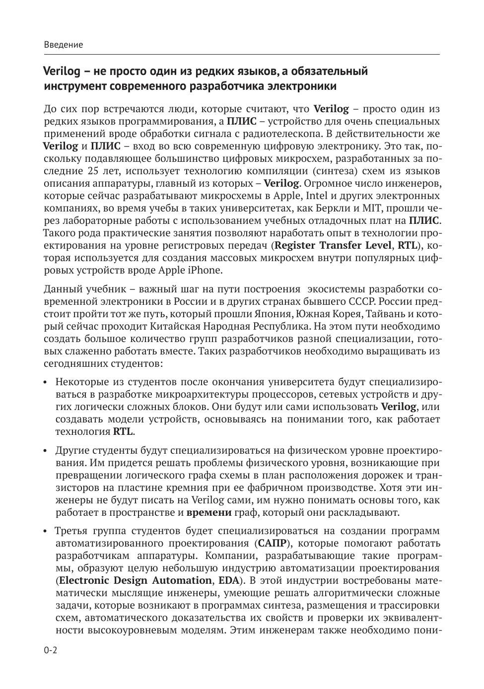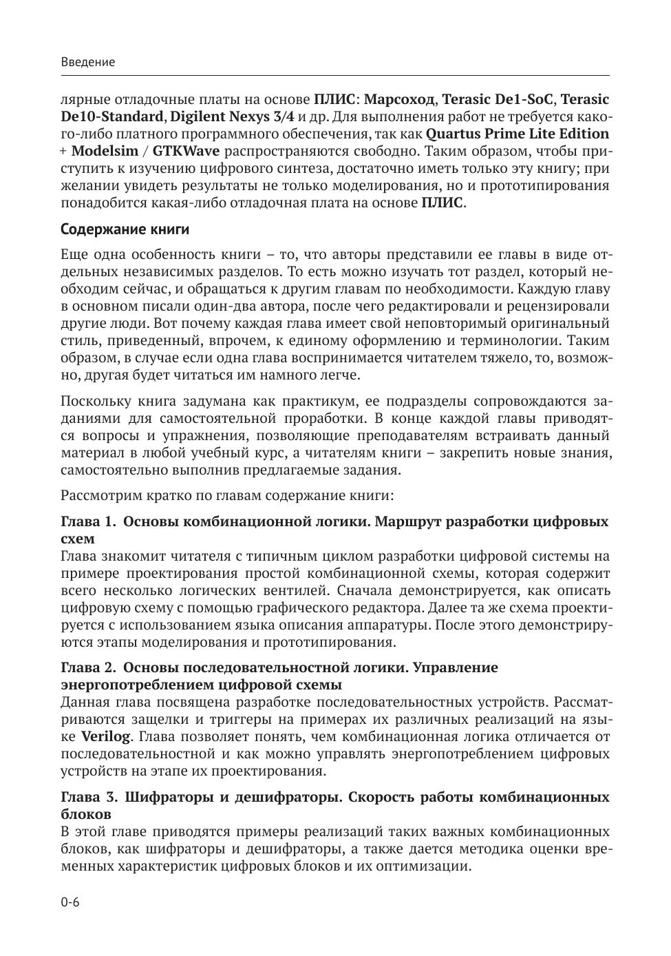 Преимущество книги состоит в том, что изучение Verilog построено не на традиционном академическом заучивании инструкций и ко-манд языка, а на знакомстве с основными элементами цифровой электроники и подробными примерами того, как их описывать; при этом представленный материал сопровождается исчерпывающим набором презентаций и готовых примеров кода на сайте изда-тельства, которые могут быть запущены на любой популярной отладочной плате с ПЛИС.