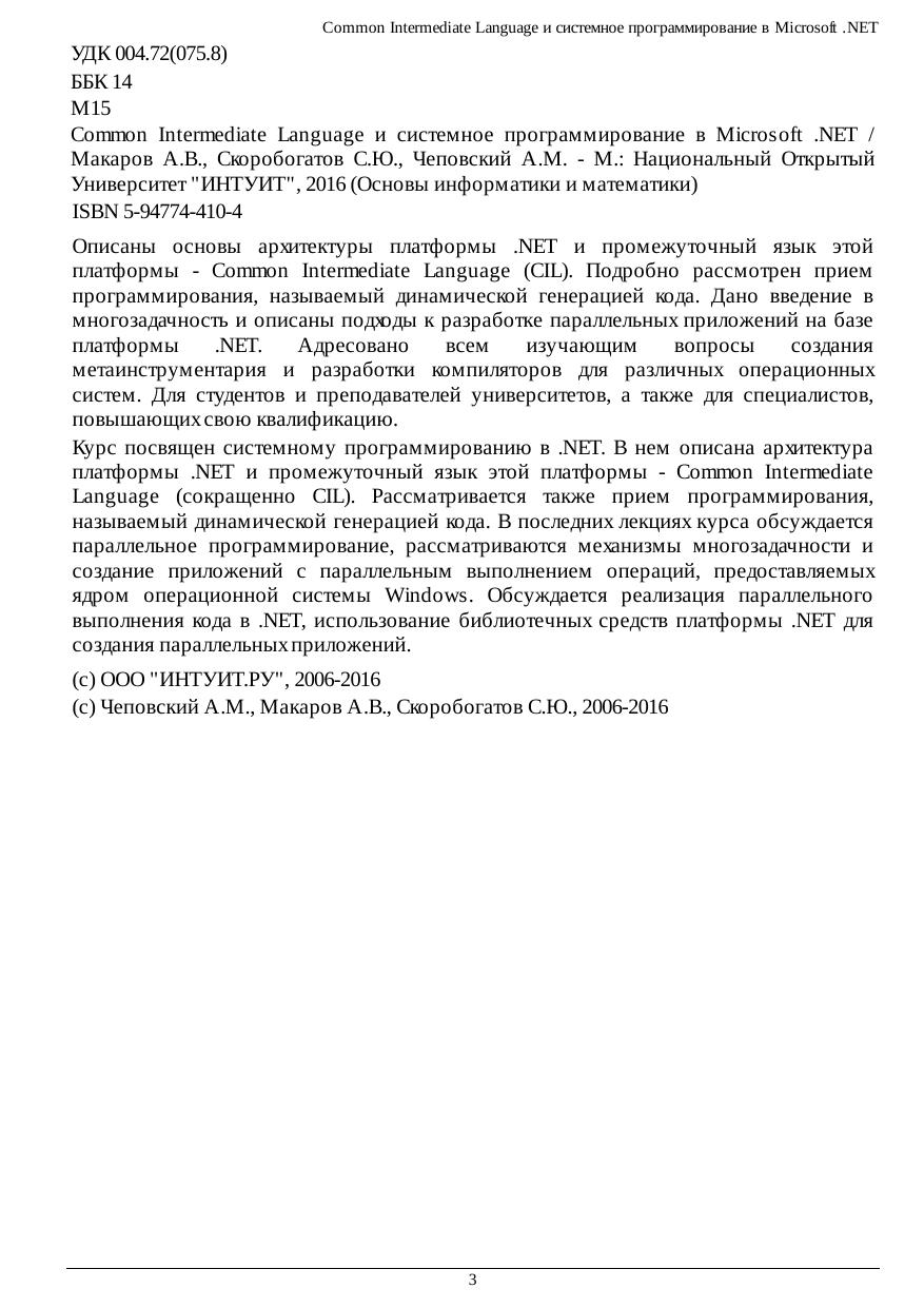 платформы .NET и промежуточный язык этой платформы - Common Intermediate Language (сокращенно CIL). Рассматривается также прием программирования, называемый динамической генерацией кода. В последних лекциях курса обсуждается параллельное программирование, рассматриваются механизмы многозадачности и создание приложений с параллельным выполнением операций, предоставляемых ядром операционной системы Windows. Обсуждается реализация параллельного выполнения кода в .NET, использование библиотечных средств платформы .NET для