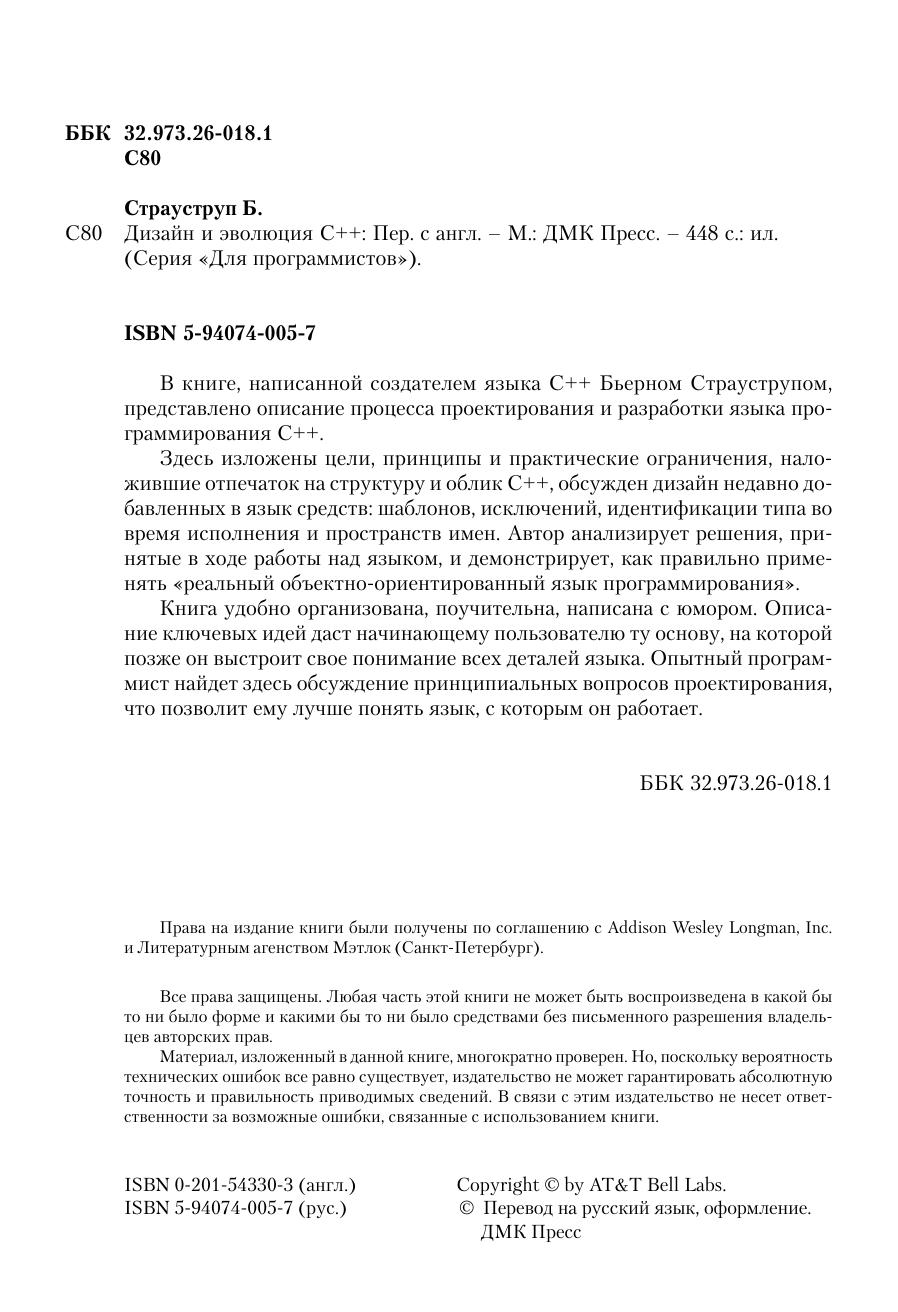 В книге, написанной создателем языка C++ Бьерном Страуструпом, представлено описание процесса проектирования и разработки языка программирования C++. Здесь изложены цели, принципы и практические ограничения, наложившие отпечаток на структуру и облик C++, обсужден дизайн недавно добавленных в язык средств: шаблонов, исключений, идентификации типа во время исполнения и пространств имен. Автор анализирует решения, принятые в ходе работы над языком, и демонстрирует, как правильно применять «реальный объектно#ориентированный язык программирования». Книга удобно организована, поучительна, написана с юмором. Описание ключевых идей даст начинающему пользователю ту основу, на которой позже он выстроит свое понимание всех деталей языка. Опытный программист найдет здесь обсуждение принципиальных вопросов проектирования, что позволит ему лучше понять язык, с которым он работает.