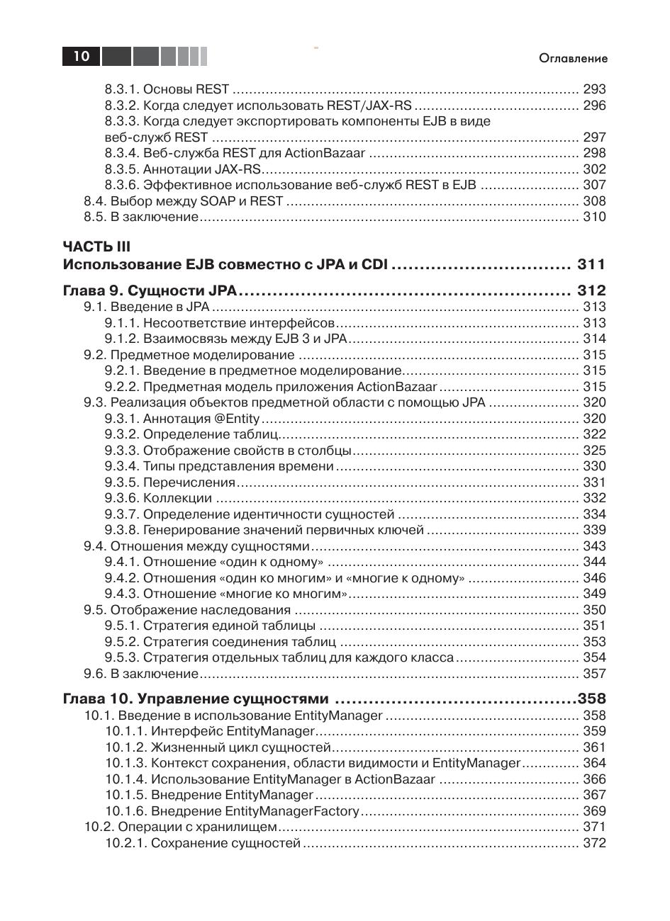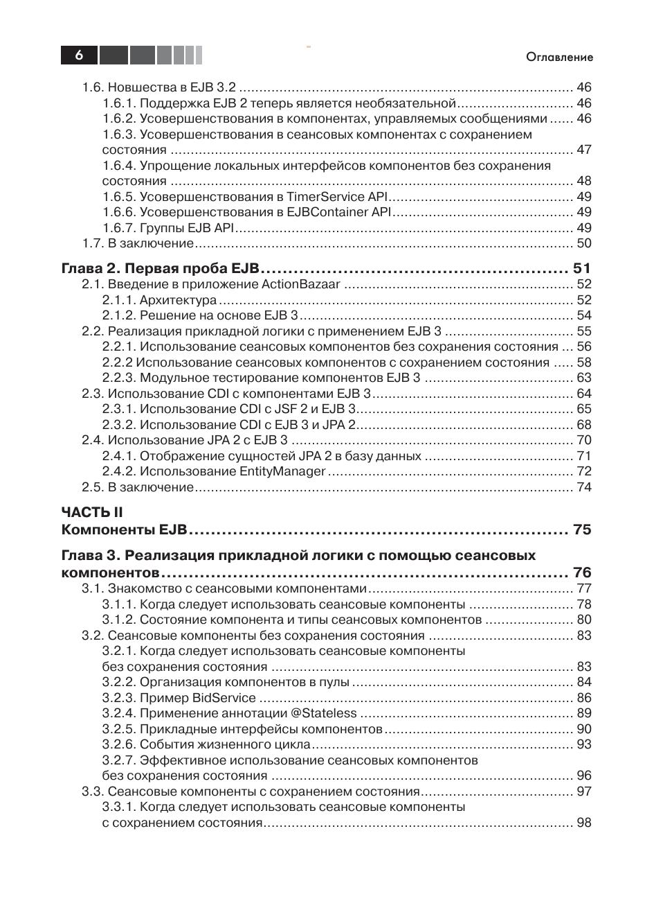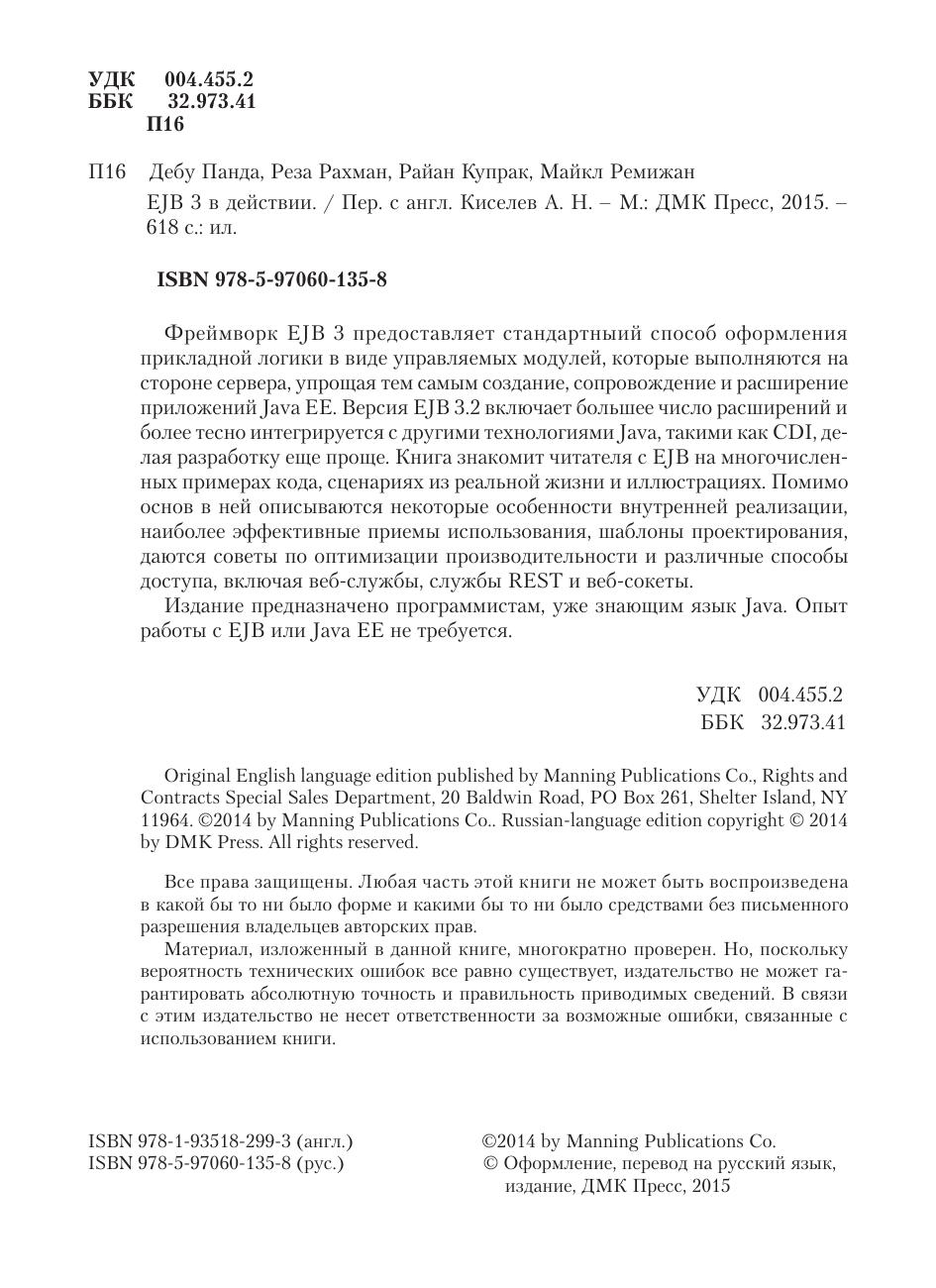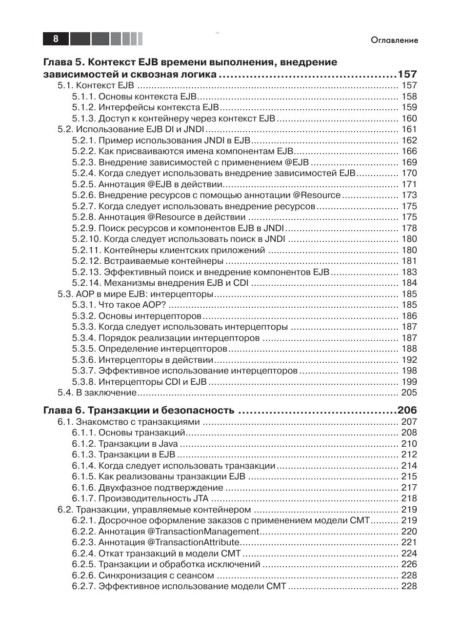 Фреймворк EJB 3 предоставляет стандартныий способ оформления прикладной логики в виде управляемых модулей, которые выполняются на стороне сервера, упрощая тем самым создание, сопровождение и расширение приложений Java EE. Версия EJB 3.2 включает большее число расширений и более тесно интегрируется с другими технологиями Java, такими как CDI, делая разработку еще проще. Книга знакомит читателя с EJB на многочисленных примерах кода, сценариях из реальной жизни и иллюстрациях. Помимо основ в ней описываются некоторые особенности внутренней реализации, наиболее эффективные приемы использования, шаблоны проектирования, даются советы по оптимизации производительности и различные способы доступа, включая веб-службы, службы REST и веб-сокеты. Издание предназначено программистам, уже знающим язык Java. Опыт работы с EJB или Java EE не требуется.