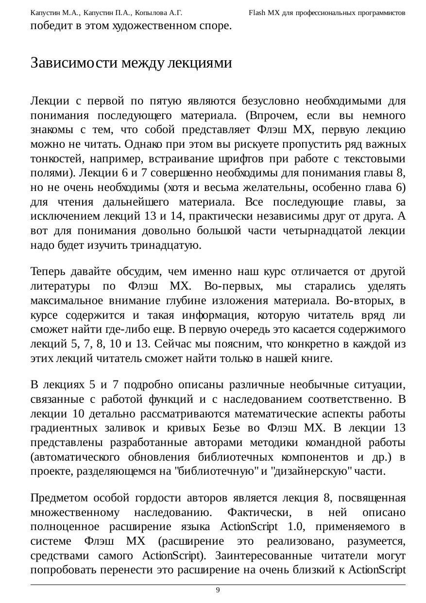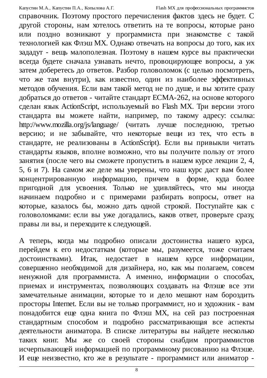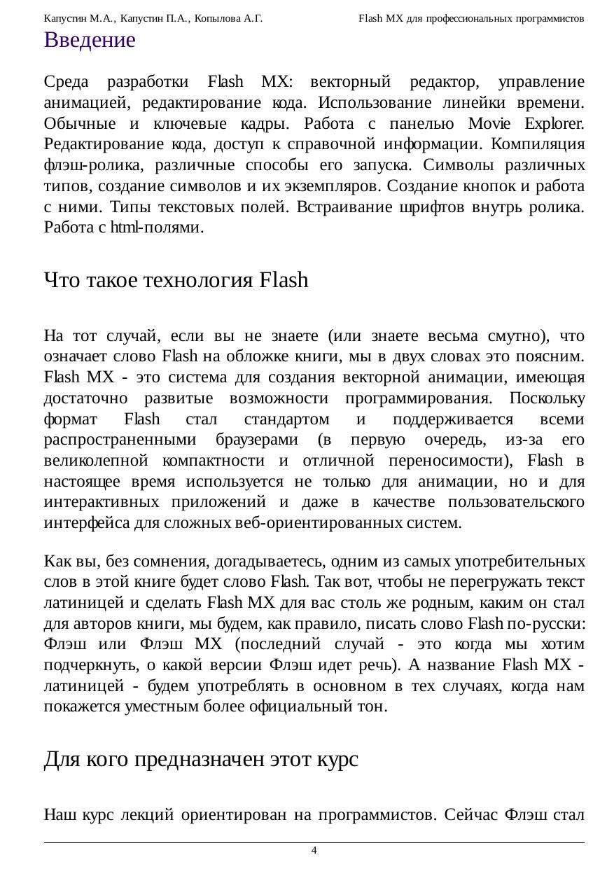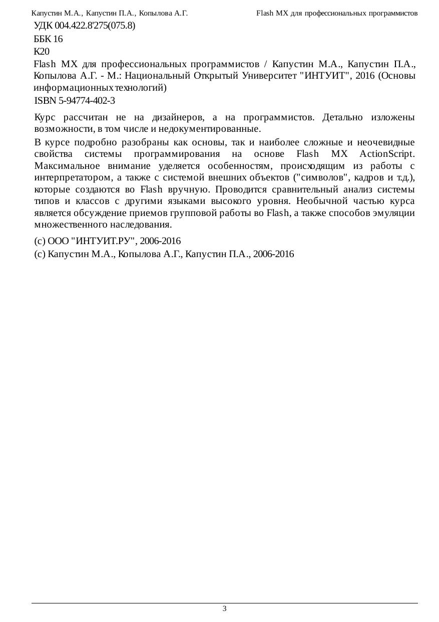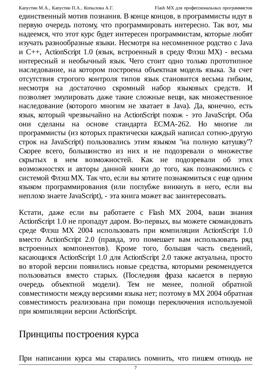 типов и классов с другими языками высокого уровня. Необычной частью курса является обсуждение приемов групповой работы во Flash, а также способов эмуляции множественного наследования.