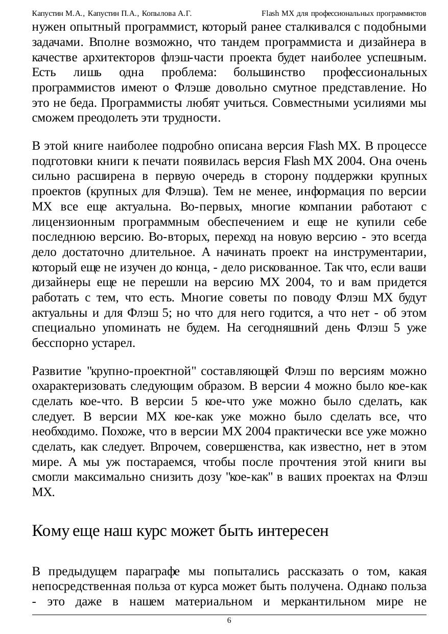 Курс рассчитан не на дизайнеров, а на программистов. Детально изложены возможности, в том числе и недокументированные. В курсе подробно разобраны как основы, так и наиболее сложные и неочевидные свойства системы программирования на основе Flash MX ActionScript. Максимальное внимание уделяется особенностям, происходящим из работы с