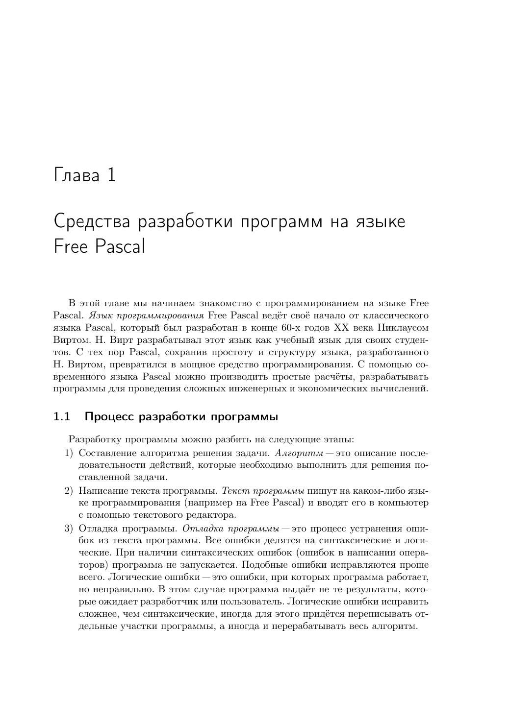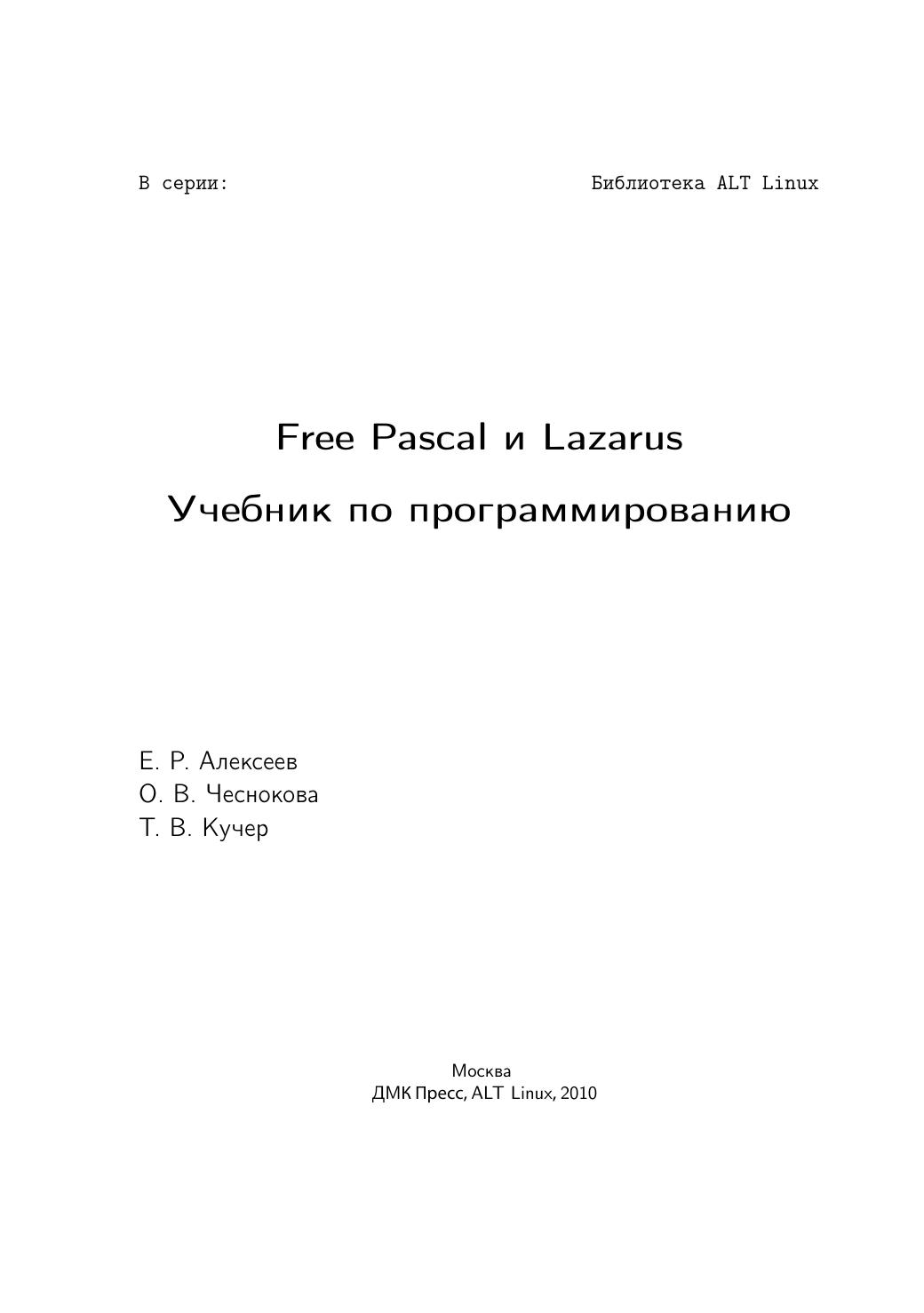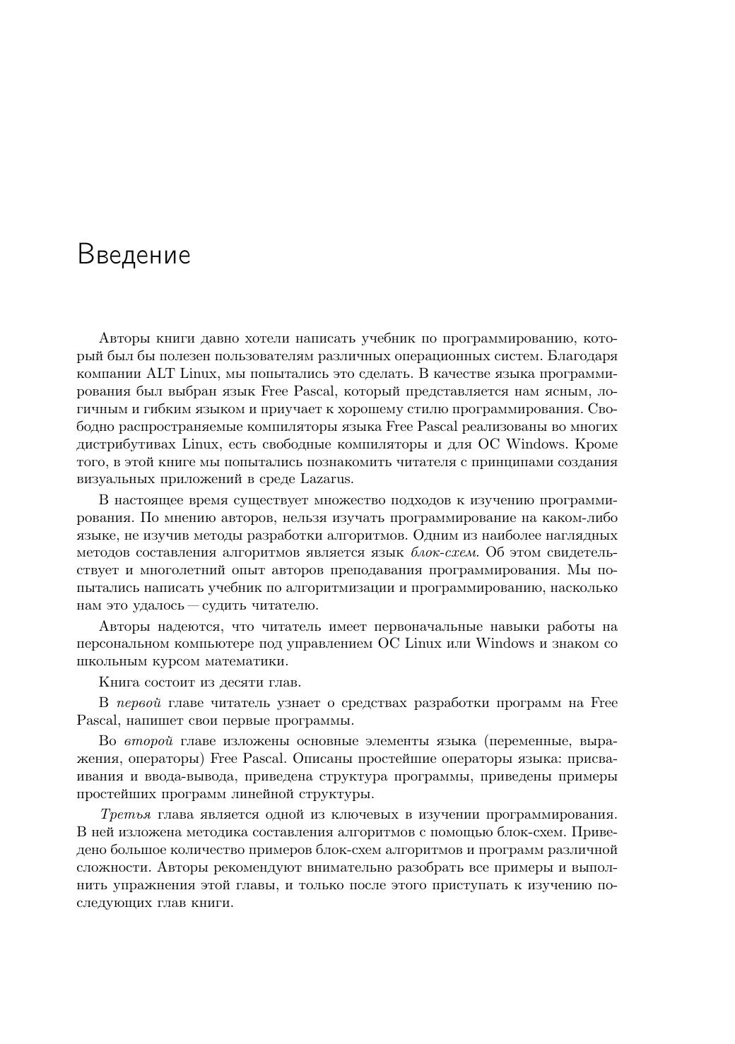 Free Pascal - свободная реализация языка Паскаль, совместимая с Borland Pascal и Object Pascal Delphi, но при этом обладающая и некоторыми дополнительными возможностями. Свободный компилятор Free Pascal - кросплатформенный продукт, реализованный, в частности, для операционных систем Linux и Windows. Данная книга представляет собой учебник по алгоритмизации и программированию на основе языка Free Pascal. Кроме того, читатель познакомится с принципами создания визуальных приложений в среде Lazarus. К каждой теме прилагаются 25 вариантов задач для самостоятельного решения, что позволит использовать книгу не только начинающим самостоятельно изучать программирование, но и преподавателям в учебном процессе. Книга адресована преподавателям и учащимся средних и высших учебных заведений, а также широкому кругу читателей, интересующихся программированием.