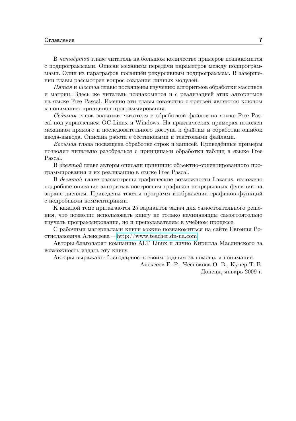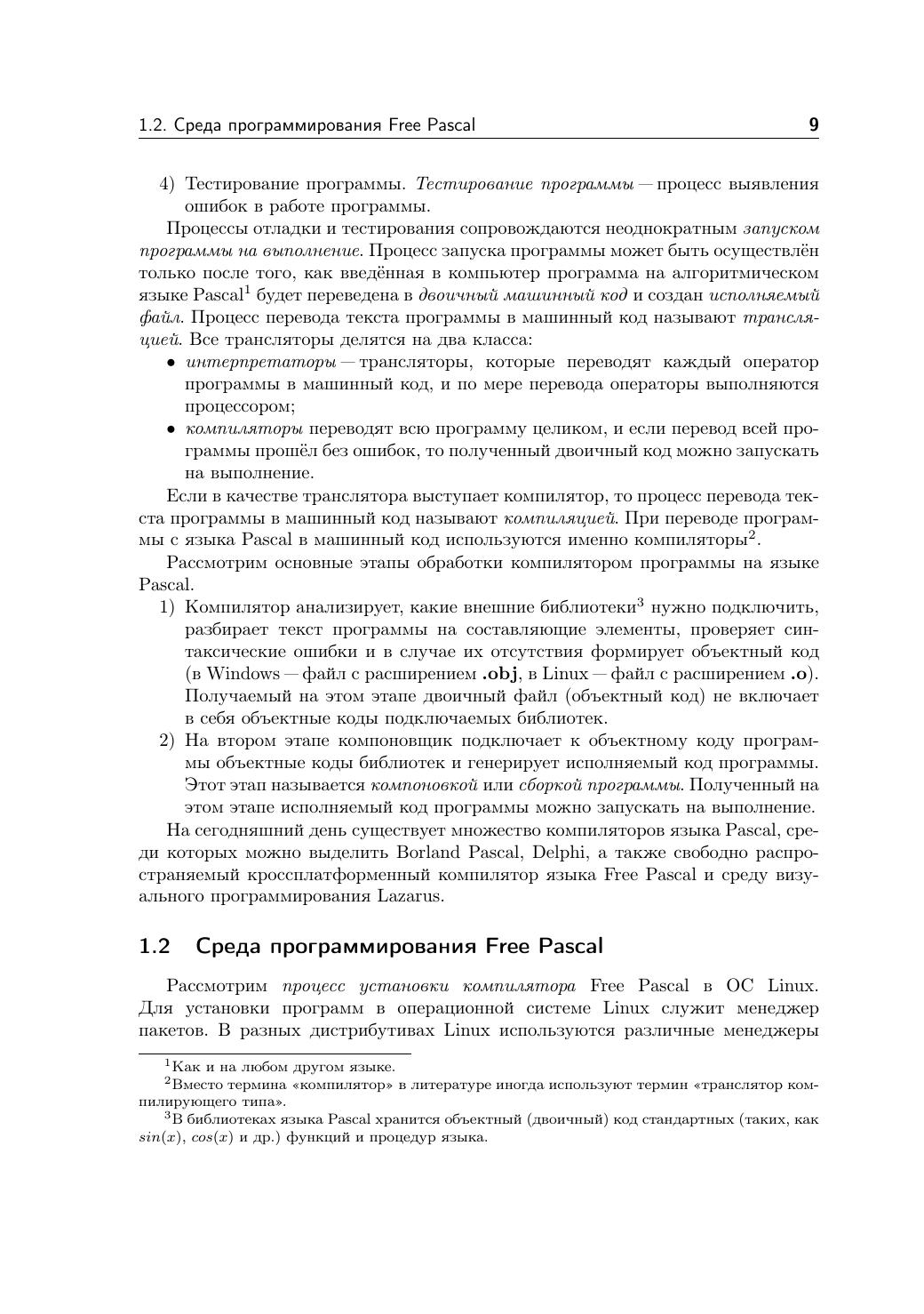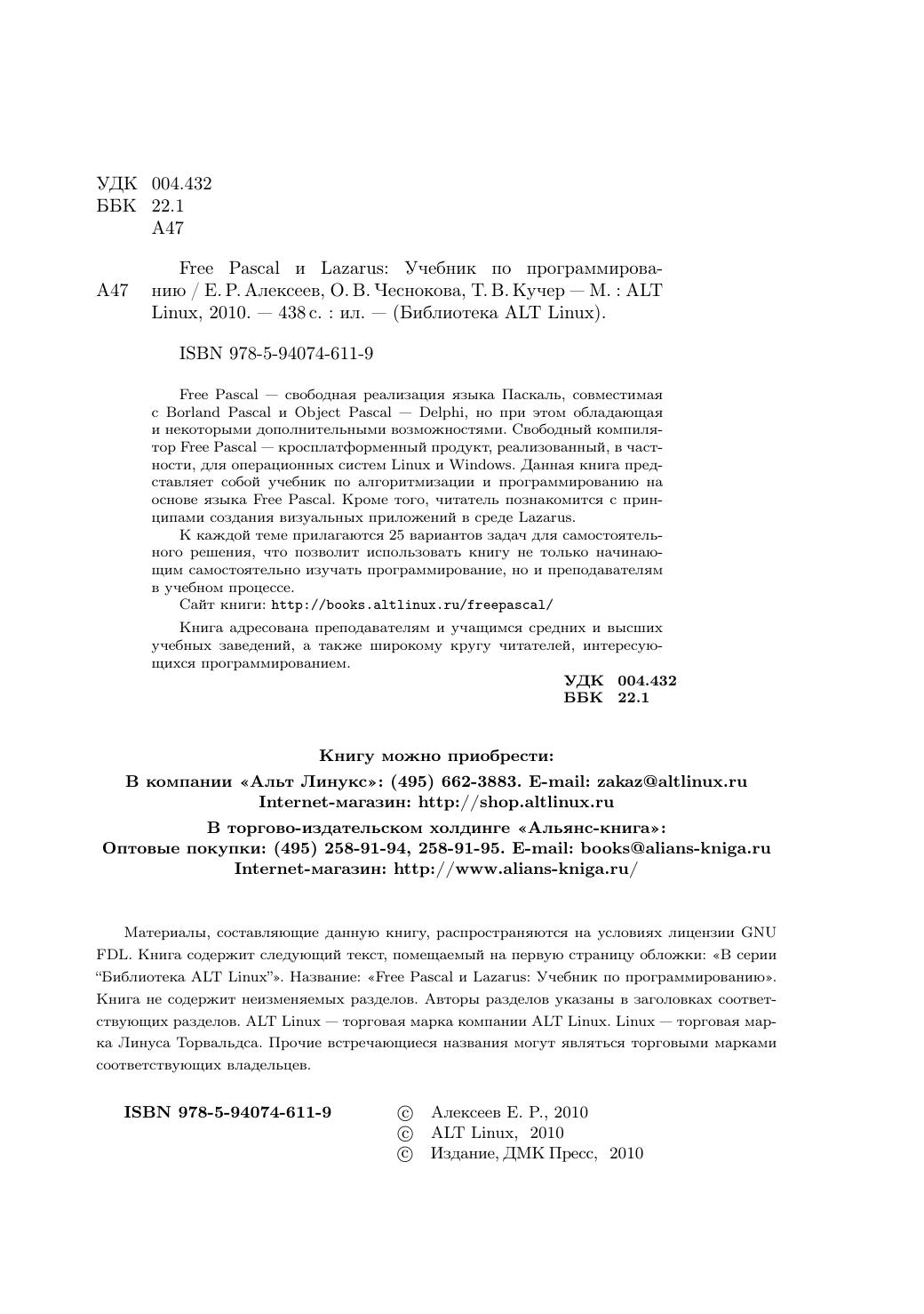 Free Pascal - свободная реализация языка Паскаль, совместимая с Borland Pascal и Object Pascal Delphi, но при этом обладающая и некоторыми дополнительными возможностями. Свободный компилятор Free Pascal - кросплатформенный продукт, реализованный, в частности, для операционных систем Linux и Windows. Данная книга представляет собой учебник по алгоритмизации и программированию на основе языка Free Pascal. Кроме того, читатель познакомится с принципами создания визуальных приложений в среде Lazarus. К каждой теме прилагаются 25 вариантов задач для самостоятельного решения, что позволит использовать книгу не только начинающим самостоятельно изучать программирование, но и преподавателям в учебном процессе. Книга адресована преподавателям и учащимся средних и высших учебных заведений, а также широкому кругу читателей, интересующихся программированием.