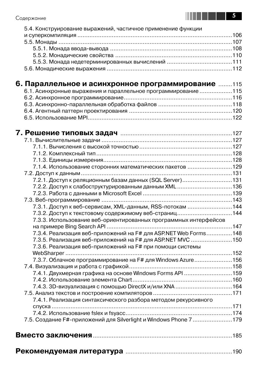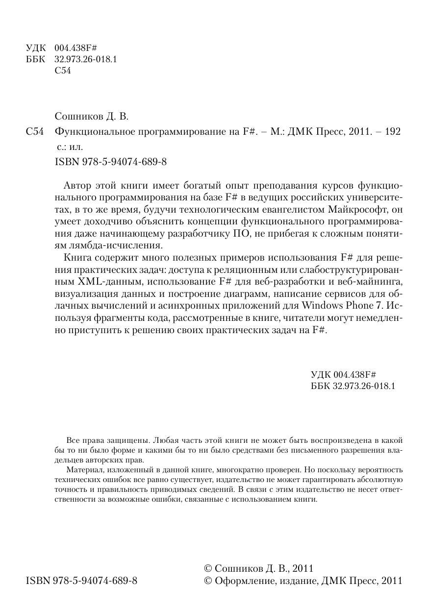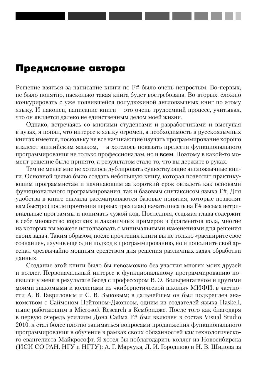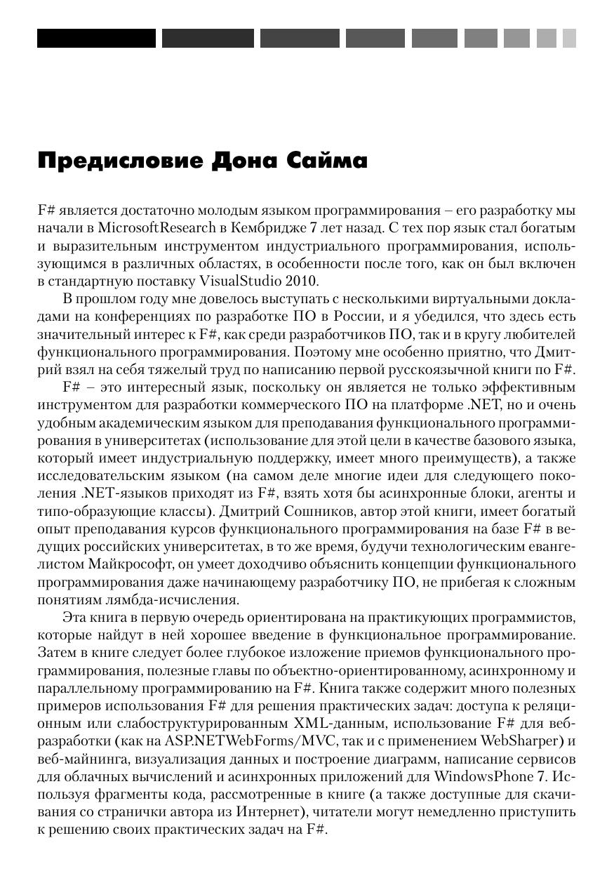Автор этой книги имеет богатый опыт преподавания курсов функционального программирования на базе F# в ведущих российских университетах, в то же время, будучи технологическим евангелистом Майкрософт, он умеет доходчиво объяснить концепции функционального программирования даже начинающему разработчику ПО, не прибегая к сложным понятиям лямбда-исчисления. Книга содержит много полезных примеров использования F# для решения практических задач: доступа к реляционным или слабоструктурированным XML-данным, использование F# для веб-разработки и веб-майнинга, визуализация данных и построение диаграмм, написание сервисов для облачных вычислений и асинхронных приложений для Windows Phone 7. Используя фрагменты кода, рассмотренные в книге, читатели могут немедленно приступить к решению своих практических задач на F#.