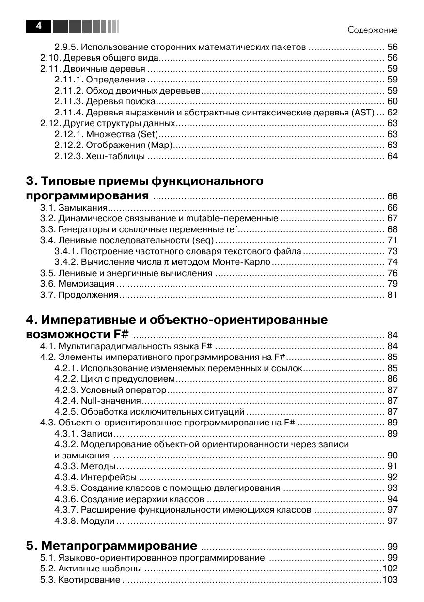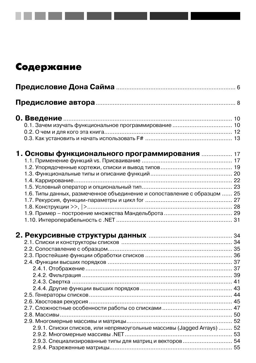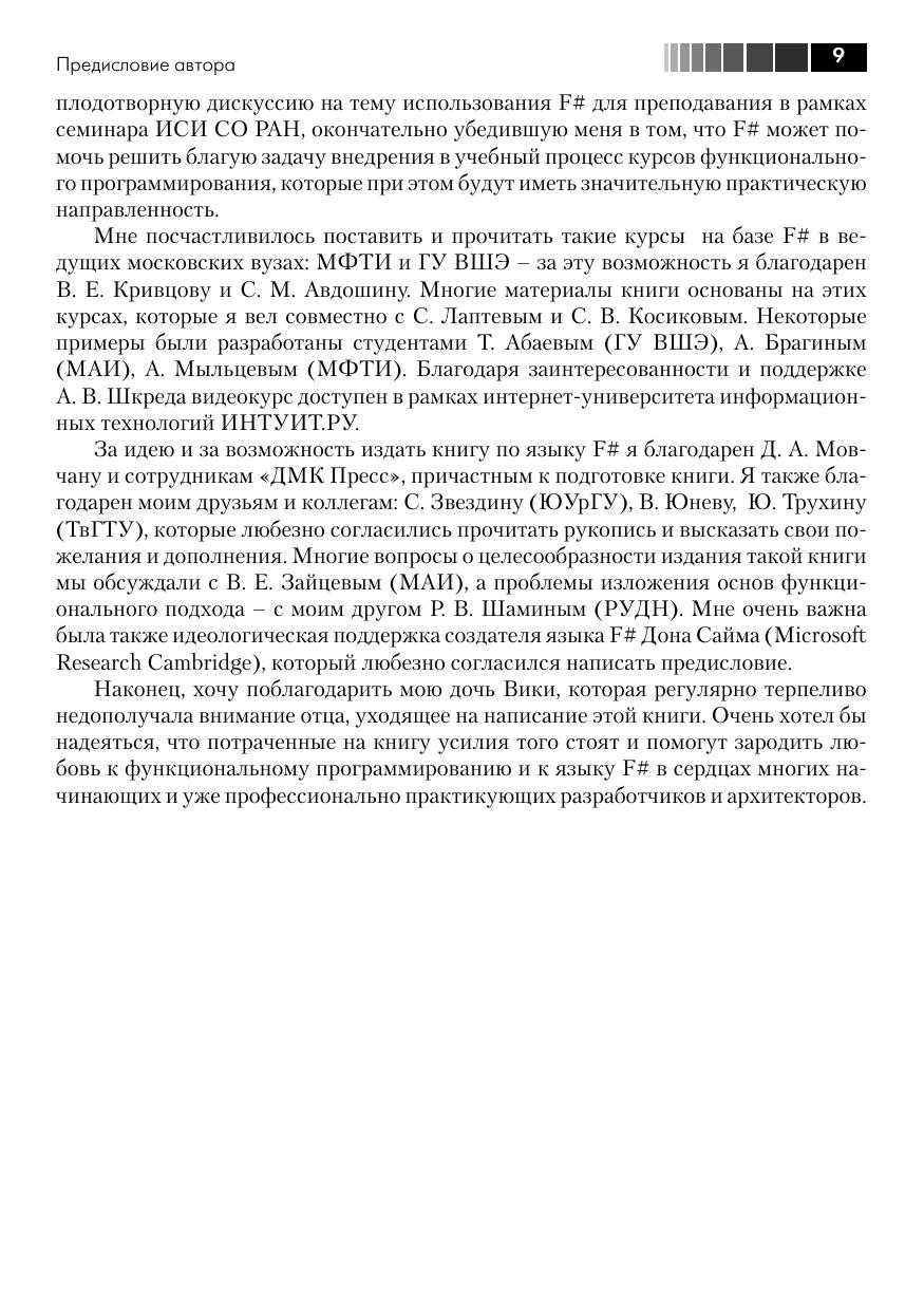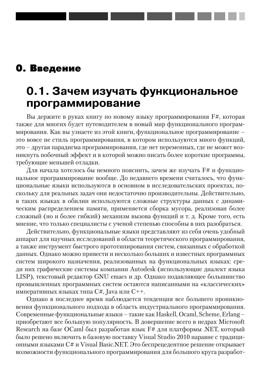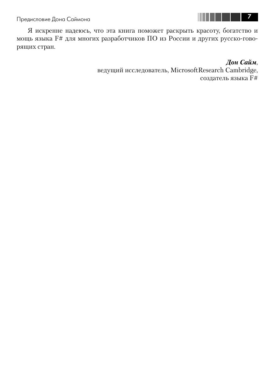 Автор этой книги имеет богатый опыт преподавания курсов функционального программирования на базе F# в ведущих российских университетах, в то же время, будучи технологическим евангелистом Майкрософт, он умеет доходчиво объяснить концепции функционального программирования даже начинающему разработчику ПО, не прибегая к сложным понятиям лямбда-исчисления. Книга содержит много полезных примеров использования F# для решения практических задач: доступа к реляционным или слабоструктурированным XML-данным, использование F# для веб-разработки и веб-майнинга, визуализация данных и построение диаграмм, написание сервисов для облачных вычислений и асинхронных приложений для Windows Phone 7. Используя фрагменты кода, рассмотренные в книге, читатели могут немедленно приступить к решению своих практических задач на F#.