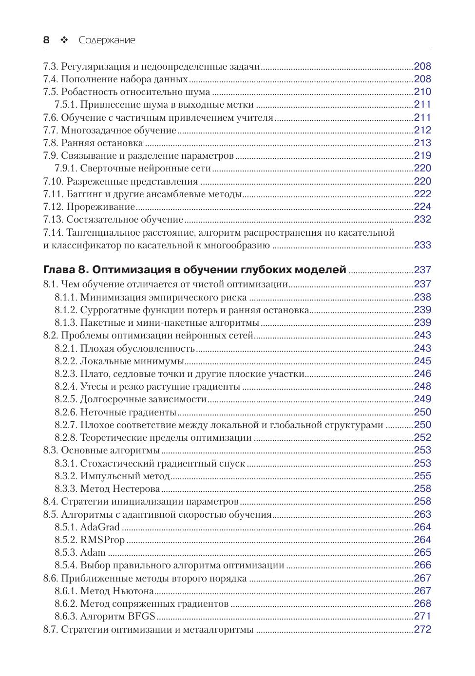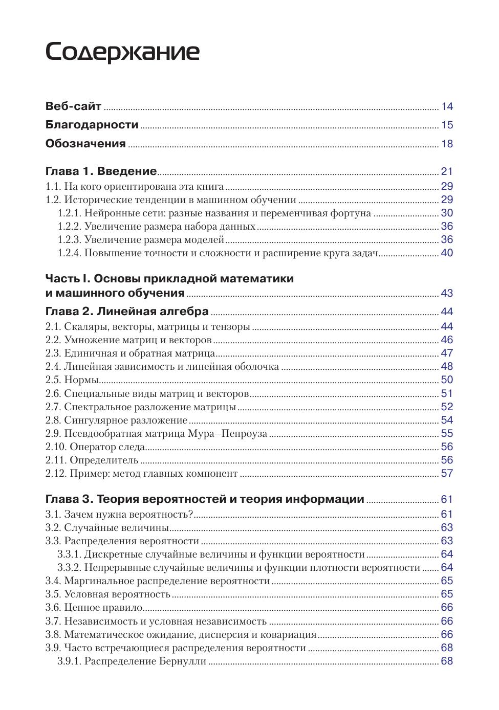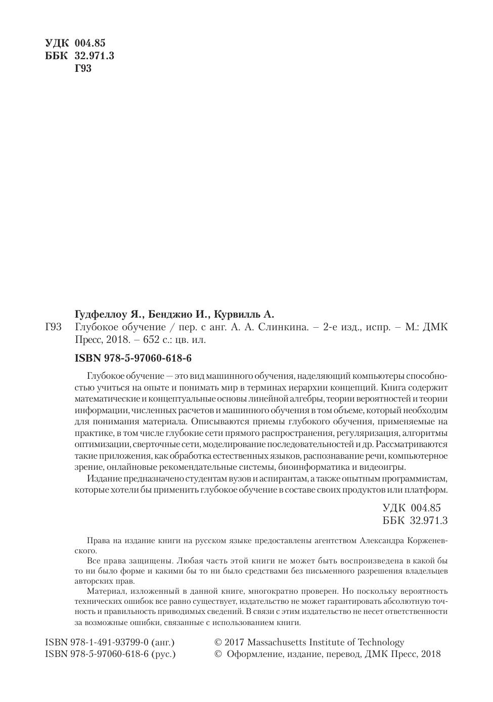 Глубокое обучение — это вид машинного обучения, наделяющий компьютеры способностью учиться на опыте и понимать мир в терминах иерархии концепций. Книга содержит математические и концептуальные основы линейной алгебры, теории вероятностей и теории информации, численных расчетов и машинного обучения в том объеме, который необходим для понимания материала. Описываются приемы глубокого обучения, применяемые на практике, в том числе глубокие сети прямого распространения, регуляризация, алгоритмы оптимизации, сверточные сети, моделирование последовательностей и др. Рассматриваются такие приложения, как обработка естественных языков, распознавание речи, компьютерное зрение, онлайновые рекомендательные системы, биоинформатика и видеоигры. Издание предназначено студентам вузов и аспирантам, а также опытным программистам, которые хотели бы применить глубокое обучение в составе своих продуктов или платформ.