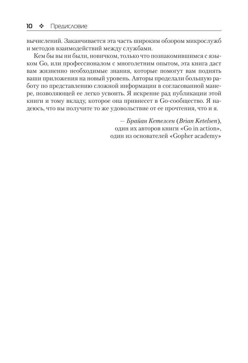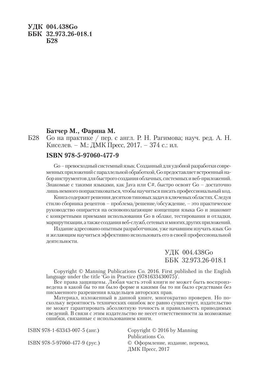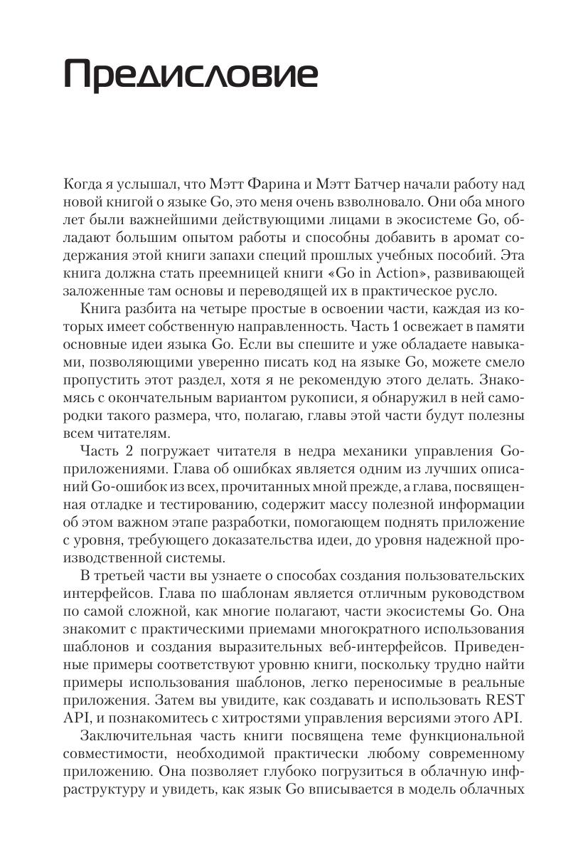 Go – превосходный системный язык. Созданный для удобной разработки современных приложений с параллельной обработкой, Go предоставляет встроенный набор инструментов для быстрого создания облачных, системных и веб-приложений. Знакомые с такими языками, как Java или C#, быстро освоят Go – достаточно лишь немного попрактиковаться, чтобы научиться писать профессиональный код. Книга содержит решения десятков типовых задач в ключевых областях. Следуя стилю сборника рецептов – проблема/решение/обсуждение, – это практическое руководство опирается на основополагающие концепции языка Go и знакомит с конкретными приемами использования Go в облаке, тестирования и отладки, маршрутизации, а также создания веб-служб, сетевых и многих других приложений. Издание адресовано опытным разработчикам, уже начавшим изучать язык Go и желающим научиться эффективно использовать его в своей профессиональной деятельности.