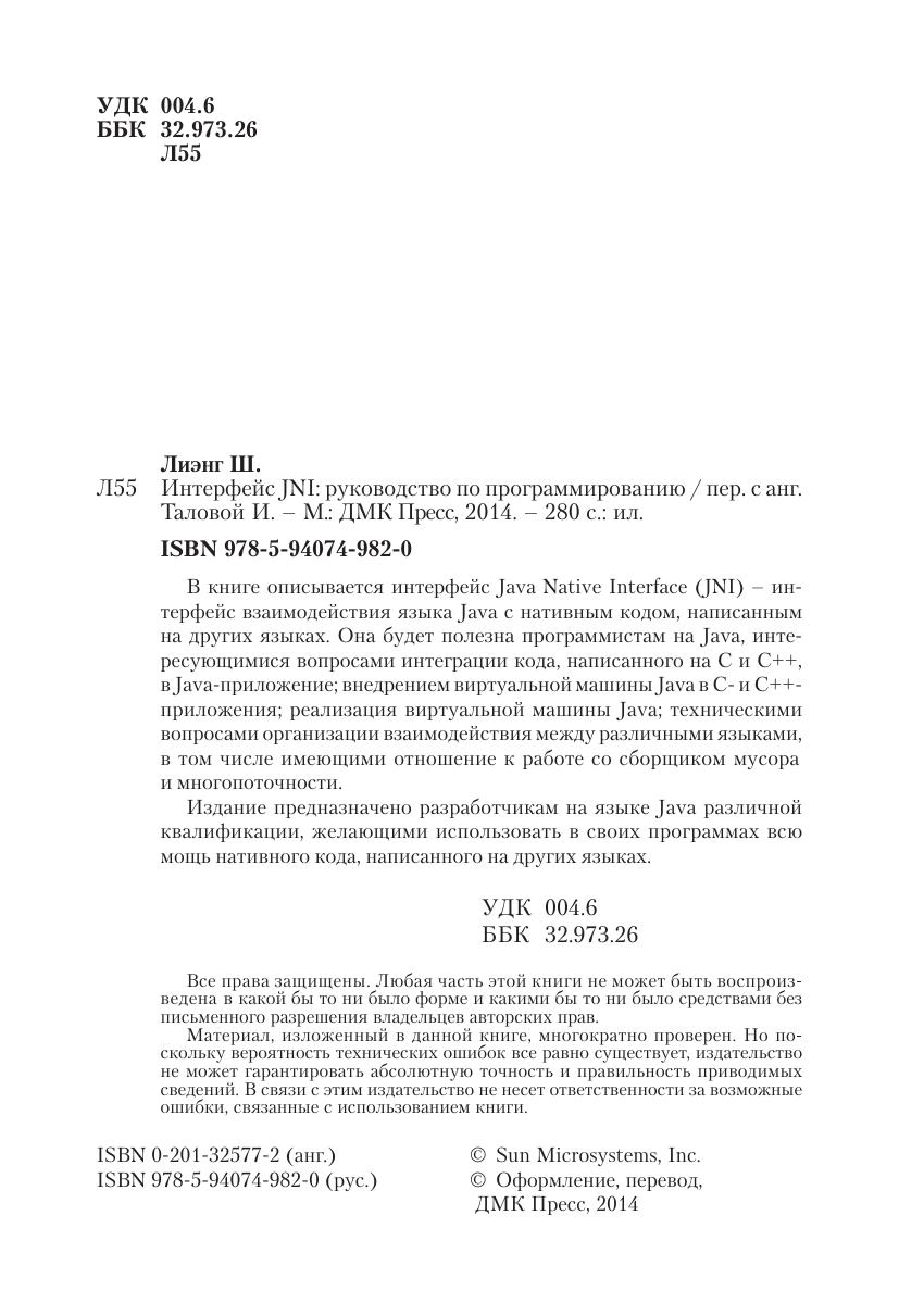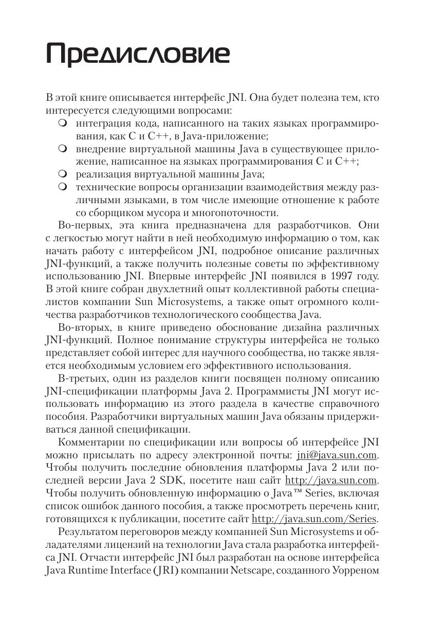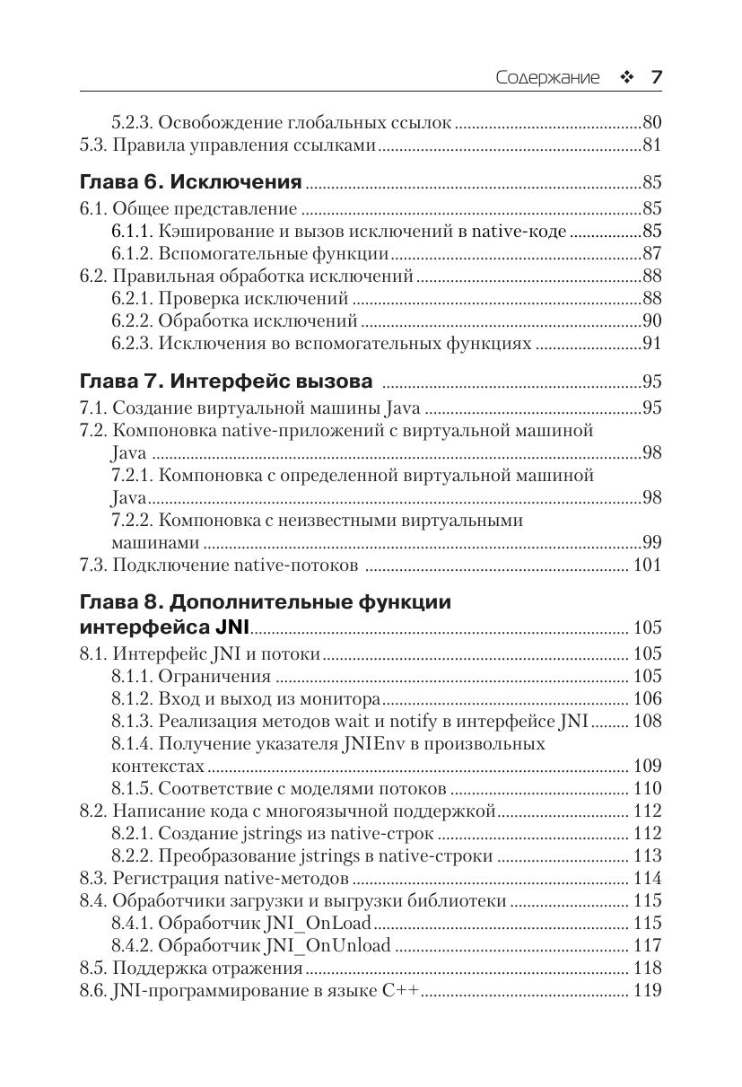 В книге описывается интерфейс Java Native Interface (JNI) – интерфейс взаимодействия языка Java с нативным кодом, написанным на других языках. Она будет полезна программистам на Java, интересующимися вопросами интеграции кода, написанного на C и С++, в Java-приложение, внедрением виртуальной машины Java в С- и С++- приложения, реализация виртуальной машины Java, техническими вопросами организации взаимодействия между различными языками, в том числе имеющими отношение к работе со сборщиком мусора и многопоточности. Издание предназначено разработчикам на языке Java различной квалификации, желающими использовать в своих программах всю мощь нативного кода, написанного на других языках.