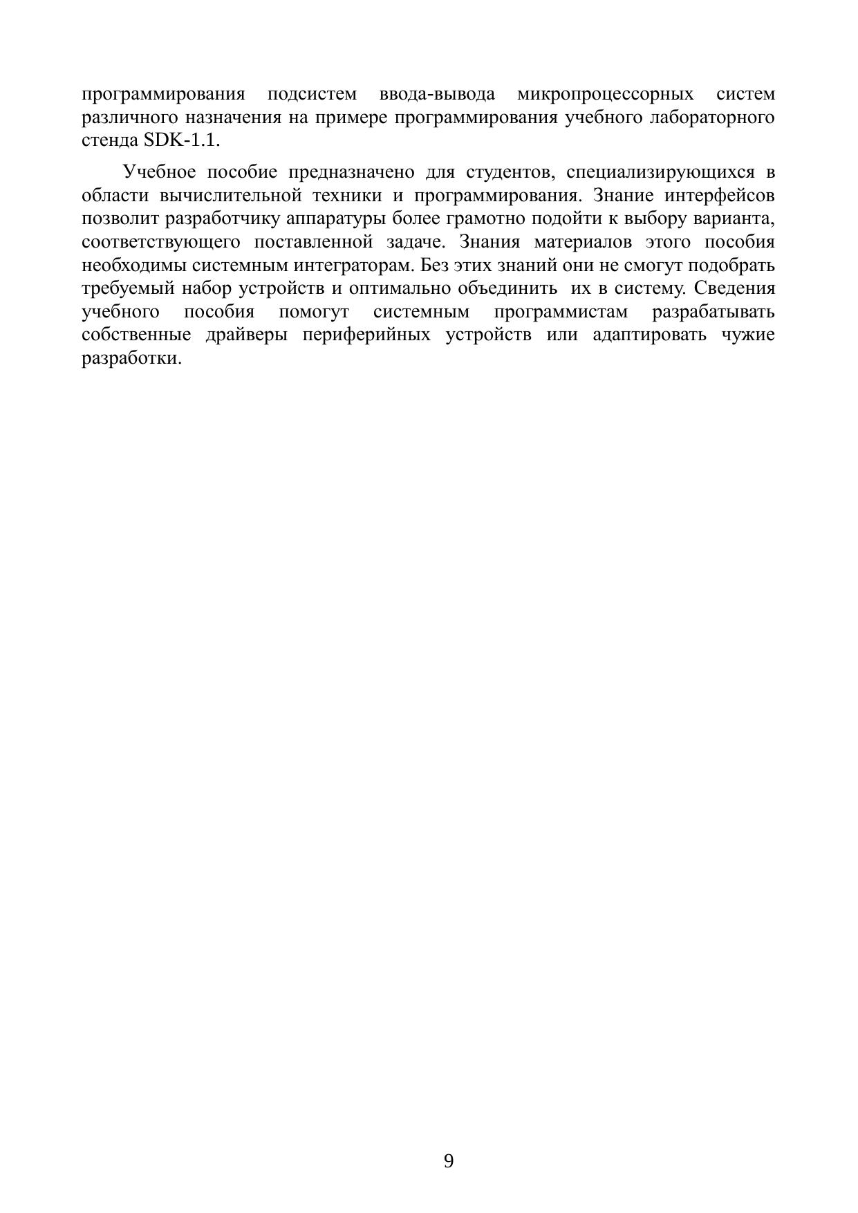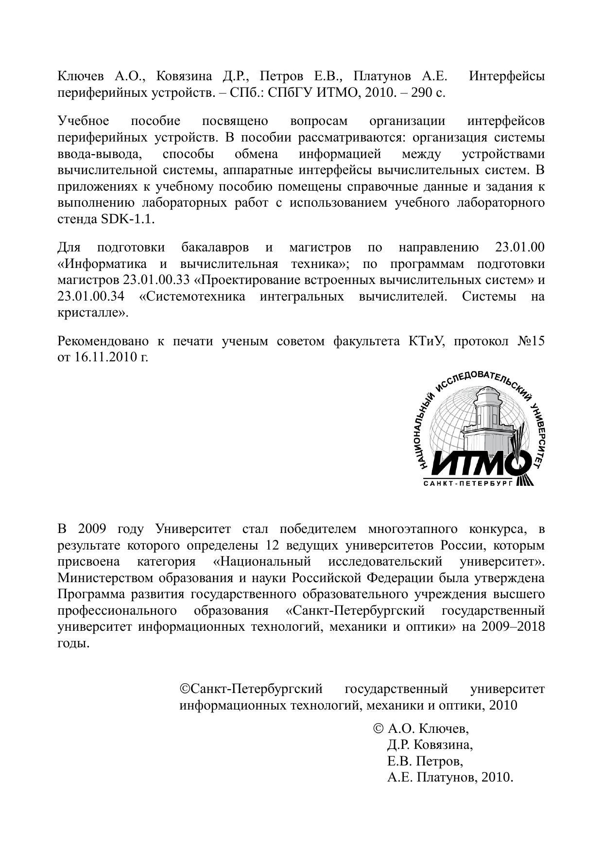 Учебное пособие посвящено вопросам организации интерфейсов периферийных устройств. В пособии рассматриваются: организация системы ввода-вывода, способы обмена информацией между устройствами вычислительной системы, аппаратные интерфейсы вычислительных систем. В приложениях к учебному пособию помещены справочные данные и задания к выполнению лабораторных работ с использованием учебного лабораторного стенда SDK-1.1.