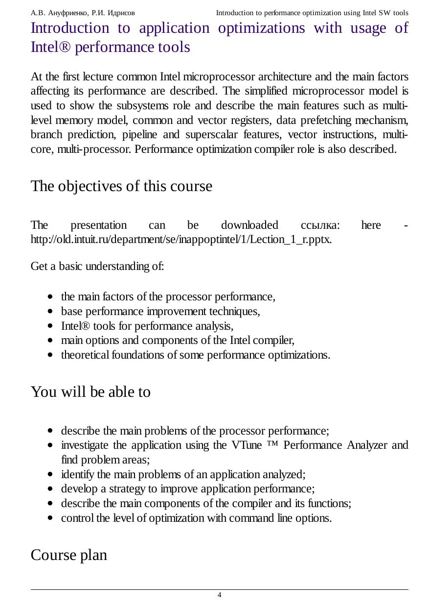 The course concentrates mostly on application performance improvements with Intel Compiler and VTune Amplifier. It briefly describes microprocessor architecture; application performance factors and