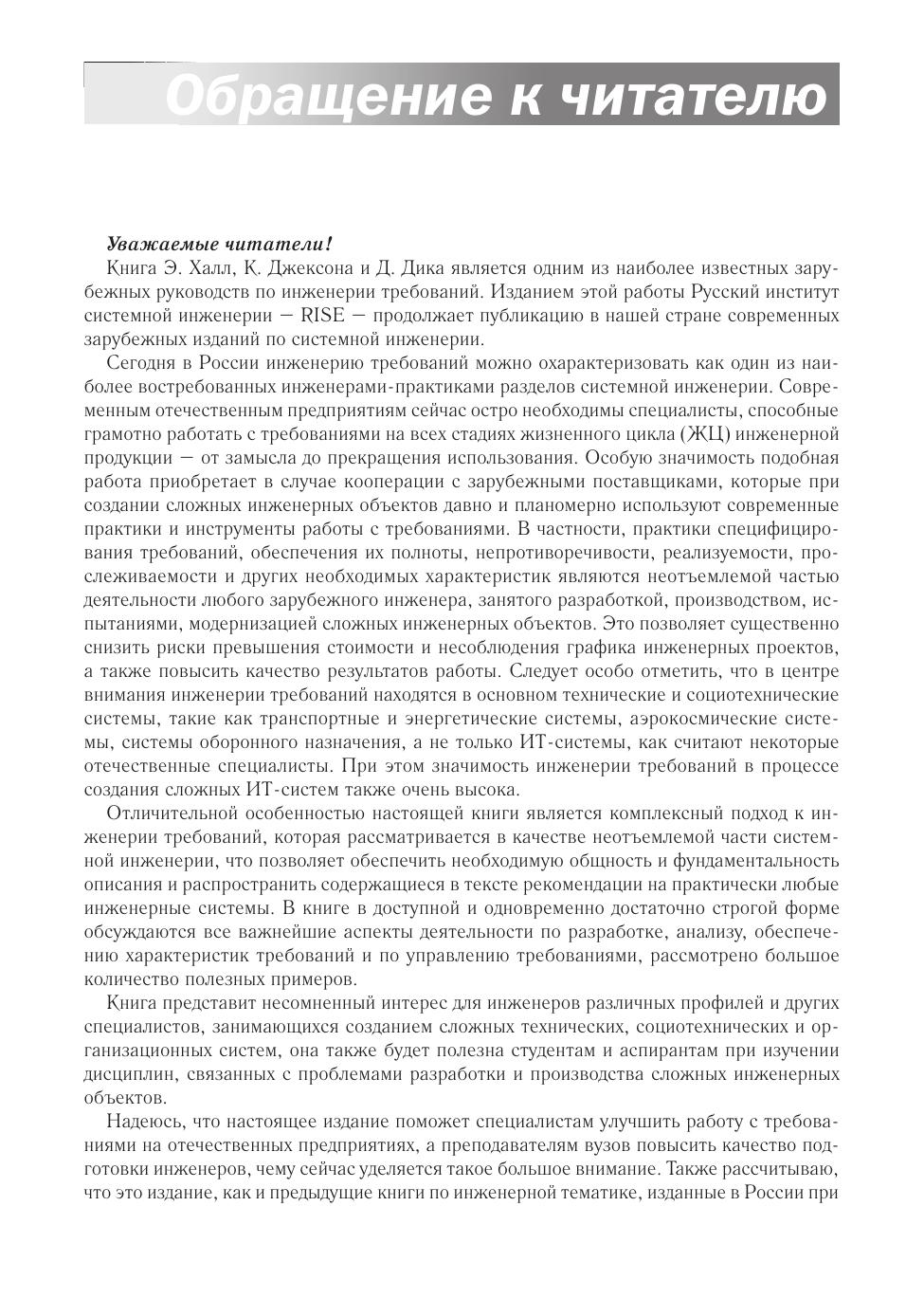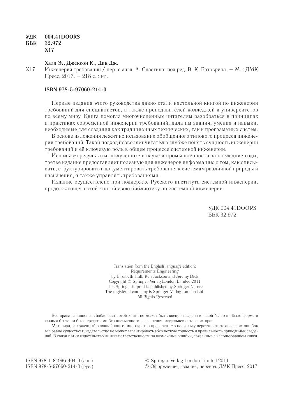 Первые издания этого руководства давно стали настольной книгой по инженерии требований для специалистов, а также преподавателей колледжей и университетов по всему миру. Книга помогла многочисленным читателям разобраться в принципах и практиках современной инженерии требований, дала им знания, умения и навыки, необходимые для создания как традиционных технических, так и программных систем. В основе изложения лежит использование обобщенного типового процесса инженерии требований. Такой подход позволяет читателю глубже понять сущность инженерии требований и её ключевую роль в общем процессе системной инженерии. Используя результаты, полученные в науке и промышленности за последние годы, третье издание предоставляет полезную для инженеров информацию о том, как описывать, структурировать и документировать требования к системам различной природы и назначения, а также управлять требованиями. Издание осуществлено при поддержке Русского института системной инженерии, продолжающего этой книгой свою библиотеку по системной инженерии.