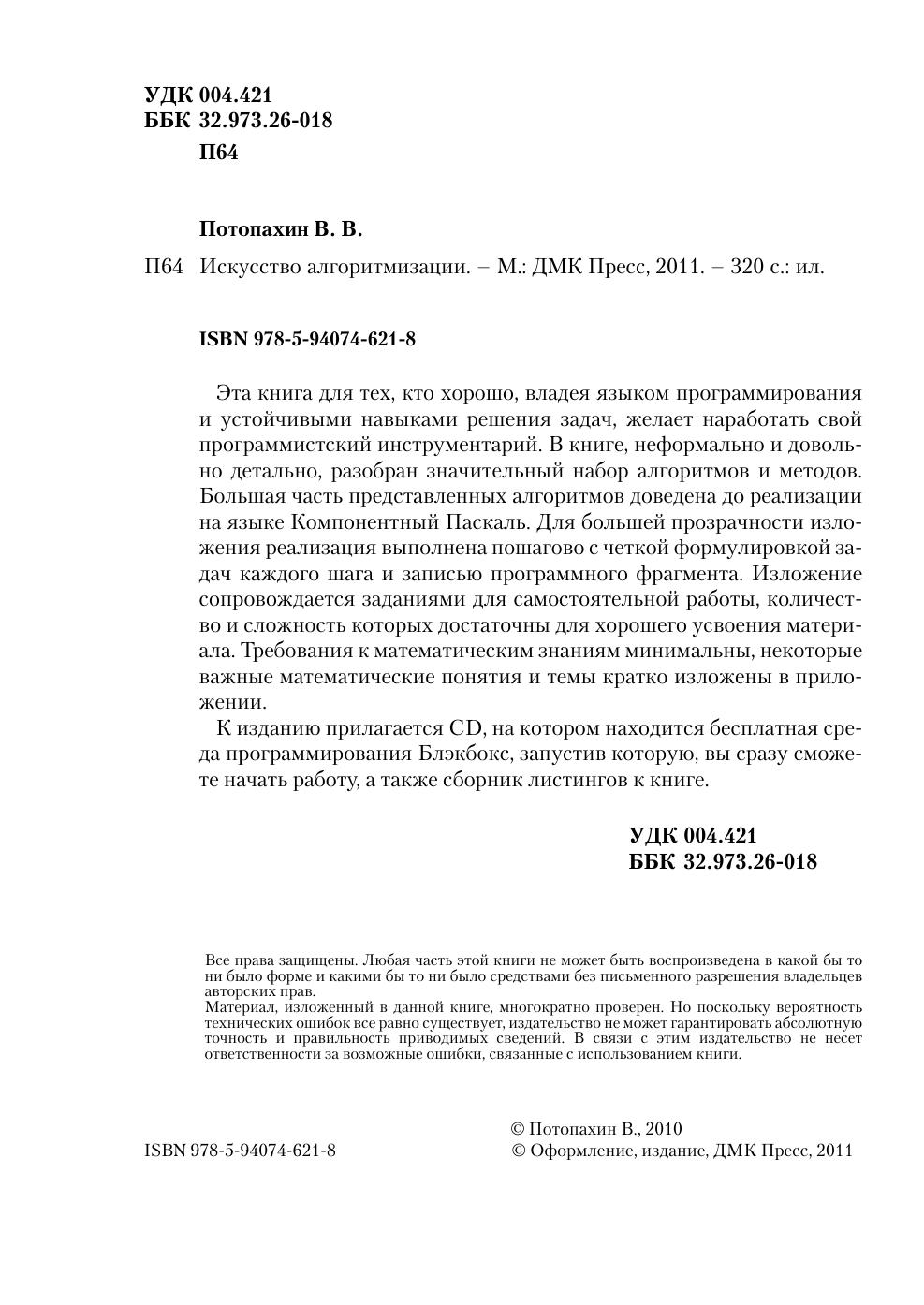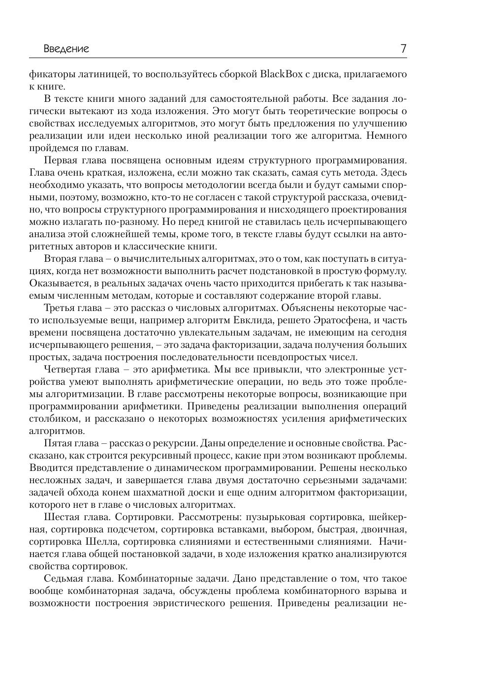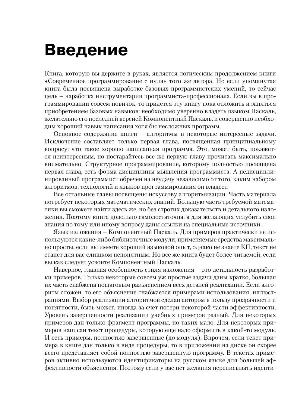 Эта книга для тех, кто хорошо, владея языком программирования и устойчивыми навыками решения задач, желает наработать свой программистский инструментарий. В книге, неформально и довольно детально, разобран значительный набор алгоритмов и методов. Большая часть представленных алгоритмов доведена до реализации на языке Компонентный Паскаль. Для большей прозрачности изложения реализация выполнена пошагово с четкой формулировкой задач каждого шага и записью программного фрагмента. Изложение сопровождается заданиями для самостоятельной работы, количество и сложность которых достаточны для хорошего усвоения материала. Требования к математическим знаниям минимальны, некоторые важные математические понятия и темы кратко изложены в приложении.
