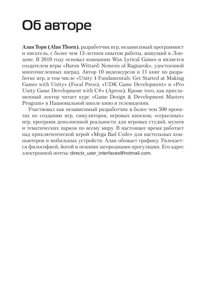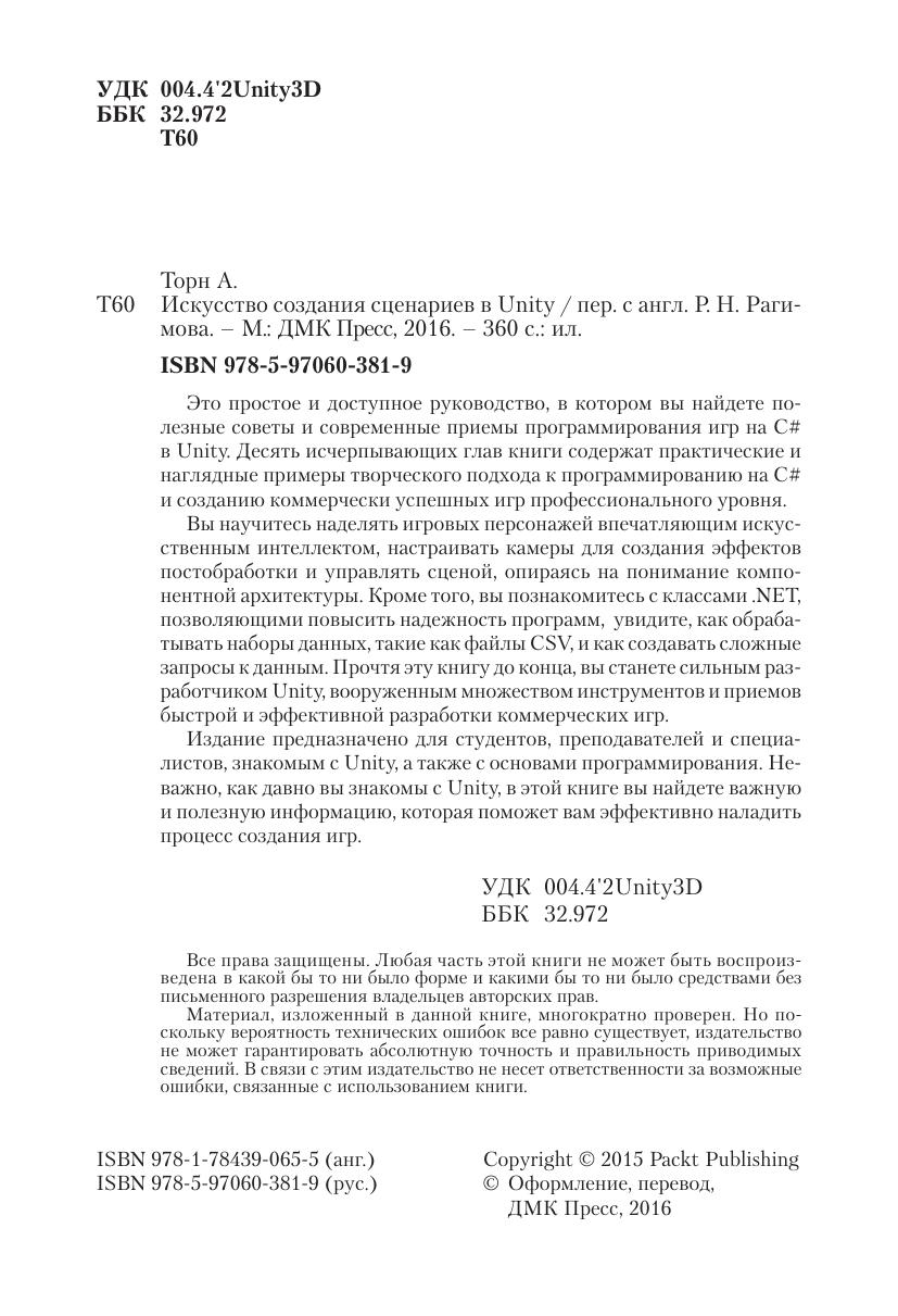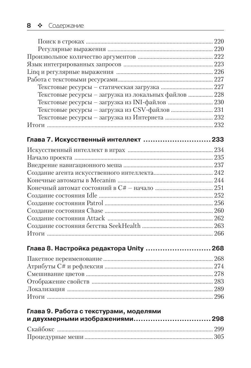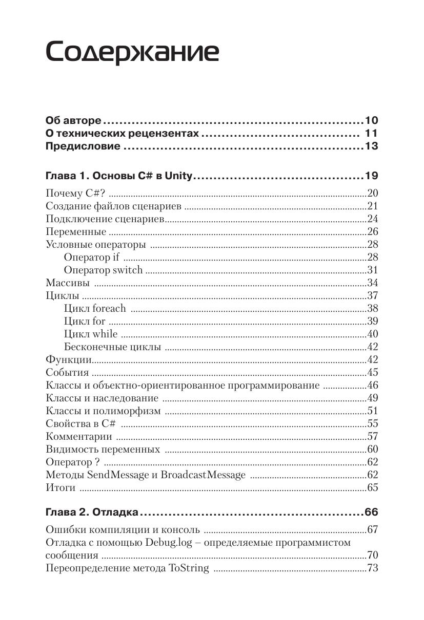 Это простое и доступное руководство, в котором вы найдете полезные советы и современные приемы программирования игр на C# в Unity. Десять исчерпывающих глав книги содержат практические и наглядные примеры творческого подхода к программированию на C# и созданию коммерчески успешных игр профессионального уровня. Вы научитесь наделять игровых персонажей впечатляющим искусственным интеллектом, настраивать камеры для создания эффектов постобработки и управлять сценой, опираясь на понимание компонентной архитектуры. Кроме того, вы познакомитесь с классами .NET, позволяющими повысить надежность программ, увидите, как обрабатывать наборы данных, такие как файлы CSV, и как создавать сложные запросы к данным. Прочтя эту книгу до конца, вы станете сильным разработчиком Unity, вооруженным множеством инструментов и приемов быстрой и эффективной разработки коммерческих игр. Издание предназначено для студентов, преподавателей и специалистов, знакомым с Unity, а также с основами программирования. Неважно, как давно вы знакомы с Unity, в этой книге вы найдете важную и полезную информацию, которая поможет вам эффективно наладить процесс создания игр.