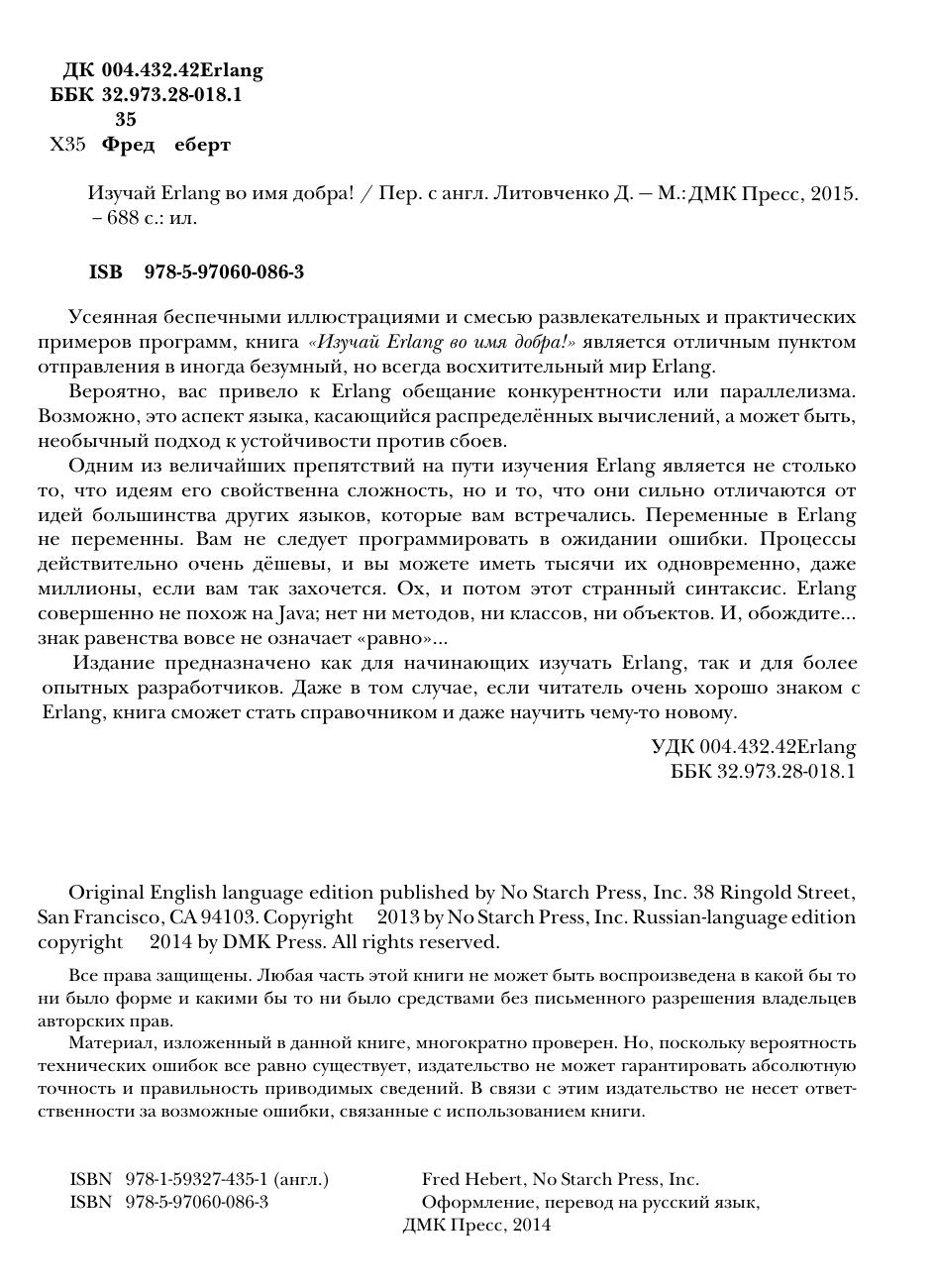 Усеянная беспечными иллюстрациями и смесью развлекательных и практических примеров программ, книга ИЗУЧАЙ ERLANG ВО ИМЯ ДОБРА! является отличным пунктом отправления в иногда безумный, но всегда восхитительный мир Erlang. Вероятно, вас привело к Erlang обещание конкурентности или параллелизма. Возможно, это аспект языка, касающийся распределённых вычислений, а может быть, необычный подход к устойчивости против сбоев. Одним из величайших препятствий на пути изучения Erlang является не столько то, что идеям его свойственна сложность, но и то, что они сильно отличаются от идей большинства других языков, которые вам встречались. Переменные в Erlang не переменны. Вам не следует программировать в ожидании ошибки. Процессы действительно очень дёшевы, и вы можете иметь тысячи их одновременно, даже миллионы, если вам так захочется. Ох, и потом этот странный синтаксис. Erlang совершенно не похож на Java, нет ни методов, ни классов, ни объектов. И, обождите... знак равенства вовсе не означает "равно"... Издание предназначено как для начинающих изучать Erlang, так и для более опытных разработчиков. Даже в том случае, если читатель очень хорошо знаком с Erlang, книга сможет стать справочником и даже научить чему-то новому.