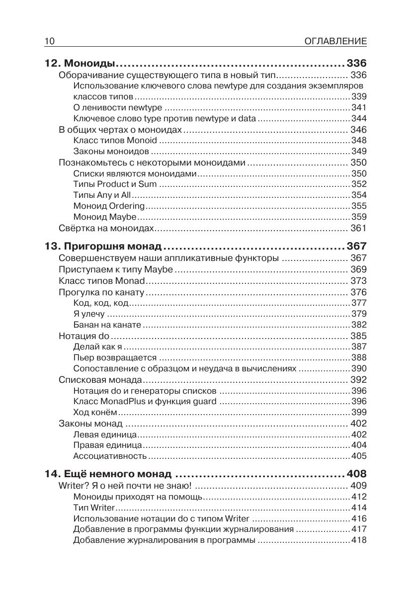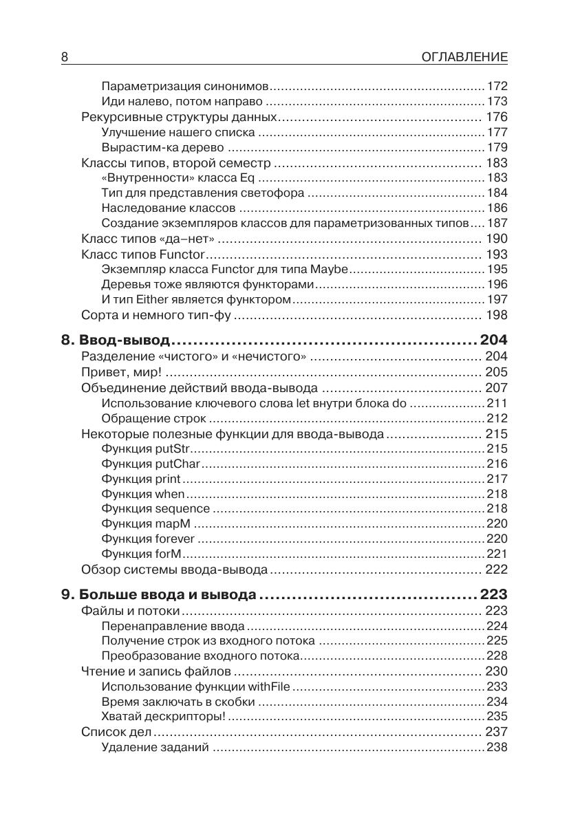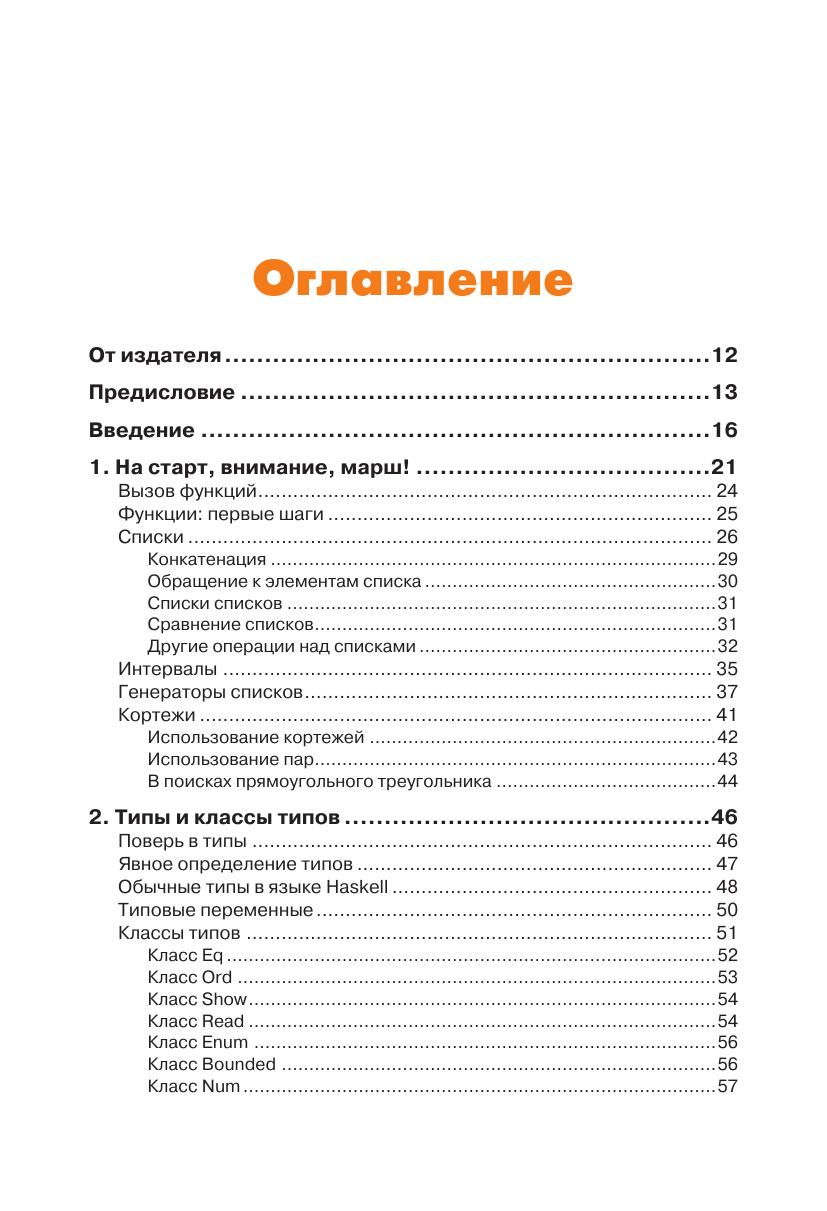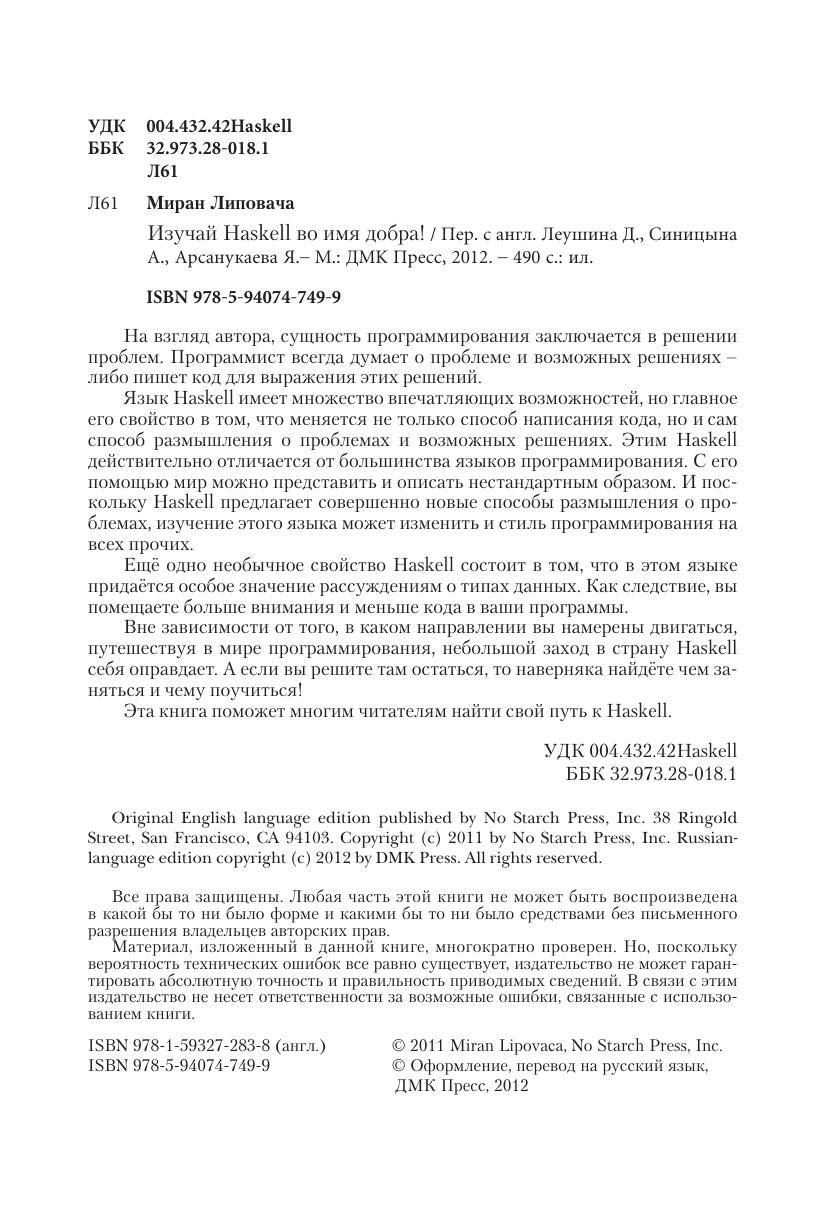 На взгляд автора, сущность программирования заключается в решении проблем. Программист всегда думает о проблеме и возможных решениях – либо пишет код для выражения этих решений. Язык Haskell имеет множество впечатляющих возможностей, но главное его свойство в том, что меняется не только способ написания кода, но и сам способ размышления о проблемах и возможных решениях. Этим Haskell действительно отличается от большинст ва языков программирования. С его помощью мир можно представить и описать нестандартным образом. И поскольку Haskell предлагает совершенно новые способы размышления о проблемах, изучение этого языка может изменить и стиль программирования на всех прочих. Ещё одно необычное свойство Haskell состоит в том, что в этом языке придаётся особое значение рассуждениям о типах данных. Как следствие, вы помещаете больше внимания и меньше кода в ваши программы. Вне зависимости от того, в каком направлении вы намерены двигаться, путешествуя в мире программирования, небольшой заход в страну Haskell себя оправдает. А если вы решите там остаться, то наверняка найдёте чем заняться и чему поучиться! Эта книга поможет многим читателям найти свой путь к Haskell.