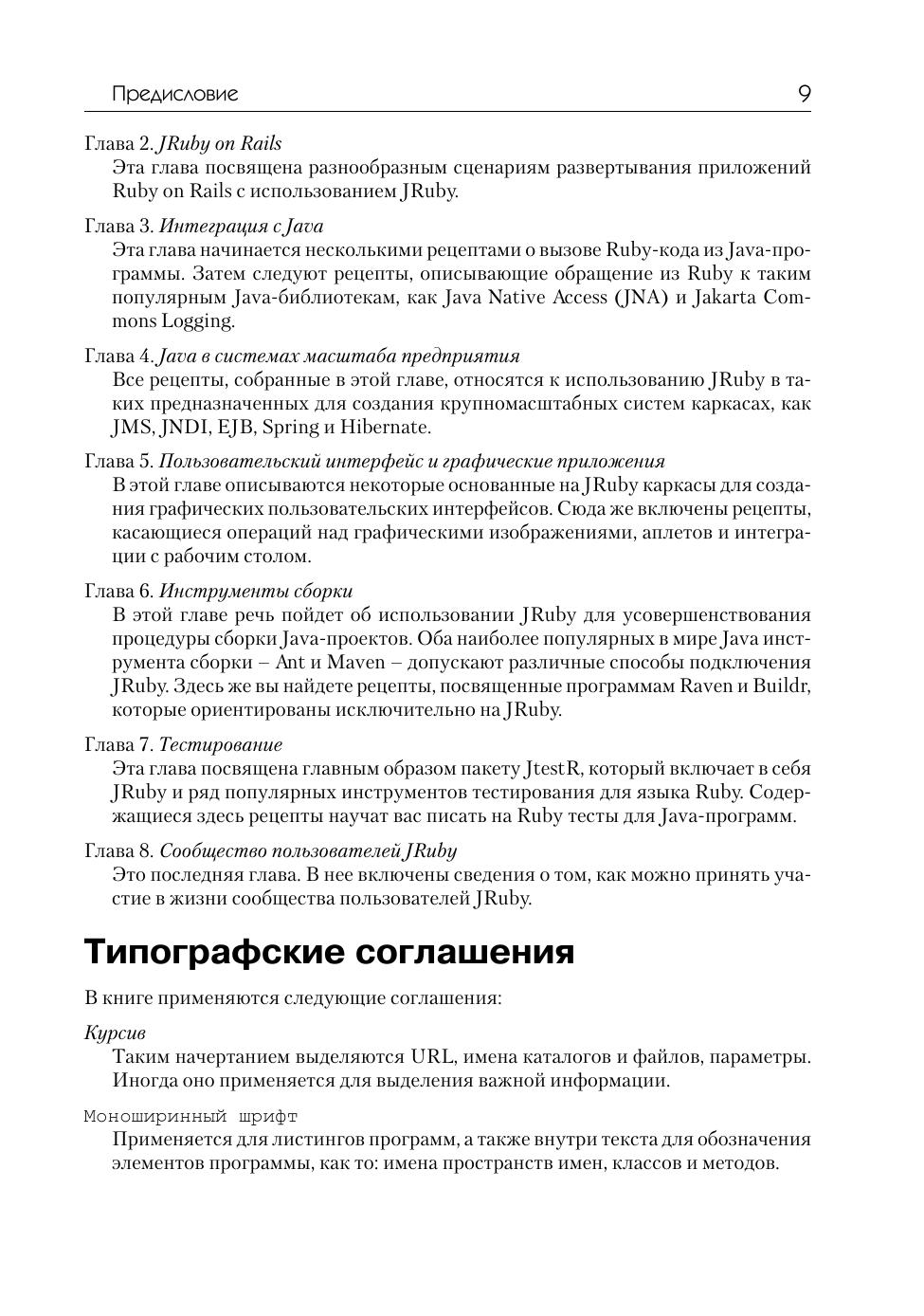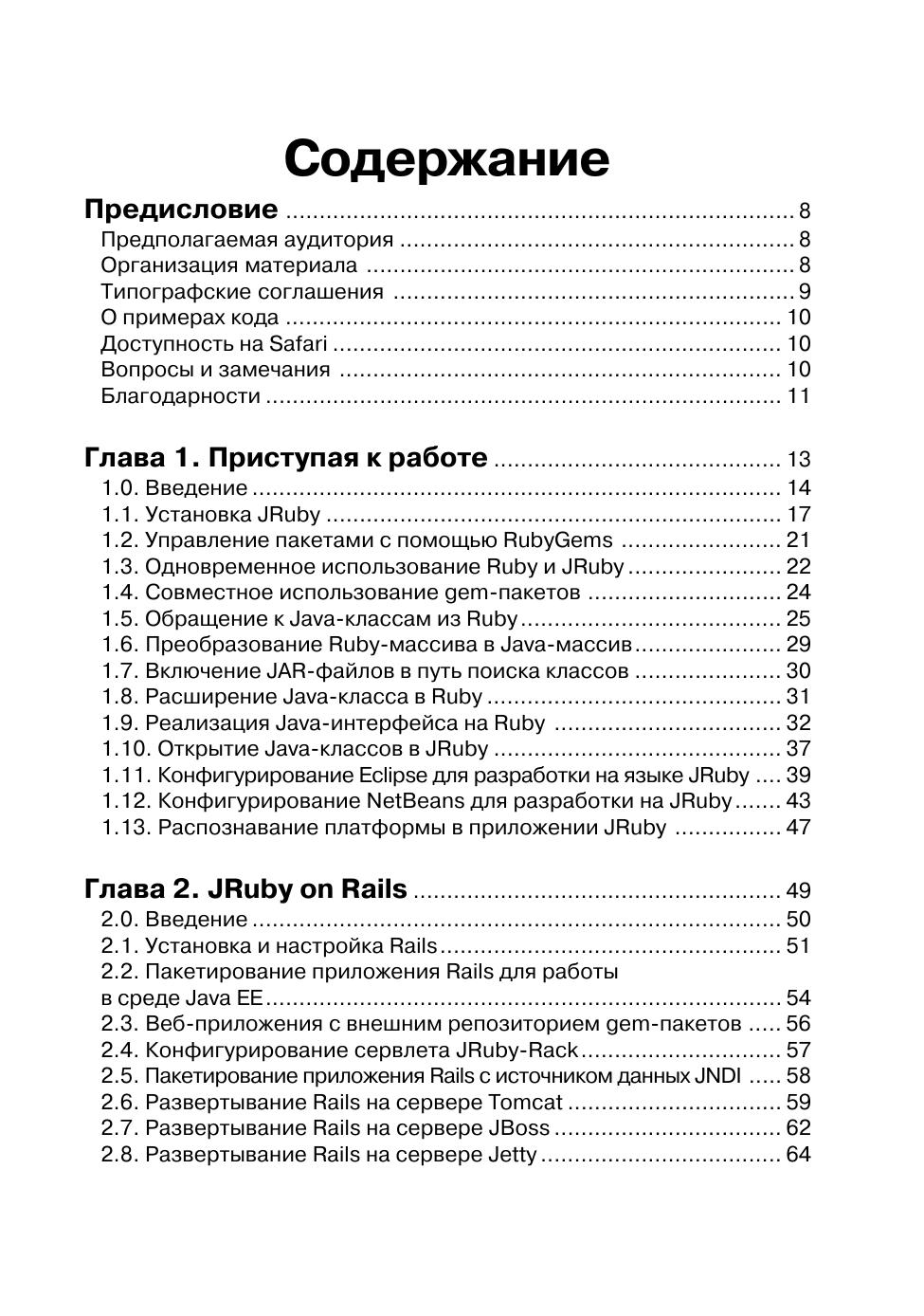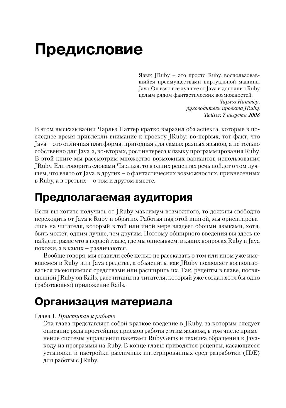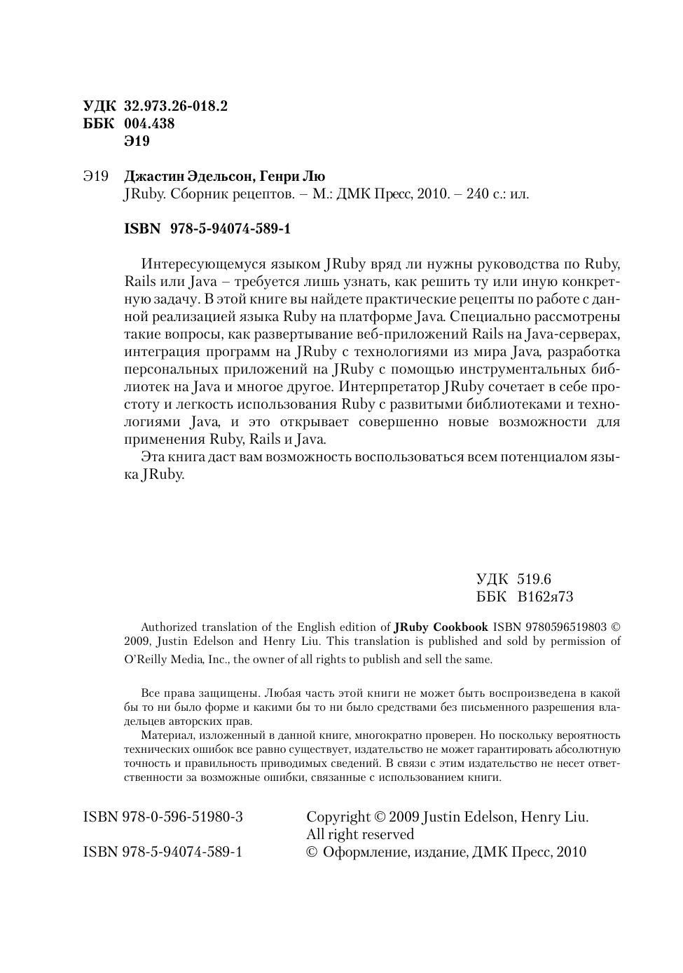 Интересующемуся языком JRuby вряд ли нужны руководства по Ruby, Rails или Java – требуется лишь узнать, как решить ту или иную конкретную задачу. В этой книге вы найдете практические рецепты по работе с данной реализацией языка Ruby на платформе Java. Специально рассмотрены такие вопросы, как развертывание веб-приложений Rails на Java-серверах, интеграция программ на JRuby с технологиями из мира Java, разработка персональных приложений на JRuby с помощью инструментальных библиотек на Java и многое другое. Интерпретатор JRuby сочетает в себе простоту и легкость использования Ruby с развитыми библиотеками и технологиями Java, и это открывает совершенно новые возможности для применения Ruby, Rails и Java. Эта книга даст вам возможность воспользоваться всем потенциалом языка Jruby.