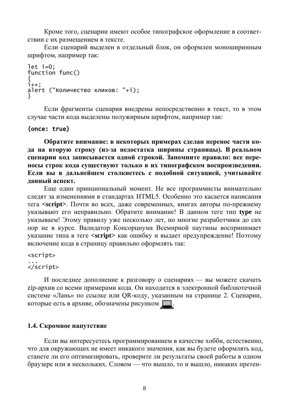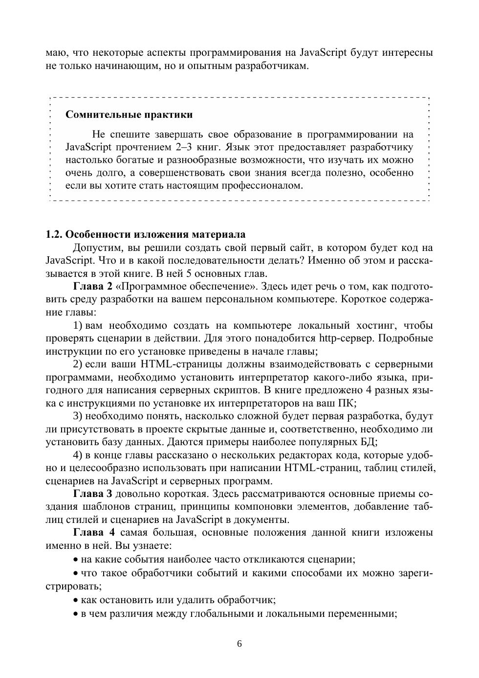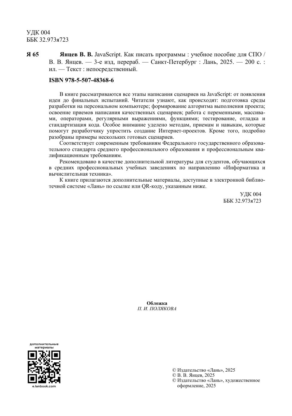 В книге рассматриваются все этапы написания сценариев на JavaScript: от появления идеи до финальных испытаний. Читатели узнают, как происходят: подготовка среды разработки на персональном компьютере, формирование алгоритма выполнения проекта, освоение приемов написания качественных сценариев, работа с переменными, массивами, операторами, регулярными выражениями, функциями, тестирование, отладка и стандартизация кода. Особое внимание уделено методам, приемам и навыкам, которые помогут разработчику упростить создание Интернет-проектов. Кроме того, подробно разобраны примеры нескольких готовых сценариев. Соответствует современным требованиям Федерального государственного образовательного стандарта среднего профессионального образования и профессиональным квалификационным требованиям. Рекомендовано в качестве дополнительной литературы для студентов, обучающихся в средних профессиональных учебных заведениях по направлению «Информатика и вычислительная техника». К книге прилагаются дополнительные материалы, доступные в электронной библиотечной системе «Лань» по ссылке или QR-коду, указанным ниже.