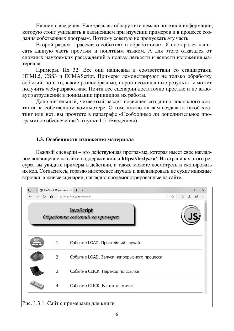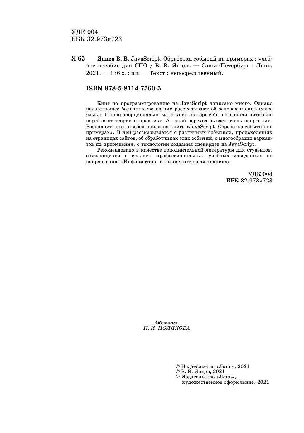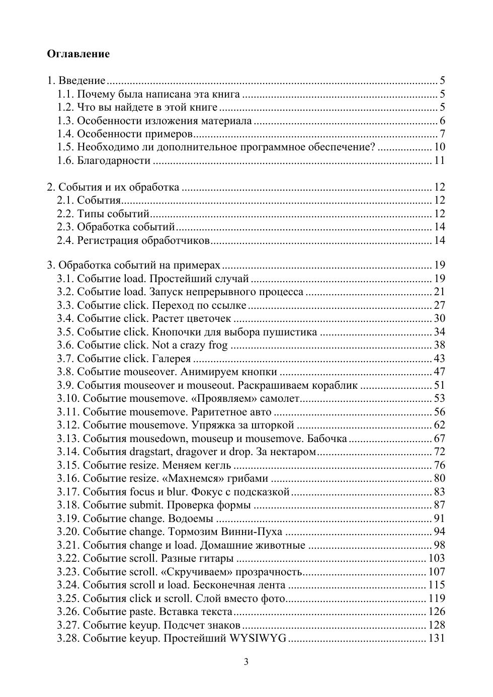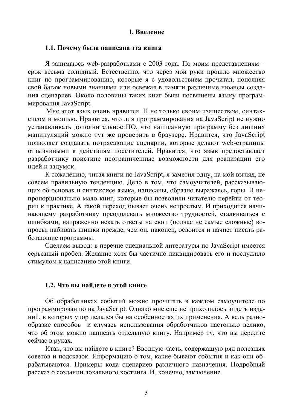 Книг по программированию на JavaScript написано много. Однако подавляющее большинство из них рассказывают об основах и синтаксисе языка. И непропорционально мало книг, которые бы позволили читателю перейти от теории к практике. А такой переход бывает очень непростым. Восполнить этот пробел призвана книга «JavaScript. Обработка событий на примерах». В ней рассказывается о различных событиях, происходящих на страницах сайтов, об обработчиках этих событий, о многообразии вариантов их применения, о технологии создания сценариев на JavaScript.