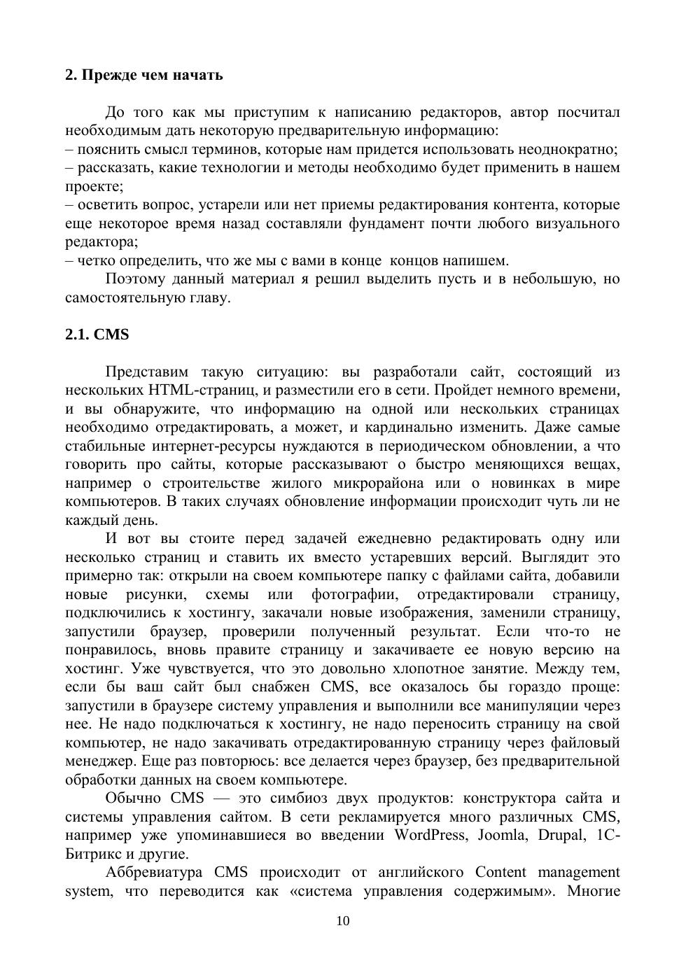 Подавляющее большинство ныне действующих сайтов сделано при помощи CMS. А такие системы невозможно представить без визуальных редакторов страниц. WYSIWYG редакторы позволяют администратору управлять содержимым ресурса, не будучи знакомым даже с азами про-граммирования. Многие разработчики используют не готовые CMS, а пишут собст-венные. Данная книга призвана помочь им в этом непростом деле. На ее страницах описаны четыре WYSIWYG редактора – на разный вкус и для разных задач. Все системы являются оригинальными и не содержат каких-либо заимствований кода. Функциональные возможности приведенных разработок имеют исчерпывающие описания и разъяснения. Разобранные в книге визуальные редакторы могут быть интегрированы в уже существующую CMS или работать напрямую с сайтом без сопут-ствующих инструментов. Особо надо отметить, что эти редакторы позволяют администратору сайта видеть, как будет выглядеть страница еще до того, как он запишет внесенные изменения в файл или базу данных. Книга имеет сайт поддержки, где читатель может ознакомиться с редакторами и опробовать их в действии. Кроме того, вы можете скачать zip-архив со всеми файлами и запустить их на своем компьютере. Для этого книга содержит подробные инструкции по созданию локального хостинга на ПК. Рекомендовано в качестве дополнительной литературы для студентов вузов, обучающихся по направлению «Информатика и вычислительная техника».